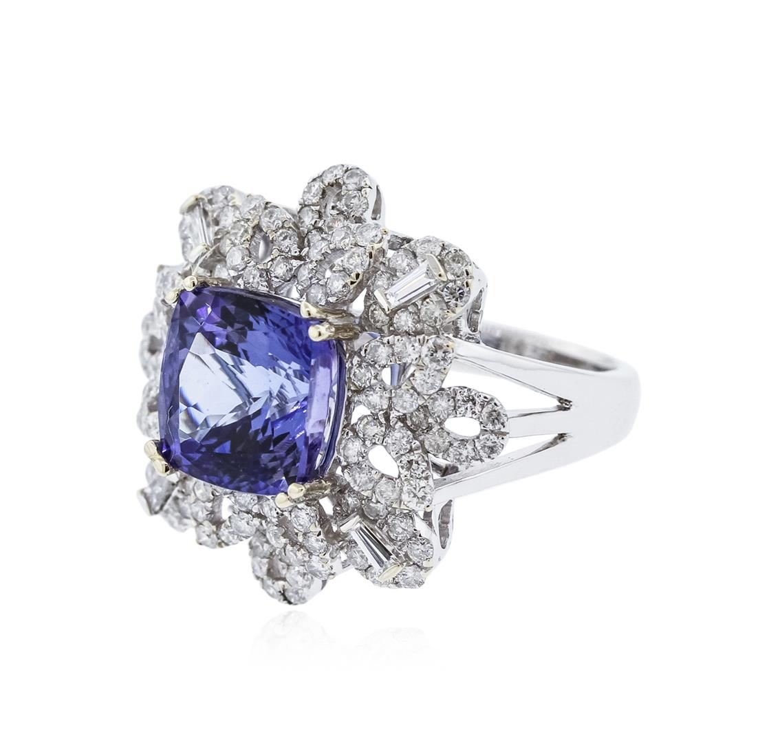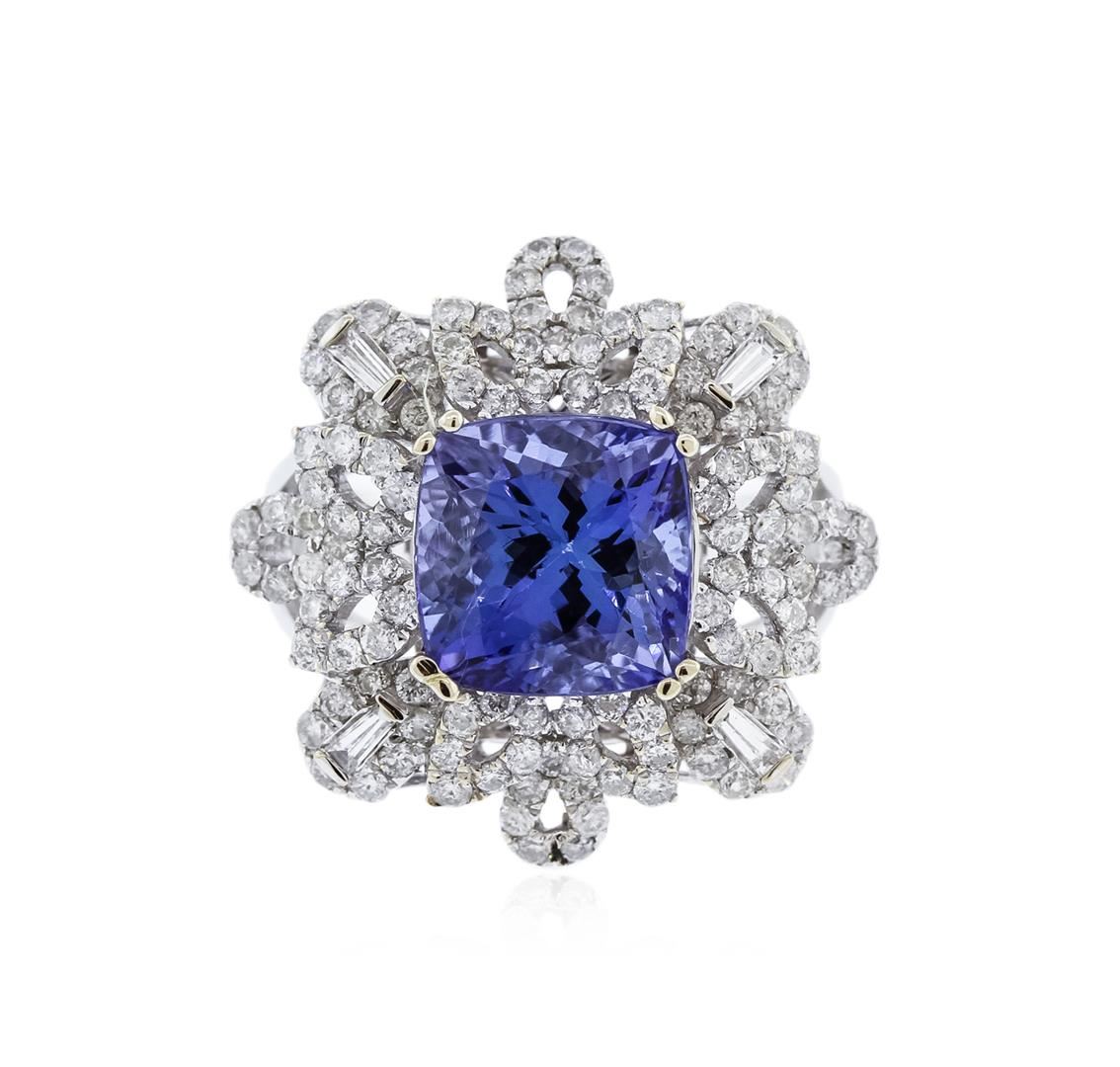 One electronically tested 18KT white gold ladies cast tanzanite and diamond ring with a split shank with a bright polish finish. Trademark is Orianne. Identified with markings of "18K". Condition is new. Containing: One prong set square cushion modified brilliant cut natural tanzanite, measuring 9.67 x 9.58 x 7.68mm, approximate weight of 5.60ct., clarity is eye clean, type I, medium light, very slightly grayish, violet color, (GIA V 4/3), cut is good. One Hundred Sixty-Seven prong set round brilliant cut diamonds, measuring 1.10 - 1.10 x 0.66mm (depth est.) approximate total weight of 167 Stones = 0.80ct. Clarity: I-1 to I-2. Color: I - J. Four prong set baguette cut diamonds, measuring 2.00 x 1.20 x 1.02mm (depth est.) approximate total weight of 4 Stones = 0.09ct. Clarity: SI-1. Color: I - J. All diamonds and colored gemstones are graded in the mounting, unless otherwise stated. Colored gemstones are presumed to have been subjected to commonly used enhancement processes. Total Weight of Colored Stones 5.60ct. Total Weight of Diamonds 0.89ct. Total Weight of Ring 8.00 grams. GGL Appraised at $7,120.00.
