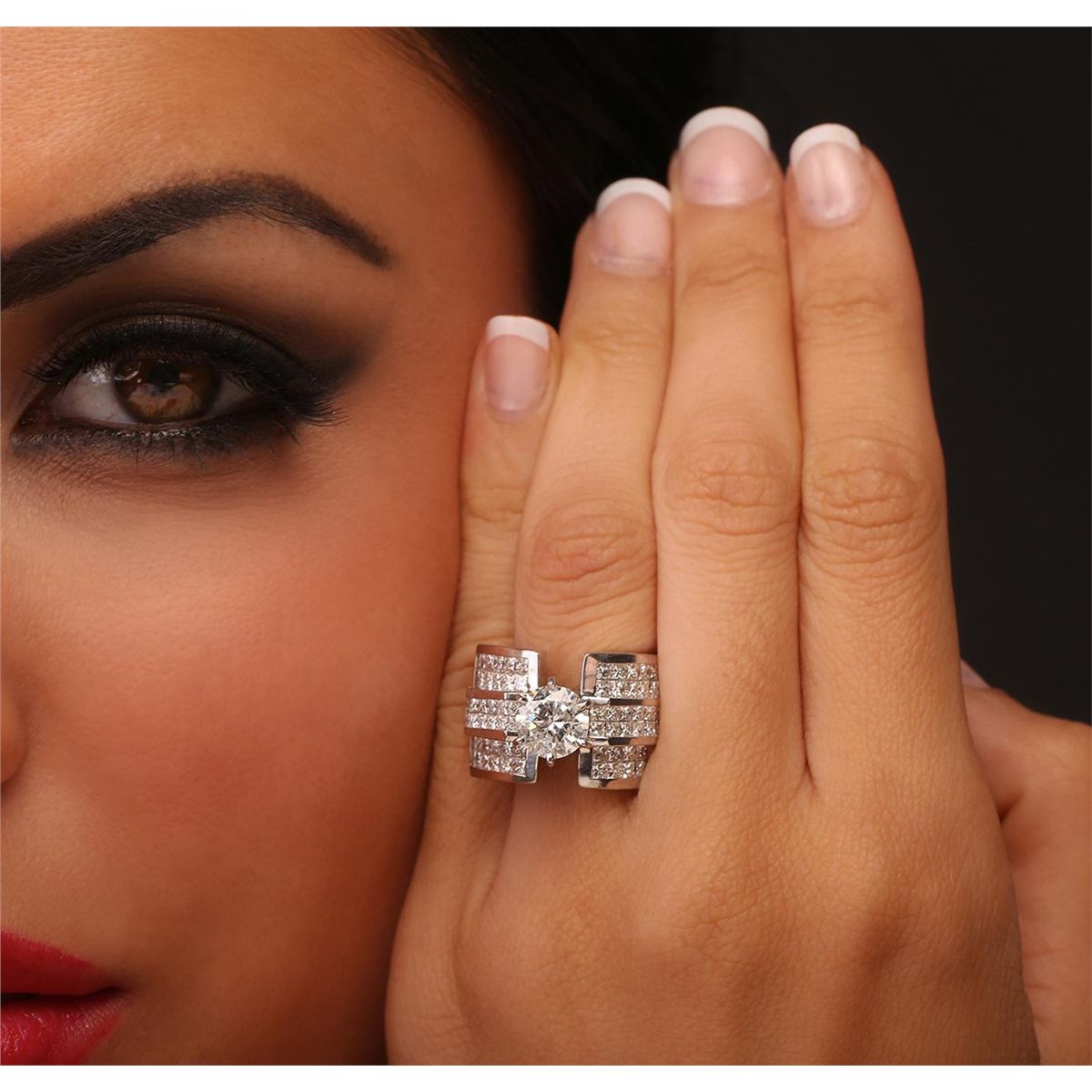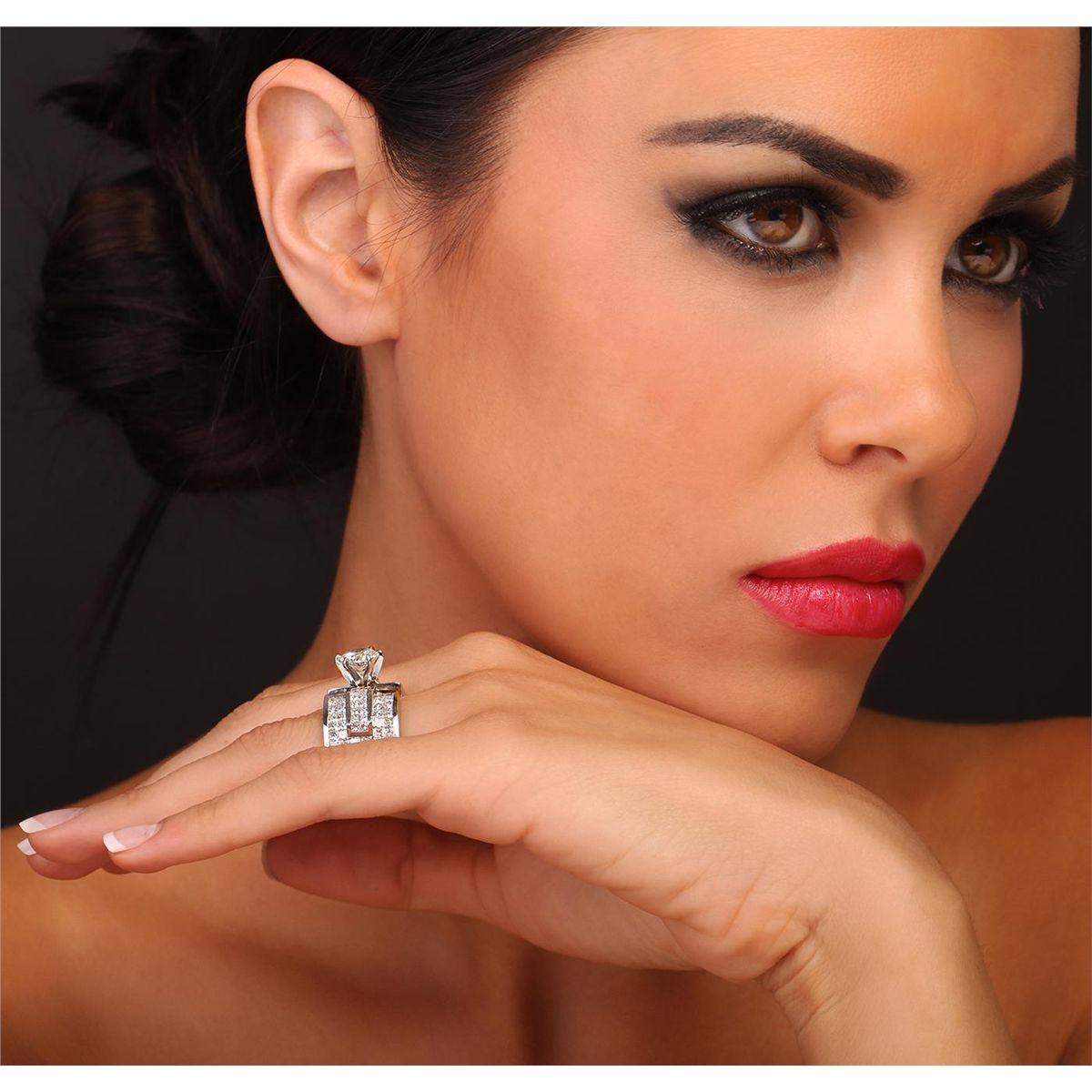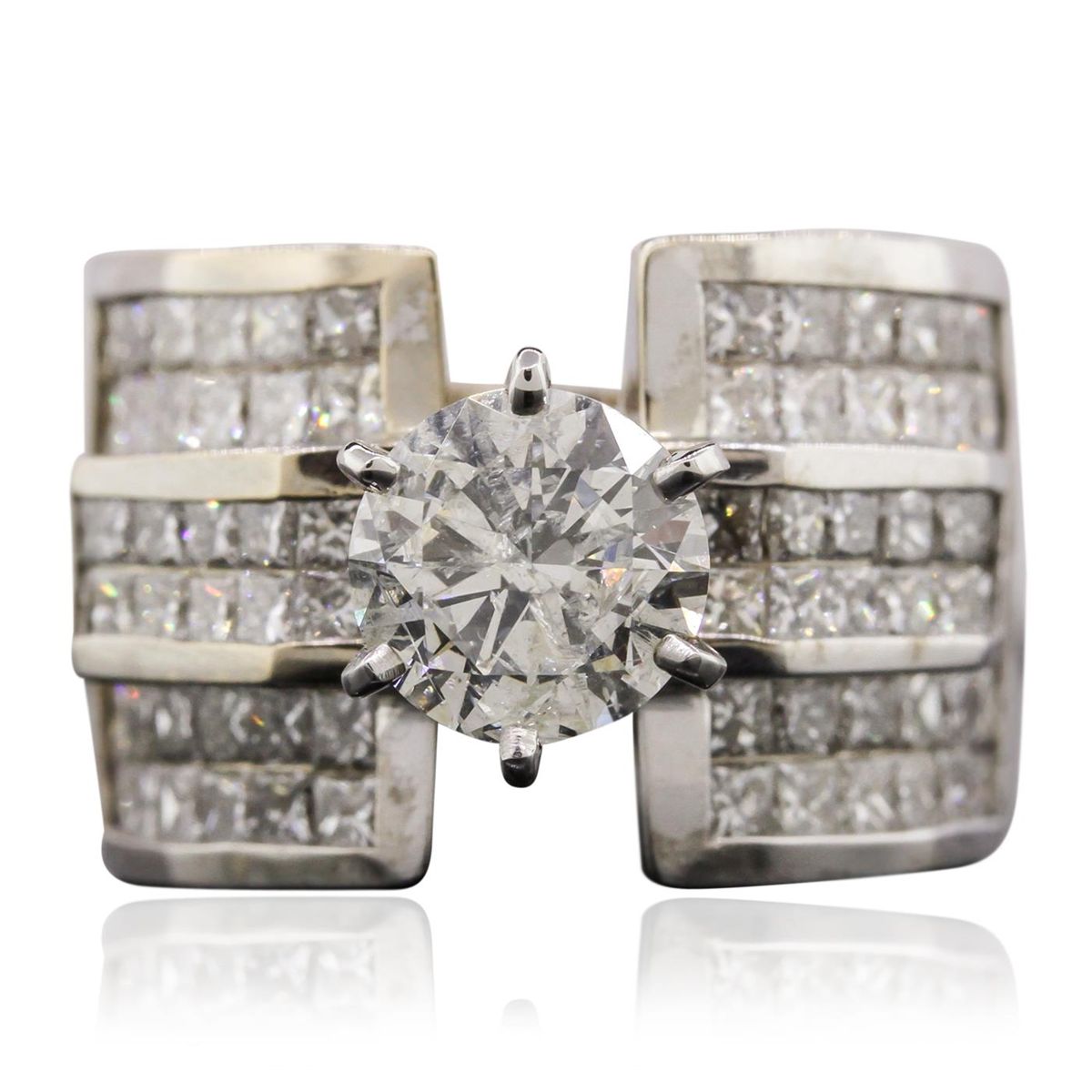 One electronically tested 18KT white gold Ladies combination cast & assembled engagement ring with a bright polish finish. Condition is new. Identified with markings of "18K". Containing: One prong set round brilliant cut diamond, measuring 8.20 - 8.10 x 5.47mm (depth est.) approximate weight of 2.22ct. Clarity: I-1. Color: J, Cut is Good. Fifty-Two invisible set princess cut diamonds, measuring 2.00 x 2.00 x 1.50mm (depth est.) approximate. Total Weight of 52 Stones = 2.56ct. Clarity: SI-2. Color: J, Cut is Good. Twenty-Four invisible set princess cut diamonds, measuring 1.80 x 1.80 x 1.35mm (depth est.) approximate. Total Weight of 24 Stones = 0.86ct. Clarity: SI-2 to I-1. Color: J - K, Cut is Good. Total Weight of Diamonds 5.63ct. Total Weight of Engagement Ring 26.50 grams. GGL Appraised at $45,490.00.