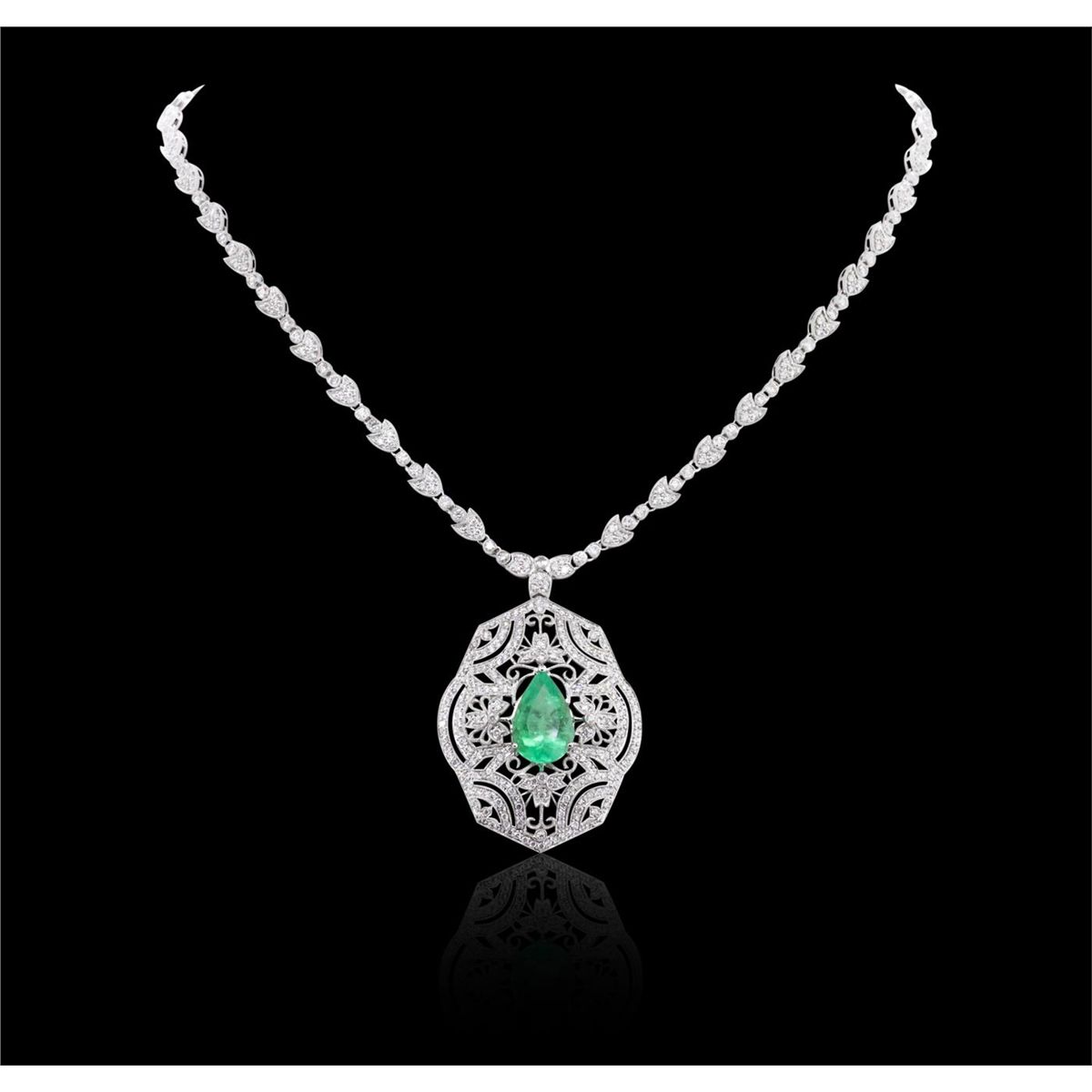 One necklace featuring: 18KT white gold weighing 32.12 grams containing one emerald with a total weight of 5.64ct and 422 round cut diamonds with a total weight of 5.01cts.