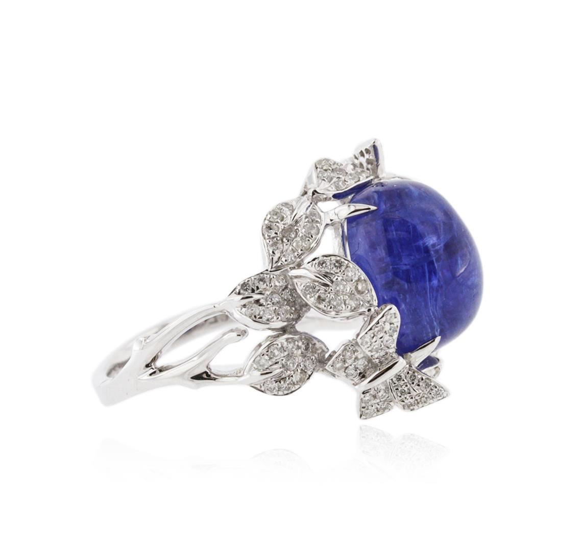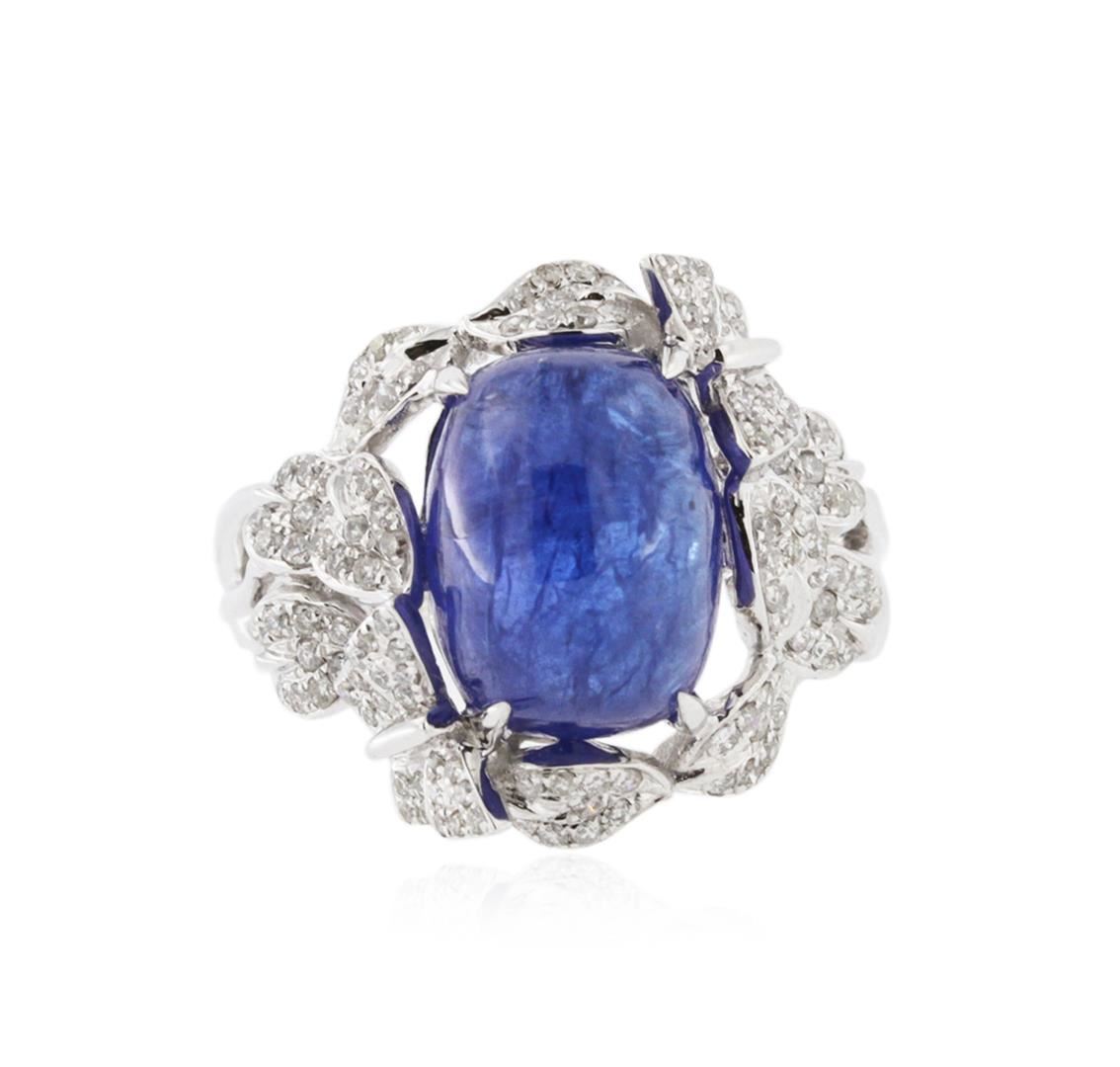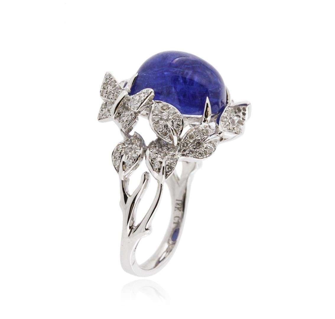 One ring featuring: 18KT white gold weighing 5.13 grams containing one tanzanite with a total weight of 5.68ct and 134 round diamonds with a total weight of 0.46ct.