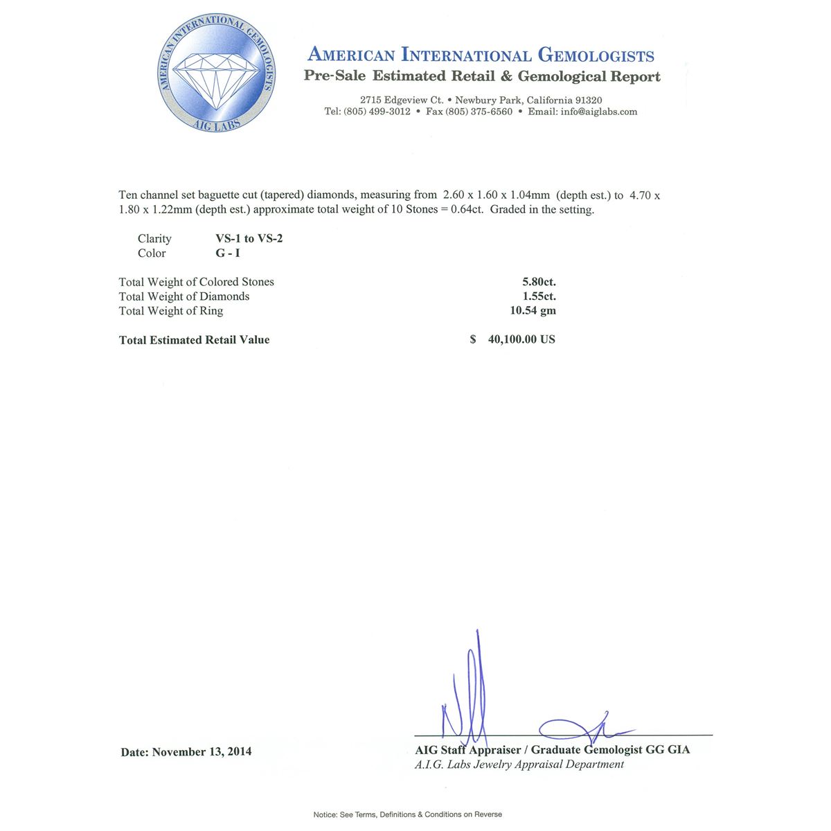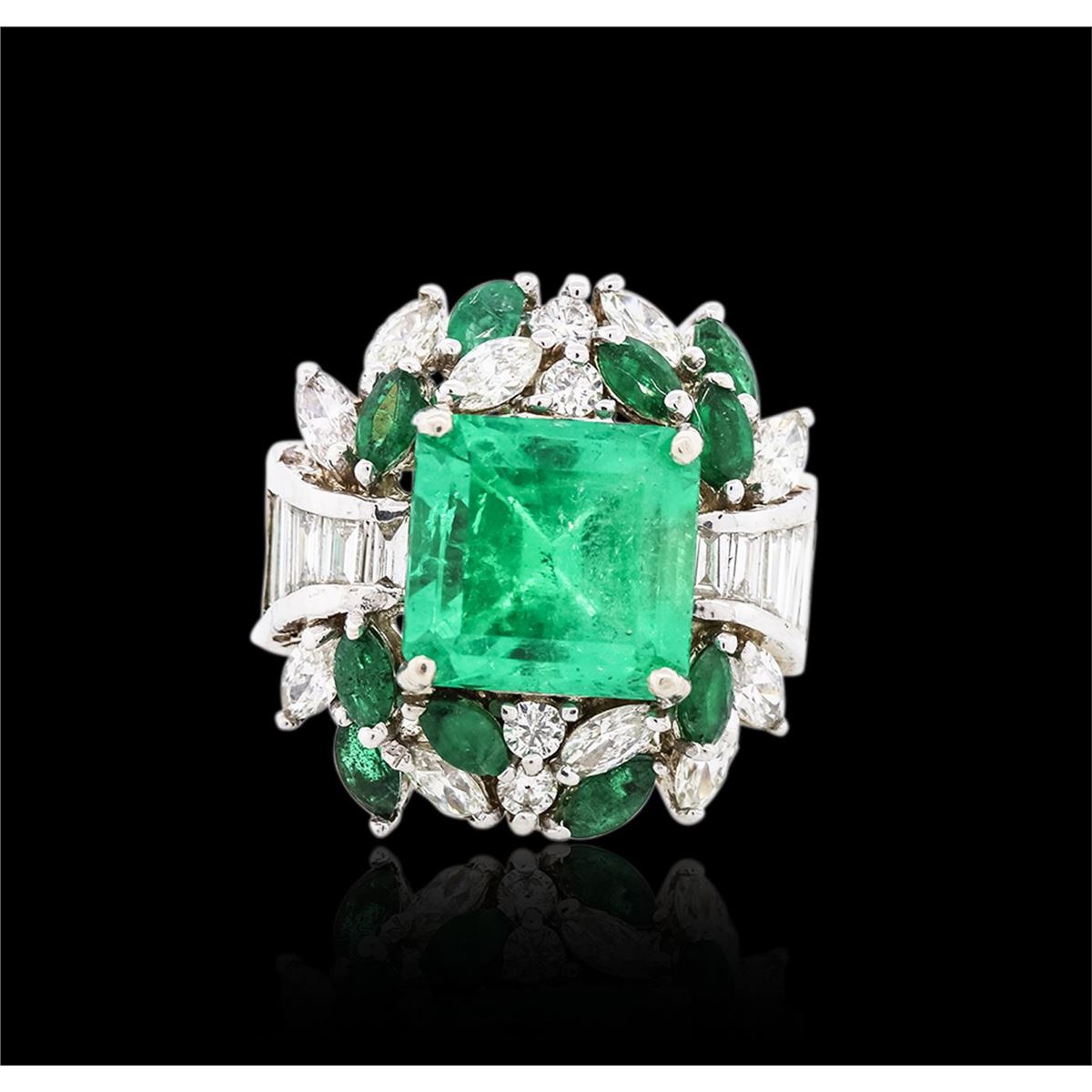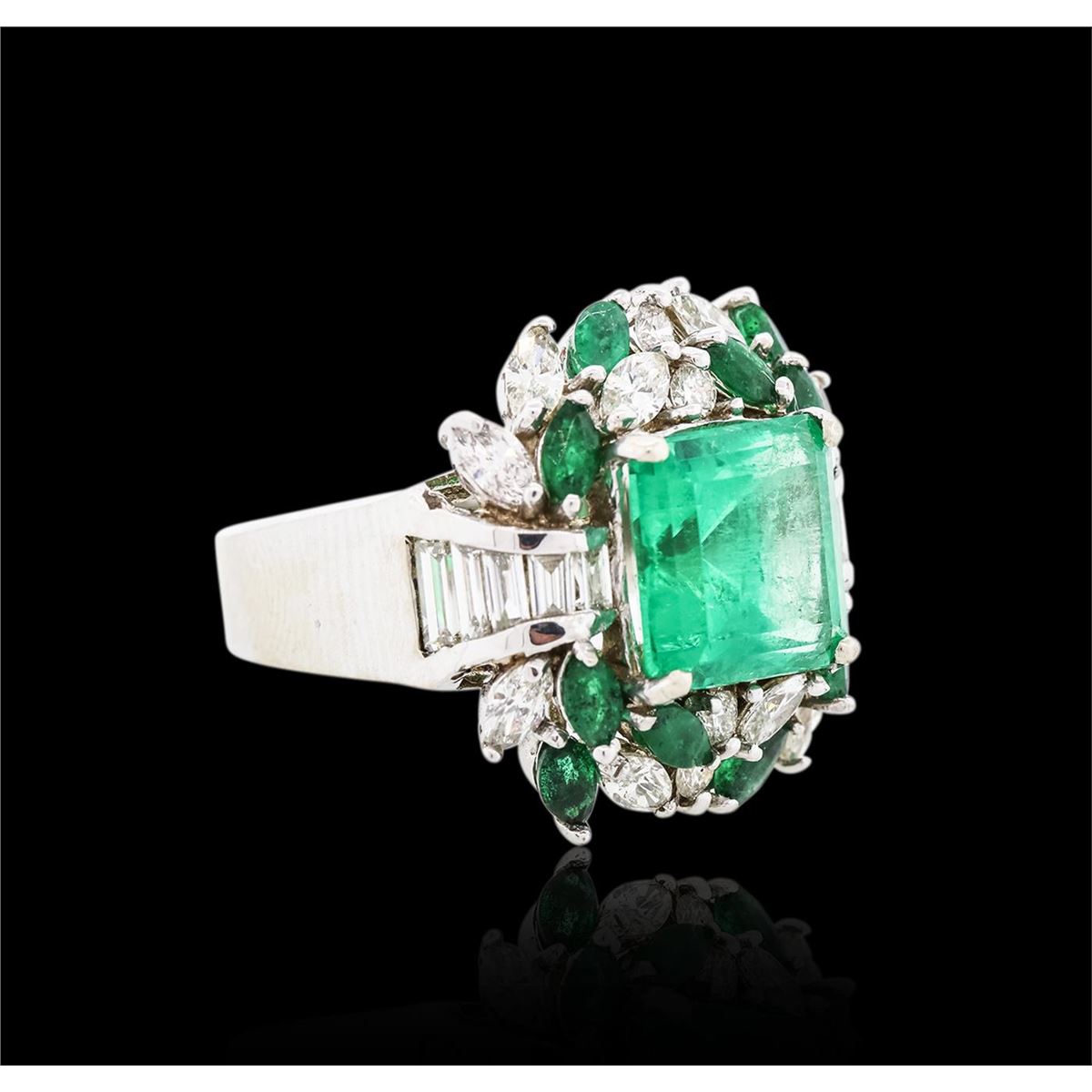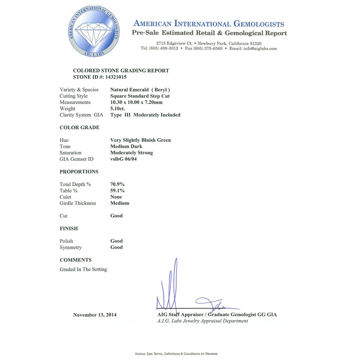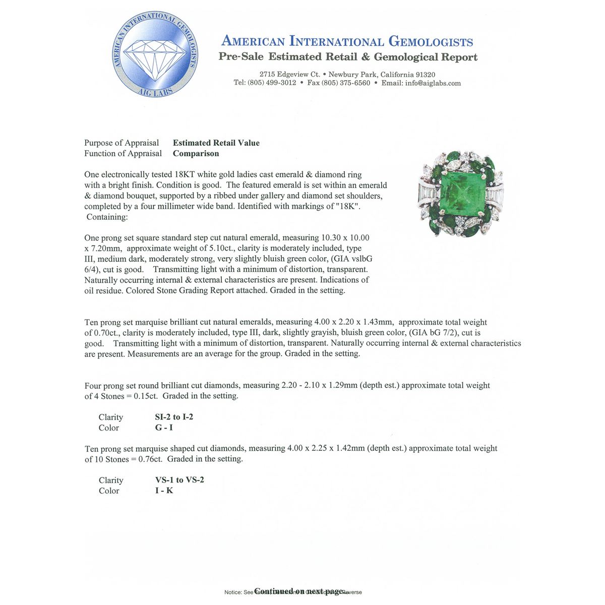 One electronically tested 18KT white gold ladies cast emerald & diamond ring with a bright finish.  The featured emerald is set within an emerald & diamond bouquet, supported by a ribbed under gallery and diamond set shoulders, completed by a four millimeter wide band. Identified with markings of "18K". Condition is good. Containing: One prong set square standard step cut natural emerald, measuring 10.30 x 10.00 x 7.20mm,  approximate weight of 5.10ct., clarity is moderately included, type III, medium dark, moderately strong, very slightly bluish green color, (GIA vslbG 6/4), cut is good.    Transmitting light with a minimum of distortion, transparent. Naturally occurring internal & external characteristics are present. Indications of oil residue. Colored Stone Grading Report attached. Graded in the setting. Ten prong set marquise brilliant cut natural emeralds, measuring 4.00 x 2.20 x 1.43mm,  approximate total weight of 0.70ct., clarity is moderately included, type III, dark, slightly grayish, bluish green color, (GIA bG 7/2), cut is good. Transmitting light with a minimum of distortion, transparent. Naturally occurring internal & external characteristics are present. Measurements are an average for the group. Graded in the setting. Four prong set round brilliant cut diamonds, measuring 2.20 - 2.10 x 1.29mm (depth est.) approximate total weight of 4 Stones = 0.15ct.  Graded in the setting. Clarity SI-2 to I-2. Color G - I. Ten prong set marquise shaped cut diamonds, measuring 4.00 x 2.25 x 1.42mm (depth est.) approximate total weight of 10 Stones = 0.76ct.  Graded in the setting. Clarity VS-1 to VS-2. Color I - K. Ten channel set baguette cut (tapered) diamonds, measuring from  2.60 x 1.60 x 1.04mm  (depth est.) to  4.70 x 1.80 x 1.22mm (depth est.) approximate total weight of 10 Stones = 0.64ct.  Graded in the setting. Clarity VS-1 to VS-2. Color G - I. Total Weight of Colored Stones 5.80ct. Total Weight of Diamonds 1.55ct. Total Weight of Ring 10.54 grams. AIG Appraised at $40,100.00.