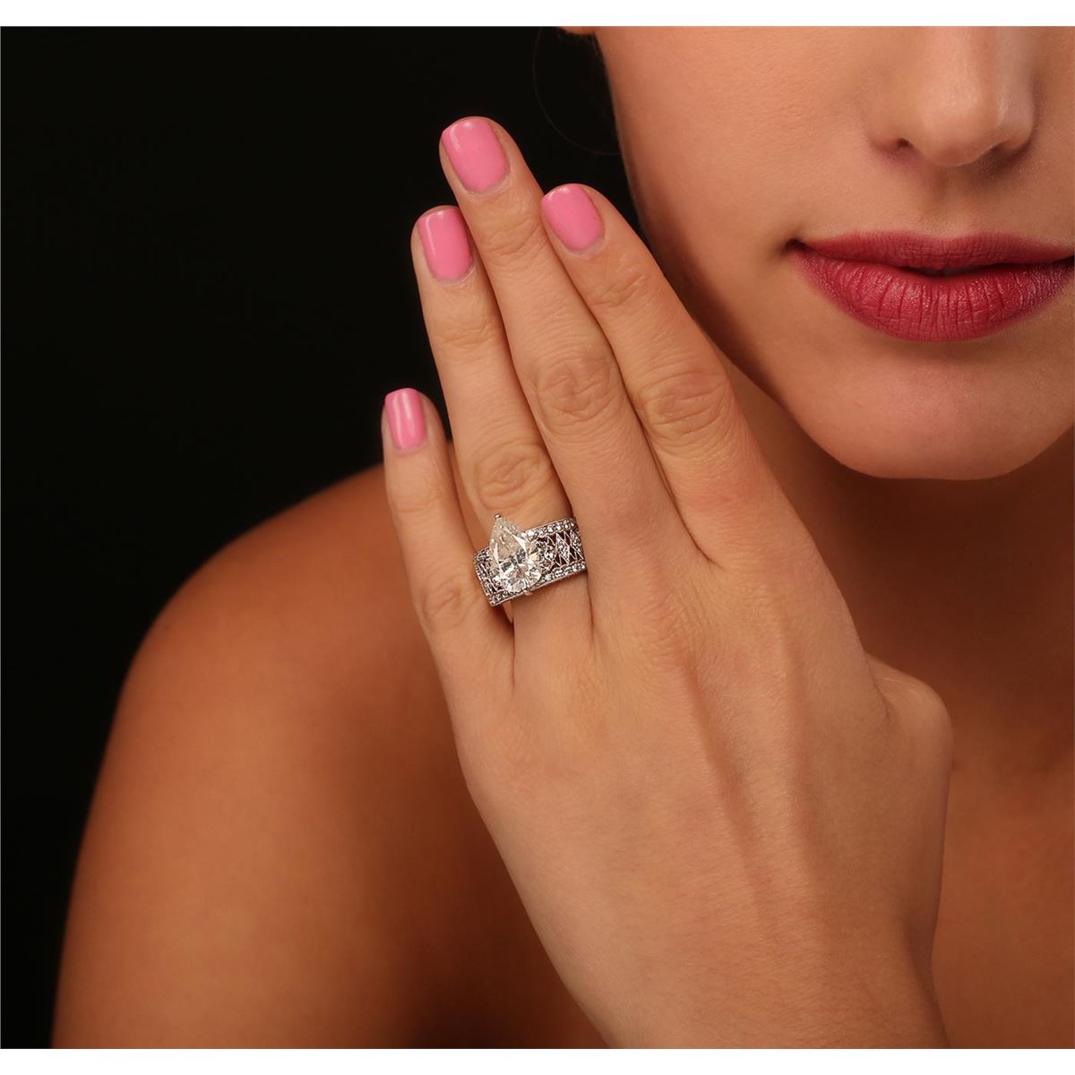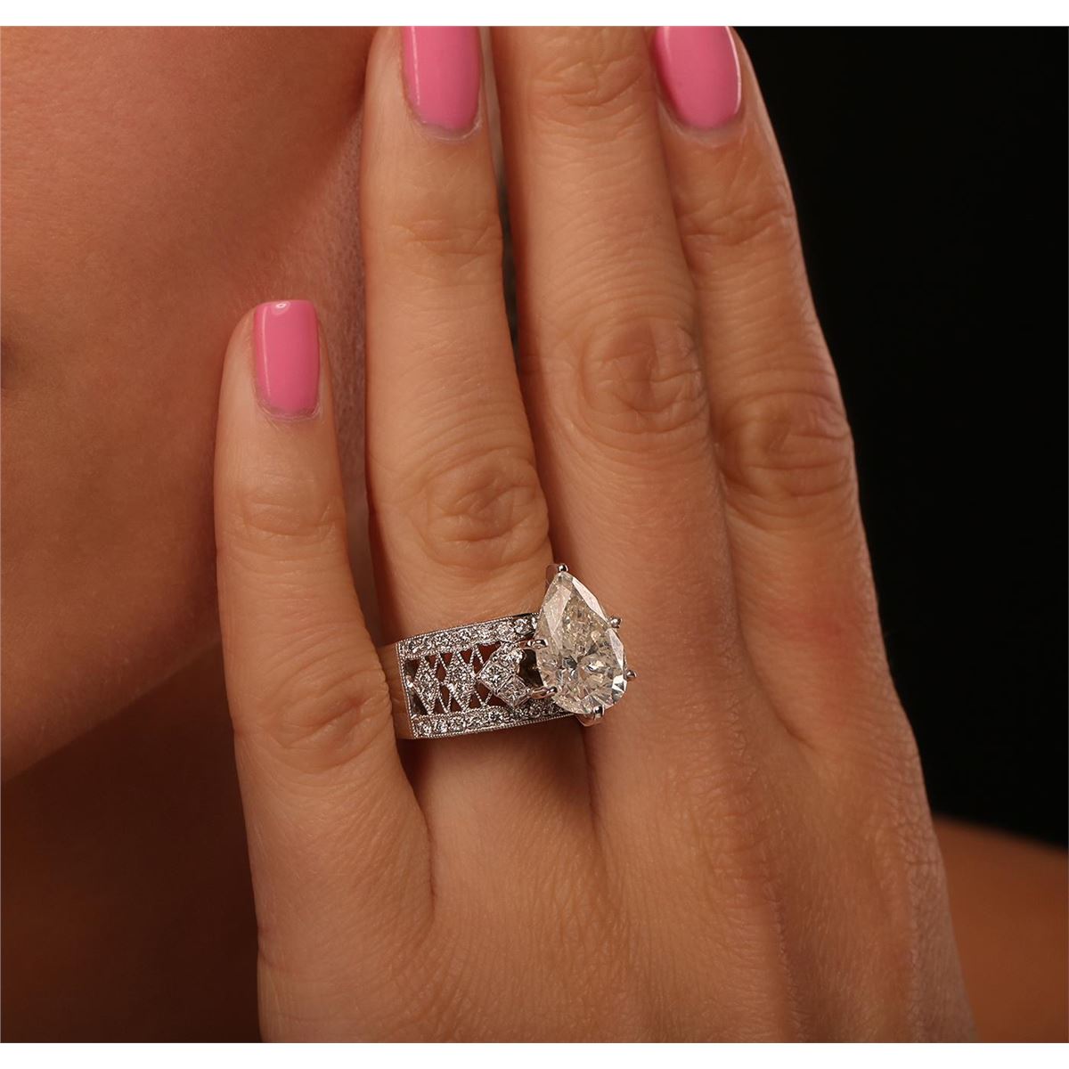 One electronically tested 18KT white gold ladies cast & assembled diamond unity ring. Condition is good. The featured diamond is cathedral set supported by elaborate diamond set shoulders, completed by an eight and one-half millimeter wide band. Bright polish finish with milgrain detailing throughout. Identified with markings of "18K". Containing: One prong set pear shaped cut diamond, measuring 13.90 x 9.40 x 5.90mm (depth est.) approximate weight of 4.68ct. Diamond Grading Report attached. Graded in the setting. Clarity: I-1. Color: J Depth 62.8%. Table 57.5%. Six prong set princess cut diamonds, measuring 2.30 x 2.20 x 1.65mm (depth est.) approximate. Total Weight of 6 Stones = 0.51ct. Graded in the setting. Clarity: VS-2 to SI-1. Color: G - H Sixty-Four bead set round brilliant cut diamonds, measuring 1.40 - 1.30 x 0.81mm (depth est.) approximate. Total Weight of 64 Stones = 0.67ct. Graded in the setting. Clarity: VS-2 to SI-2. Color: G - I. Total Weight of Diamonds 5.86ct. Total Weight of Ring 14.14 grams. AIG Appraised at $68,880.00.