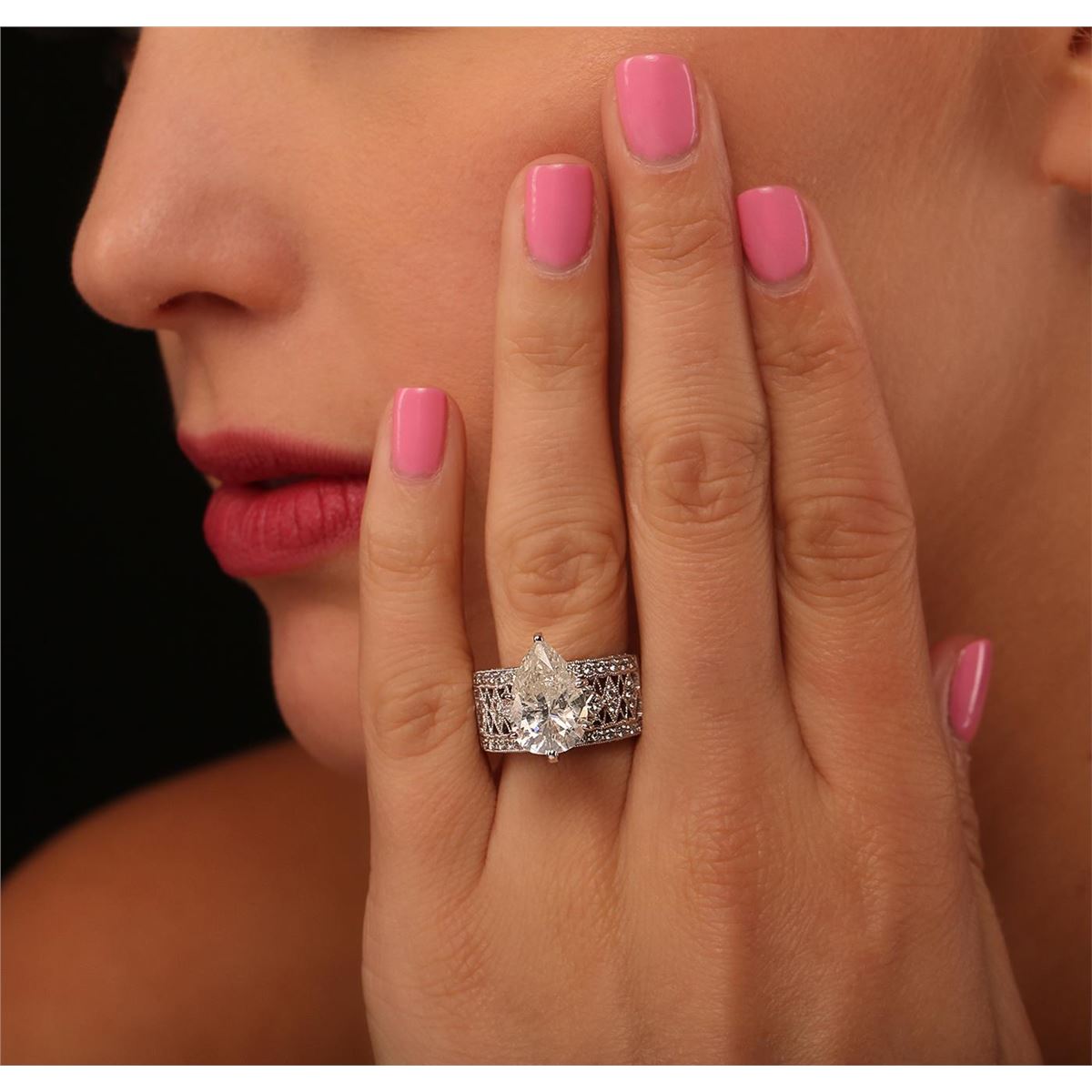 One electronically tested 18KT white gold ladies cast & assembled diamond unity ring. Condition is good. The featured diamond is cathedral set supported by elaborate diamond set shoulders, completed by an eight and one-half millimeter wide band. Bright polish finish with milgrain detailing throughout. Identified with markings of "18K". Containing: One prong set pear shaped cut diamond, measuring 13.90 x 9.40 x 5.90mm (depth est.) approximate weight of 4.68ct. Diamond Grading Report attached. Graded in the setting. Clarity: I-1. Color: J Depth 62.8%. Table 57.5%. Six prong set princess cut diamonds, measuring 2.30 x 2.20 x 1.65mm (depth est.) approximate. Total Weight of 6 Stones = 0.51ct. Graded in the setting. Clarity: VS-2 to SI-1. Color: G - H Sixty-Four bead set round brilliant cut diamonds, measuring 1.40 - 1.30 x 0.81mm (depth est.) approximate. Total Weight of 64 Stones = 0.67ct. Graded in the setting. Clarity: VS-2 to SI-2. Color: G - I. Total Weight of Diamonds 5.86ct. Total Weight of Ring 14.14 grams. AIG Appraised at $68,880.00.