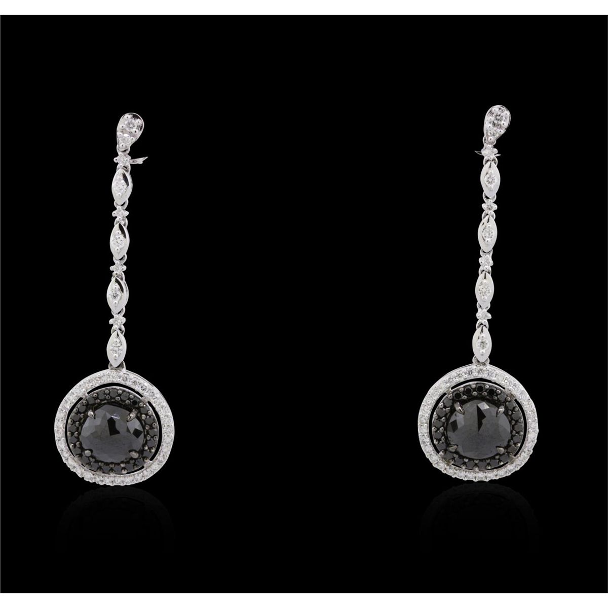 One pair of 18KT white gold earrings containing two round rose cut fancy black diamonds, enhanced for color, with a total weight of 4.66ct. The earrings also contain diamonds: fancy black (color enhanced) and white side stones: G-H / SI2-I1 weighing 0.44c