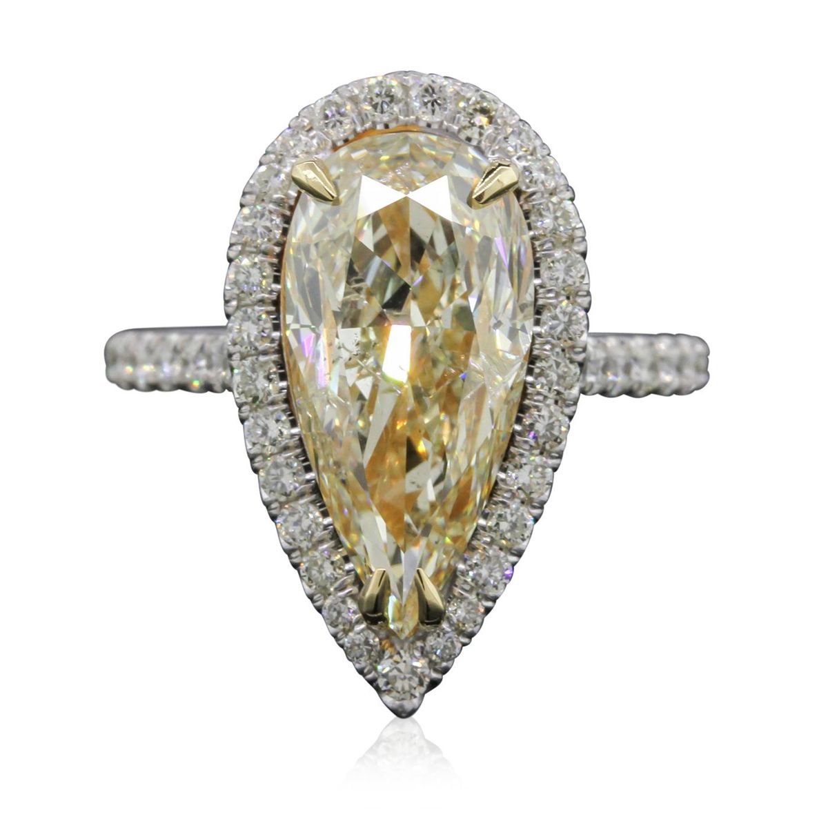 One electronically tested 18KT white gold Ladies combination cast & assembled engagement ring with a bright polish finish. Condition is new. Containing: One prong set pear shaped cut diamond, measuring 16.00 x 7.90 x 6.00mm (depth est.) approximate weight of 5.07ct. Clarity of I-1, Cut is Good. Forty-Five bead set round brilliant cut diamonds, measuring 1.70 - 1.40 x 0.93mm (depth est.) approximate total weight of 45 Stones = 0.84ct. Clarity of SI-1 to SI-2, Color of H - J, Cut is Very Good. Total Weight of Diamonds 5.91ct. Total Weight of Ring 6.80gm. GGL Appraised at $80,365.00.