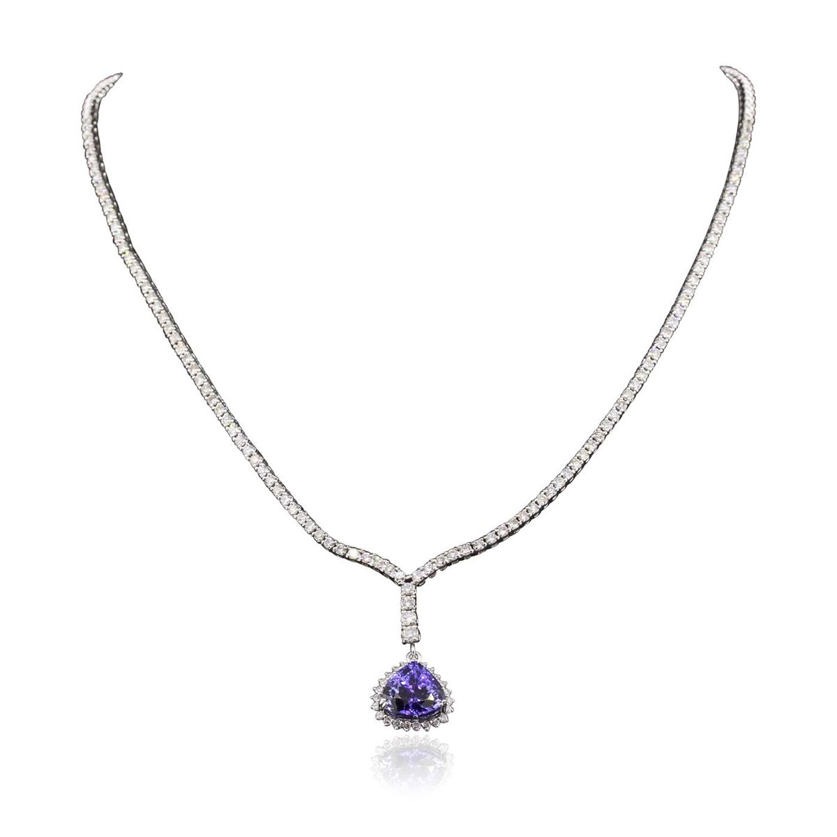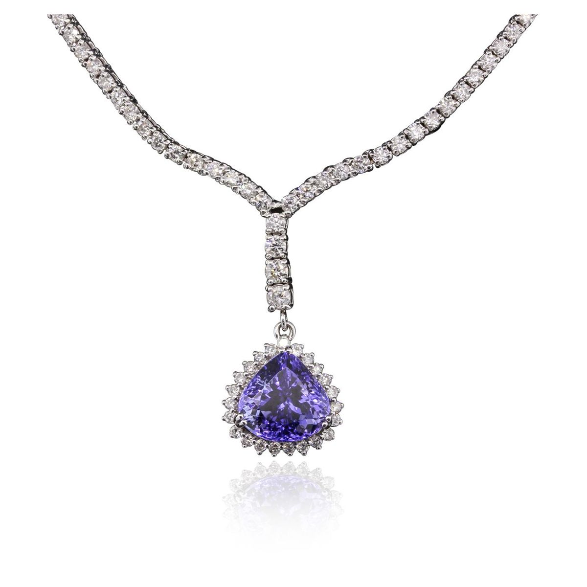 One tennis necklace featuring: 18KT White Gold with a total weight of 18.55 grams, (1) tanzanite with a total weight of 5.96ct, and round diamonds with a total weight of 3.47ct.