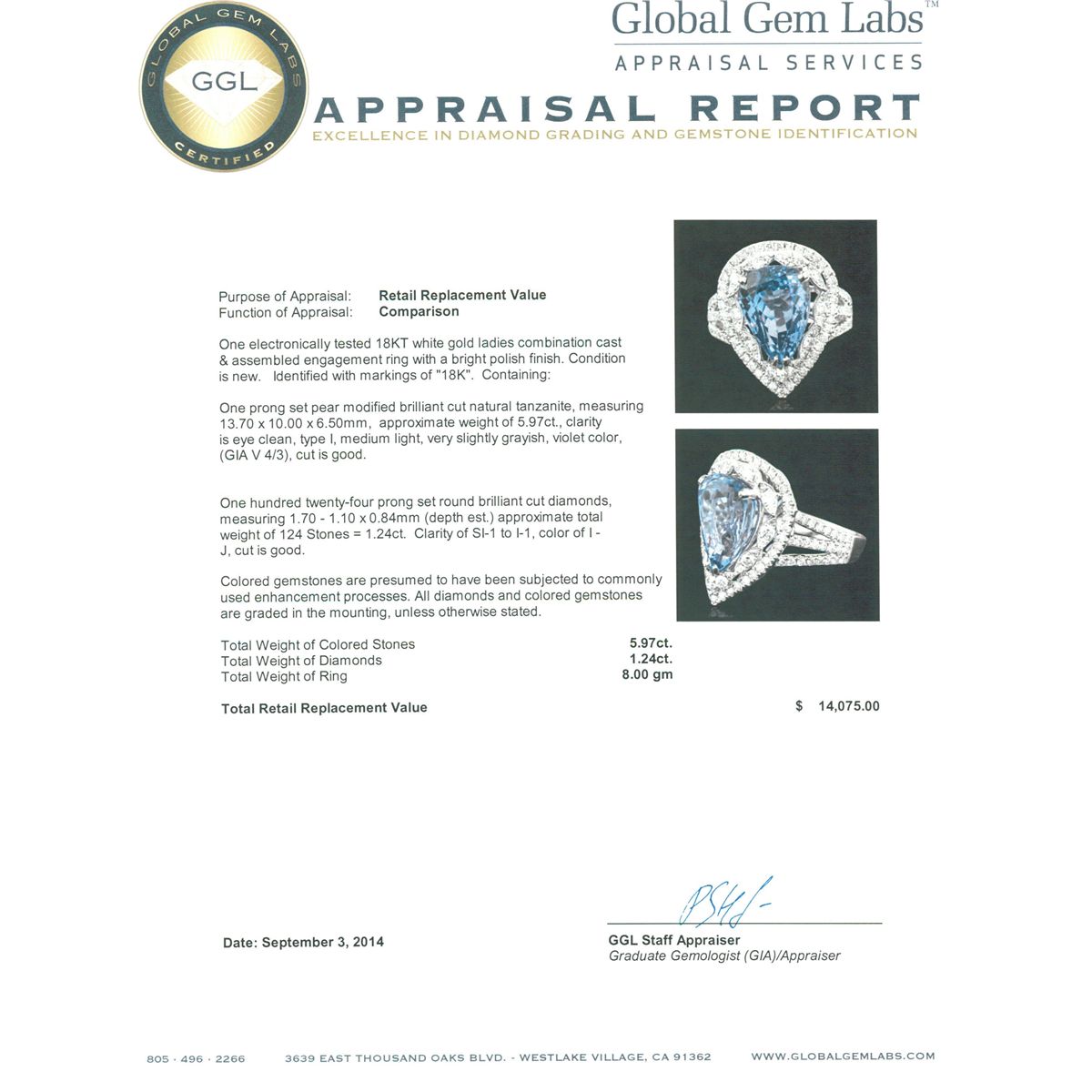 One electronically tested 18KT white gold ladies combination cast & assembled engagement ring with a bright polish finish. Identified with markings of "18K". Condition is new. Containing: One prong set pear modified brilliant cut natural tanzanite, measuring 13.70 x 10.00 x 6.50mm, approximate weight of 5.97ct., clarity is eye clean, type I, medium light, very slightly grayish, violet color, (GIA V 4/3), cut is good. One Hundred Twenty-Four prong set round brilliant cut diamonds, measuring 1.70 - 1.10 x 0.84mm (depth est.) approximate total weight of 124 Stones = 1.24ct. Clarity: SI-1 to I-1. Color: I - J, Cut is Good. Colored gemstones are presumed to have been subjected to commonly used enhancement processes. All diamonds and colored gemstones are graded in the mounting, unless otherwise stated. Total Weight of Colored Stones 5.97ct. Total Weight of Diamonds 1.24ct. Total Weight of Ring 8.00 grams. GGL Appraised at $14,075.00.