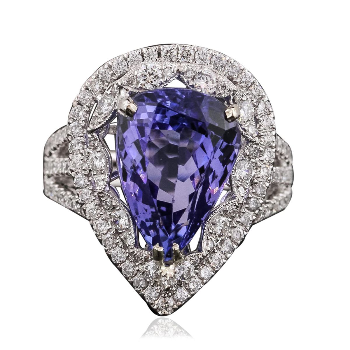 One electronically tested 18KT white gold ladies combination cast & assembled engagement ring with a bright polish finish. Identified with markings of "18K". Condition is new. Containing: One prong set pear modified brilliant cut natural tanzanite, measuring 13.70 x 10.00 x 6.50mm, approximate weight of 5.97ct., clarity is eye clean, type I, medium light, very slightly grayish, violet color, (GIA V 4/3), cut is good. One Hundred Twenty-Four prong set round brilliant cut diamonds, measuring 1.70 - 1.10 x 0.84mm (depth est.) approximate total weight of 124 Stones = 1.24ct. Clarity: SI-1 to I-1. Color: I - J, Cut is Good. Colored gemstones are presumed to have been subjected to commonly used enhancement processes. All diamonds and colored gemstones are graded in the mounting, unless otherwise stated. Total Weight of Colored Stones 5.97ct. Total Weight of Diamonds 1.24ct. Total Weight of Ring 8.00 grams. GGL Appraised at $14,075.00.