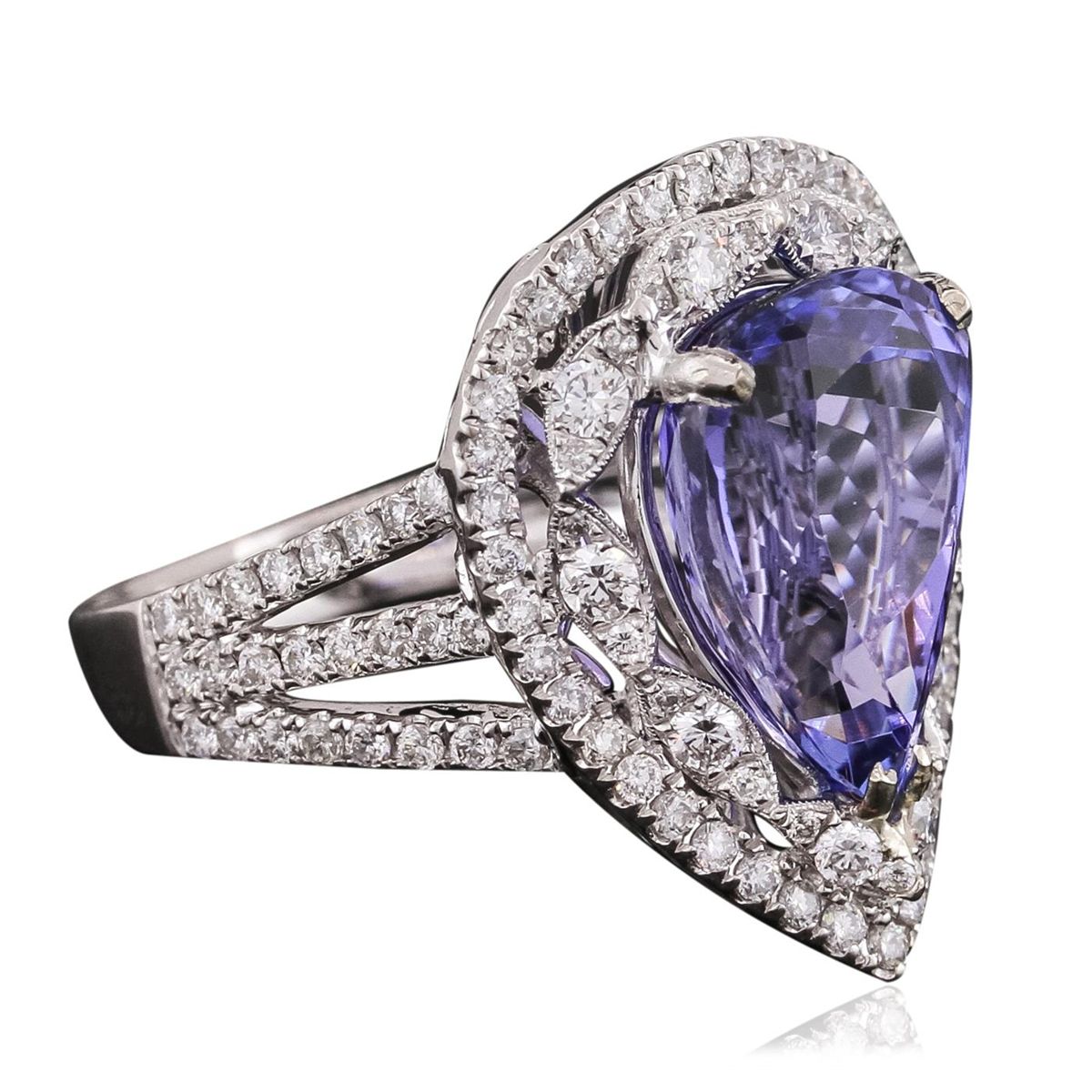 One electronically tested 18KT white gold ladies combination cast & assembled engagement ring with a bright polish finish. Identified with markings of "18K". Condition is new. Containing: One prong set pear modified brilliant cut natural tanzanite, measuring 13.70 x 10.00 x 6.50mm, approximate weight of 5.97ct., clarity is eye clean, type I, medium light, very slightly grayish, violet color, (GIA V 4/3), cut is good. One Hundred Twenty-Four prong set round brilliant cut diamonds, measuring 1.70 - 1.10 x 0.84mm (depth est.) approximate total weight of 124 Stones = 1.24ct. Clarity: SI-1 to I-1. Color: I - J, Cut is Good. Colored gemstones are presumed to have been subjected to commonly used enhancement processes. All diamonds and colored gemstones are graded in the mounting, unless otherwise stated. Total Weight of Colored Stones 5.97ct. Total Weight of Diamonds 1.24ct. Total Weight of Ring 8.00 grams. GGL Appraised at $14,075.00.