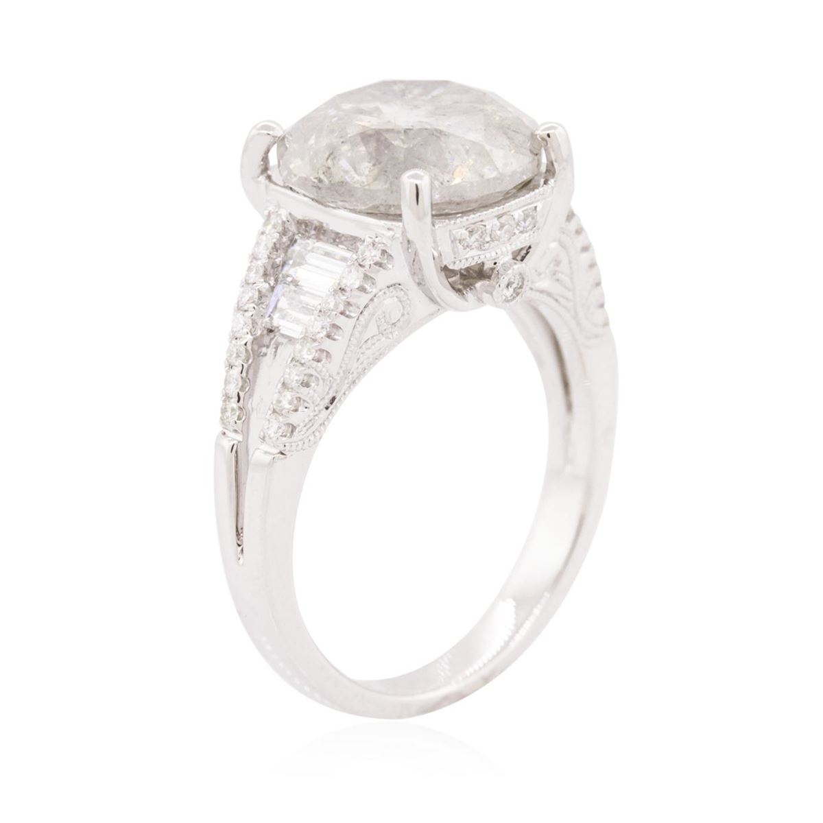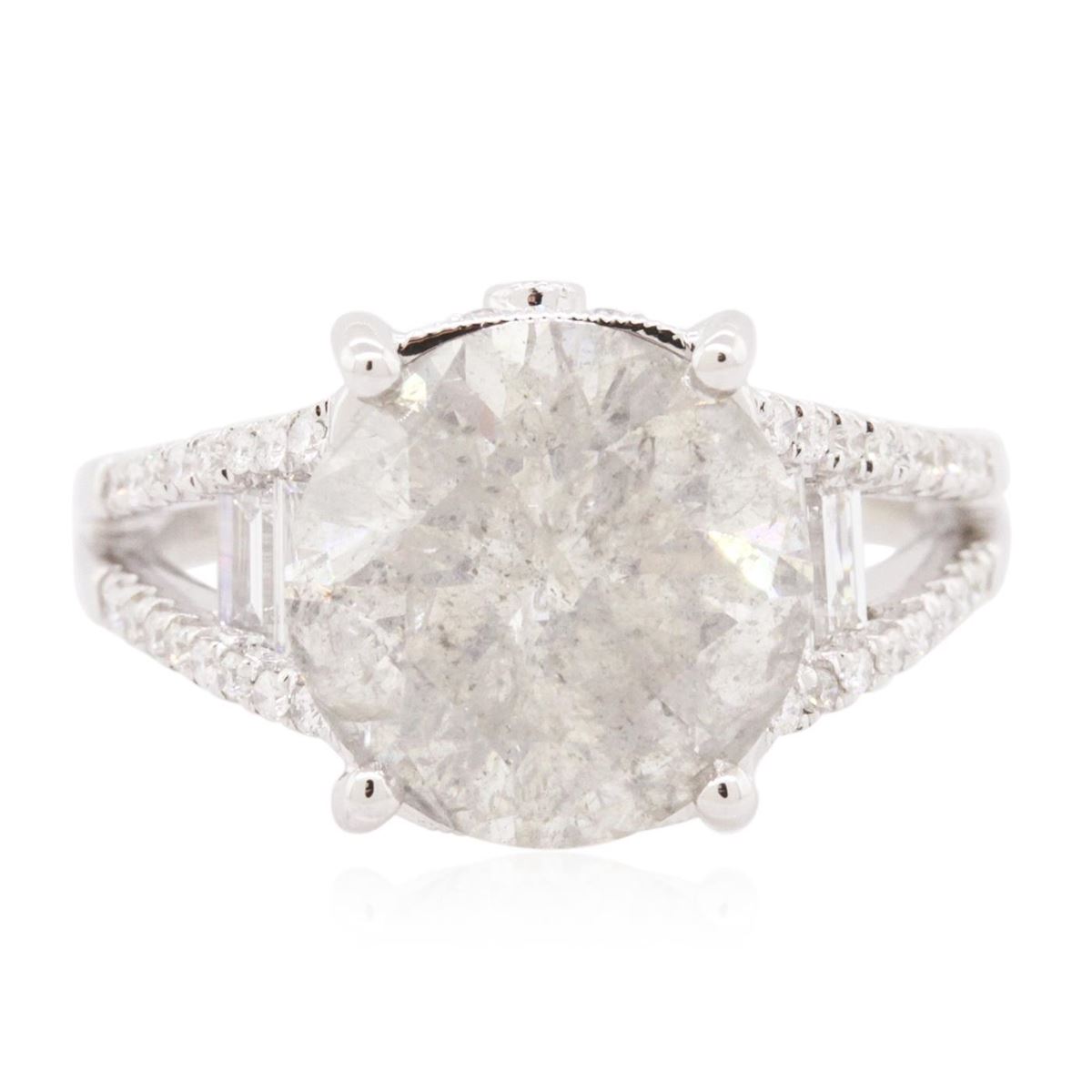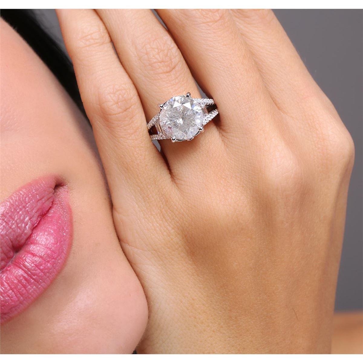 One electronically tested 18KT white gold ladies cast diamond unity ring with a bright polish finish. The featured diamond is supported by diamond set split shoulders, completed by a two and one-half millimeter wide band. Identified with markings of "18K 750". Condition is new, good workmanship. Containing: One prong set round brilliant cut diamond, measuring 11.00 - 10.90 x 7.10mm (depth est.), 4.00.%. GTCF approximate weight of 5.40ct, clarity enhanced. Fracture filling has no tolerance to ultrasonic and steam cleaning. Graded in the setting. Clarity: I-2. Color:  64.8%. Table 59.7%. Forty prong and bezel set round brilliant cut diamonds, measuring 1.20 - 1.10 x 0.69mm (depth est.) approximate total weight of 40 Stones = 0.32ct. Graded in the setting. Clarity: VS-2 to SI-2. Color: G - I Four channel set baguette cut diamonds, measuring from 3.50 x 1.90 x 1.33mm (depth est.) to 4.20 x 1.70 x 1.19mm (depth est.) approximate total weight of 4 Stones = 0.35ct. Graded in the setting. Clarity: VVS-1 to VVS-2 Color G - H. Total Weight of Diamonds 6.07ct. Total Weight of Ring 7.65 grams. AIG Appraised at $34,235.00.