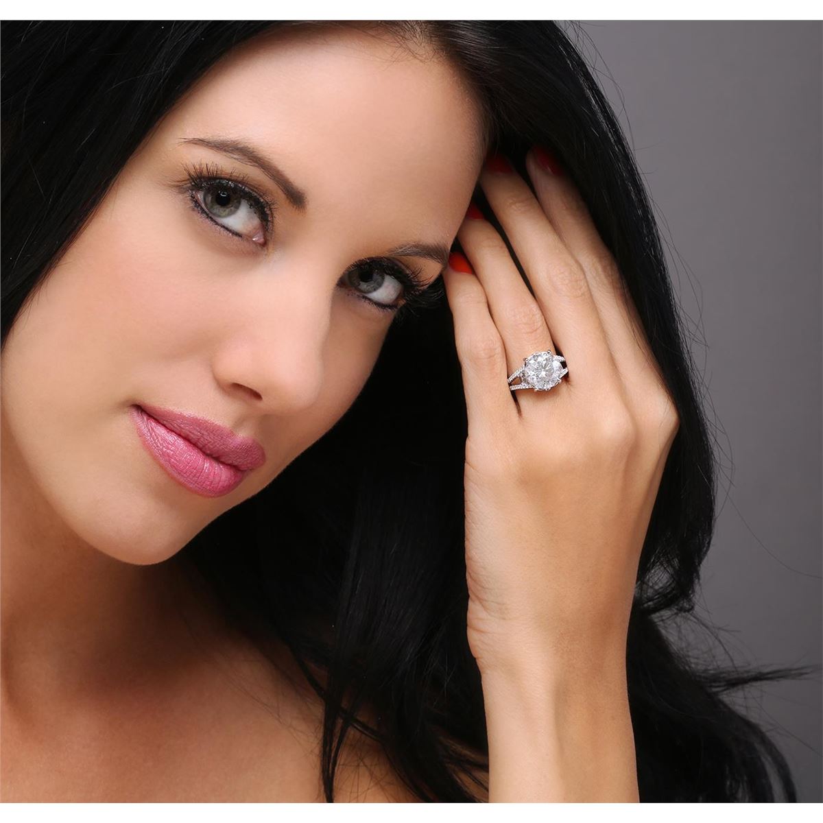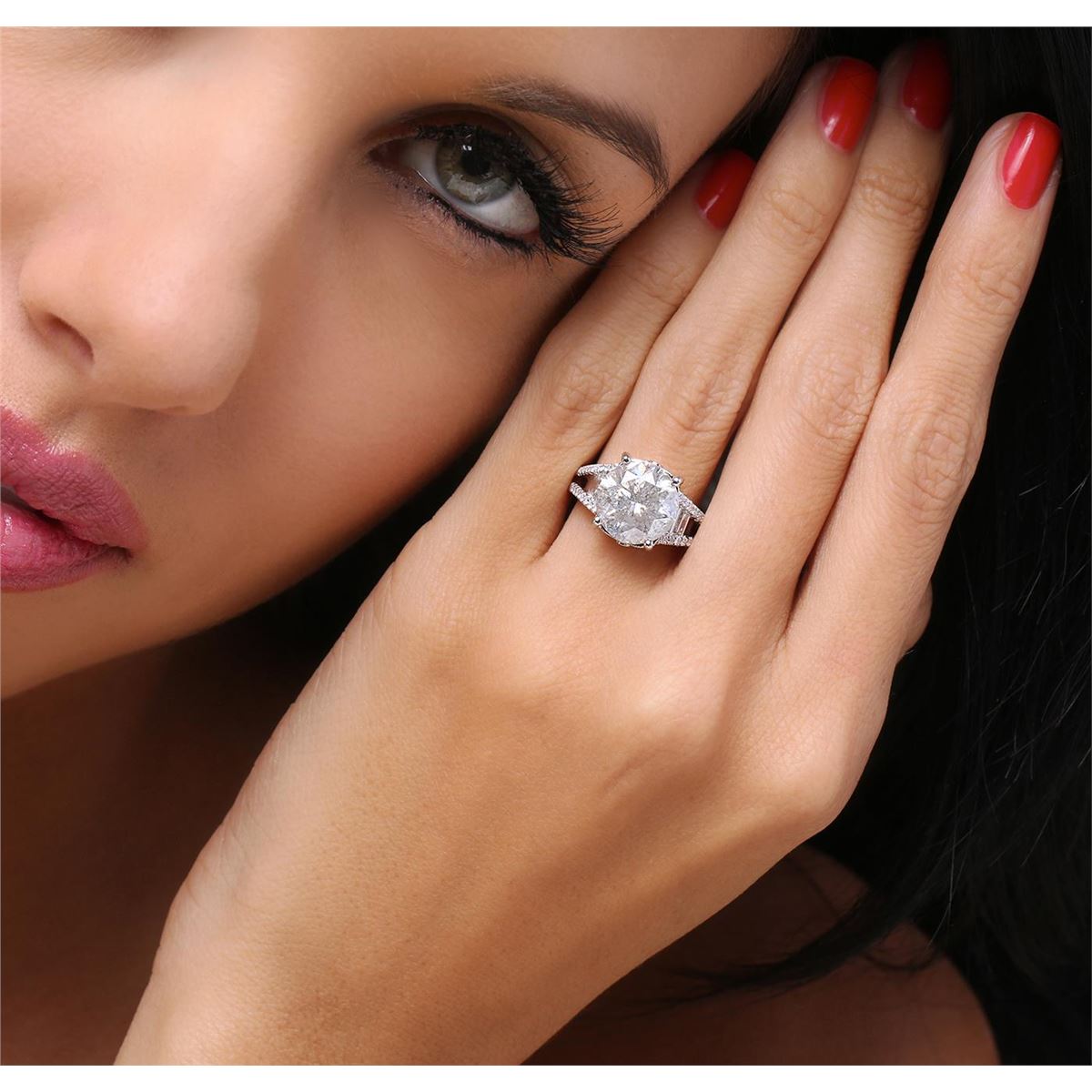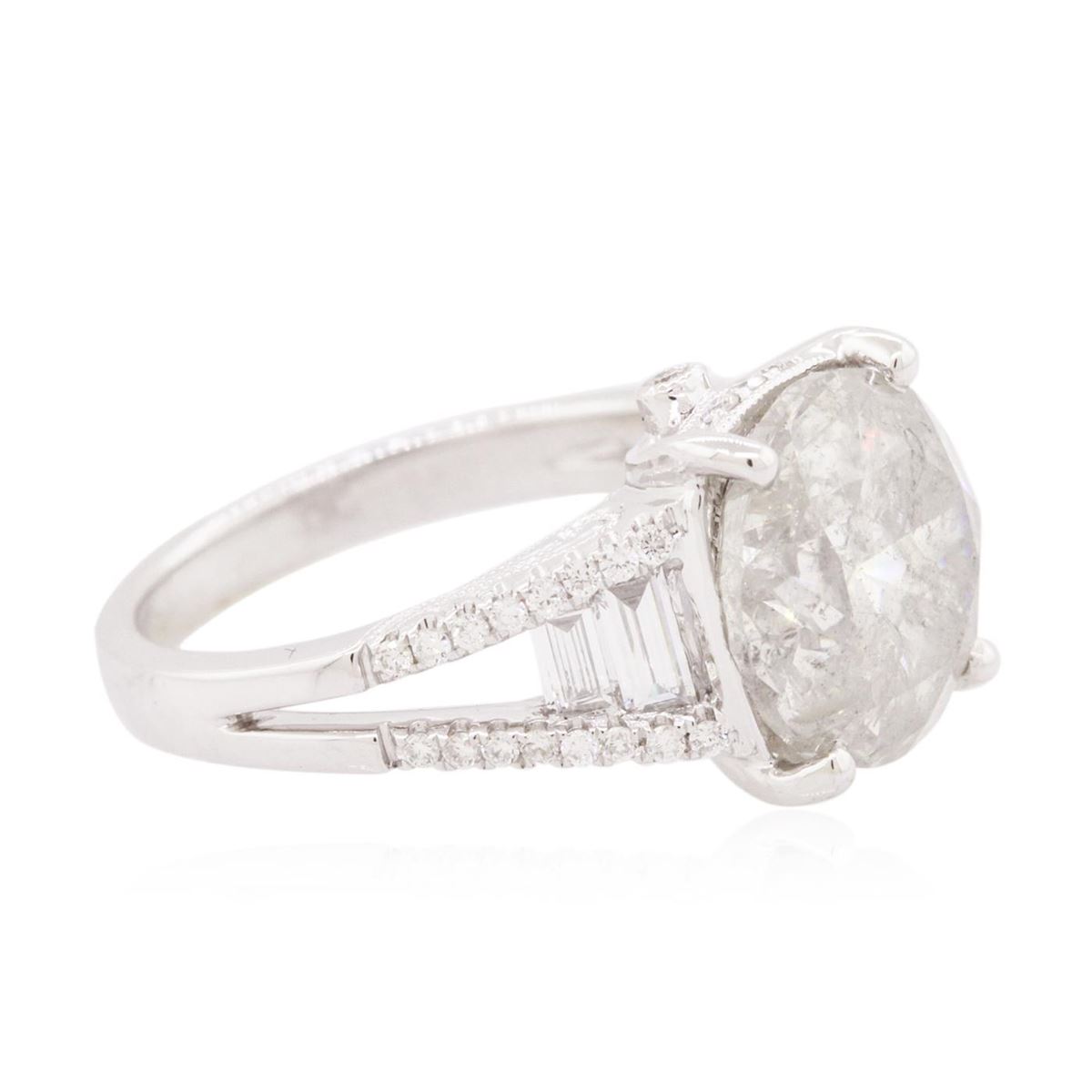 One electronically tested 18KT white gold ladies cast diamond unity ring with a bright polish finish. The featured diamond is supported by diamond set split shoulders, completed by a two and one-half millimeter wide band. Identified with markings of "18K 750". Condition is new, good workmanship. Containing: One prong set round brilliant cut diamond, measuring 11.00 - 10.90 x 7.10mm (depth est.), 4.00.%. GTCF approximate weight of 5.40ct, clarity enhanced. Fracture filling has no tolerance to ultrasonic and steam cleaning. Graded in the setting. Clarity: I-2. Color:  64.8%. Table 59.7%. Forty prong and bezel set round brilliant cut diamonds, measuring 1.20 - 1.10 x 0.69mm (depth est.) approximate total weight of 40 Stones = 0.32ct. Graded in the setting. Clarity: VS-2 to SI-2. Color: G - I Four channel set baguette cut diamonds, measuring from 3.50 x 1.90 x 1.33mm (depth est.) to 4.20 x 1.70 x 1.19mm (depth est.) approximate total weight of 4 Stones = 0.35ct. Graded in the setting. Clarity: VVS-1 to VVS-2 Color G - H. Total Weight of Diamonds 6.07ct. Total Weight of Ring 7.65 grams. AIG Appraised at $34,235.00.