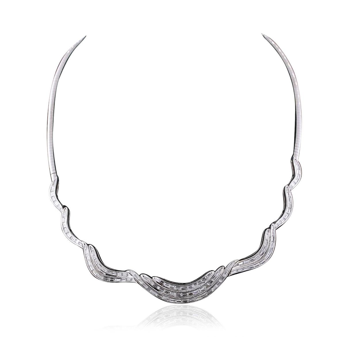 One electronically tested 18KT white gold ladies combination cast & assembled necklace with a hidden box clasp with a bright polish finish. Condition is very good. Measurements: 16" in length. Identified with markings of "18K". Containing: One Hundred Twenty-Five channel set baguette cut diamonds, measuring 2.80 x 1.50 x 1.28mm (depth est.) approximate. Total Weight of 125 Stones = 6.14ct. Clarity: VS-2. Color: G - H, Cut is Good. All diamonds are graded in the mounting, unless otherwise stated. Total Weight of Diamonds 6.14ct. Total Weight of Necklace 40.50 grams. GGL Appraised at $36,125.00.