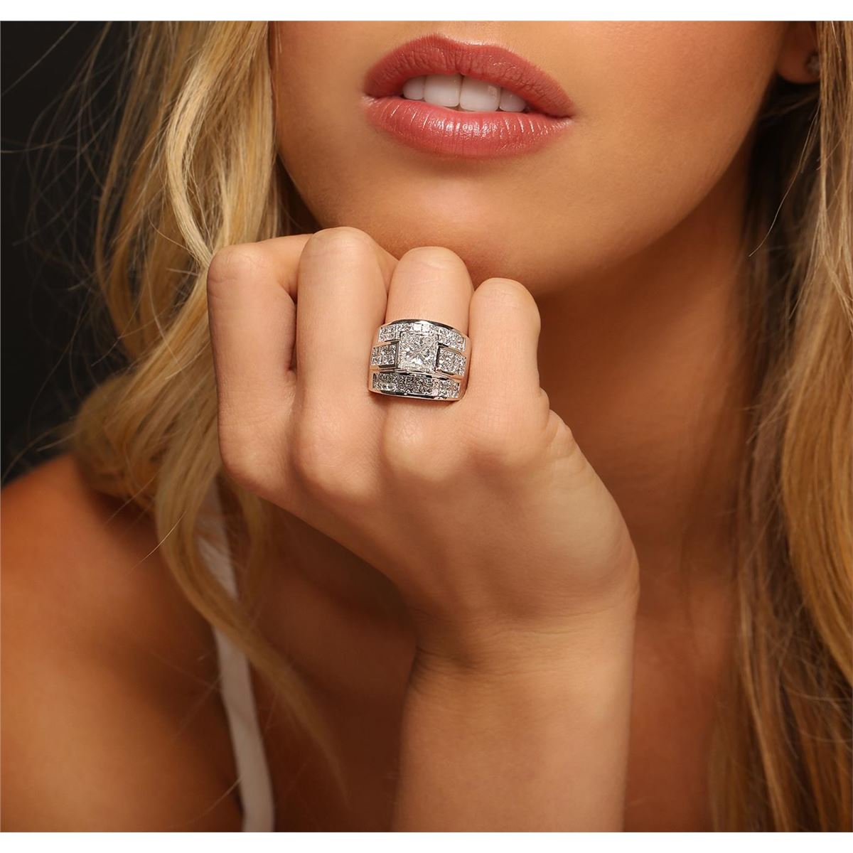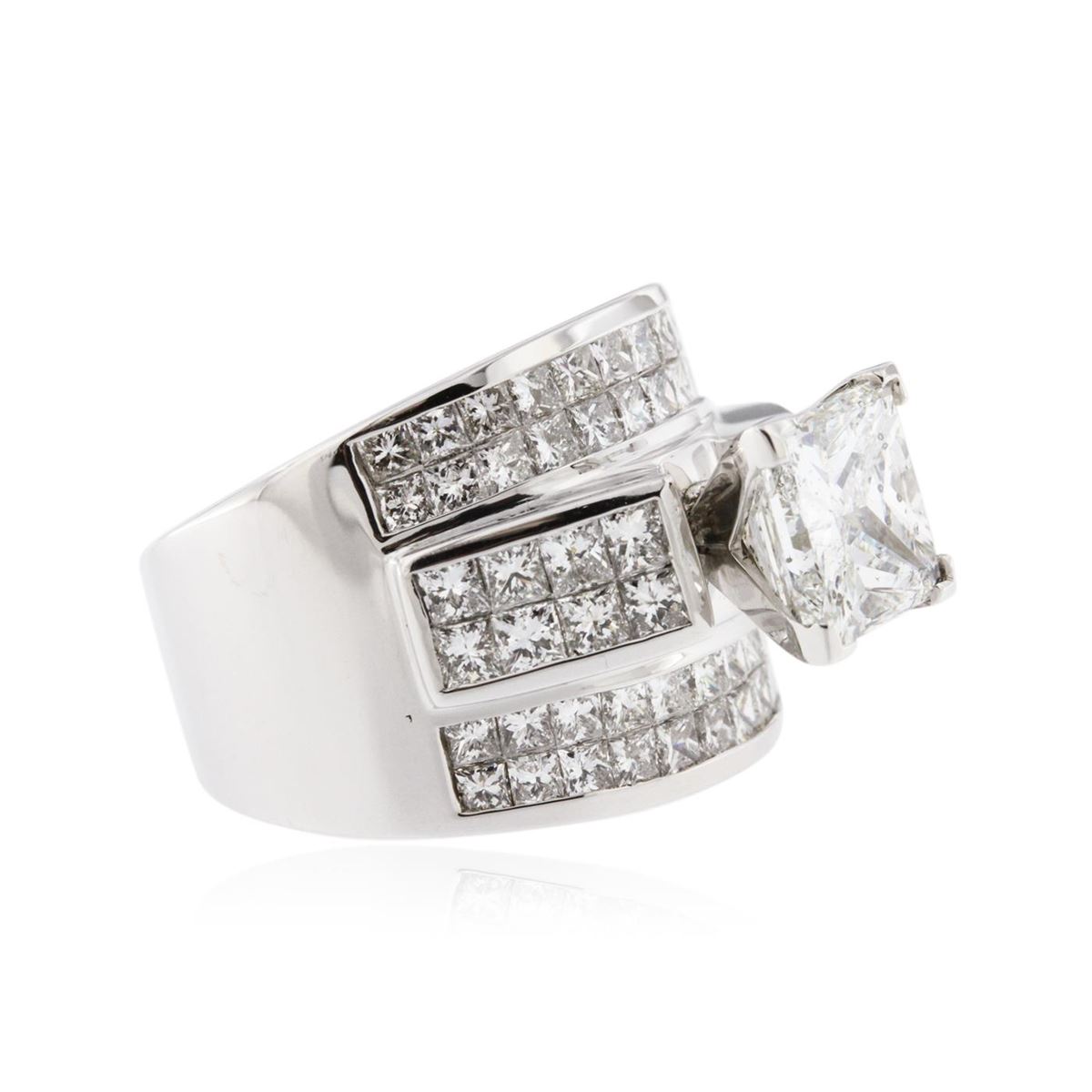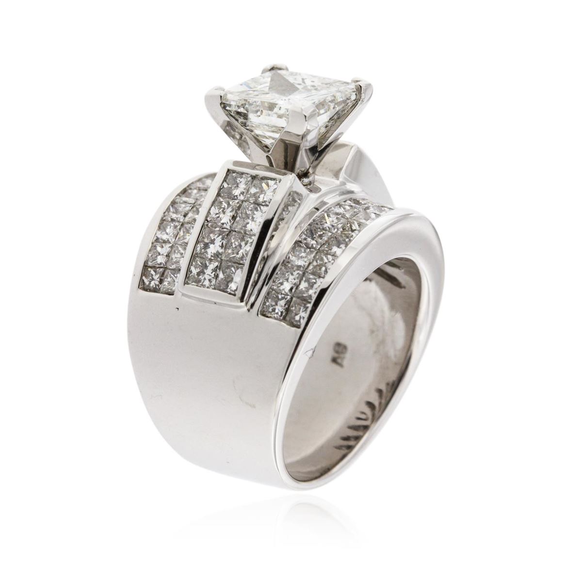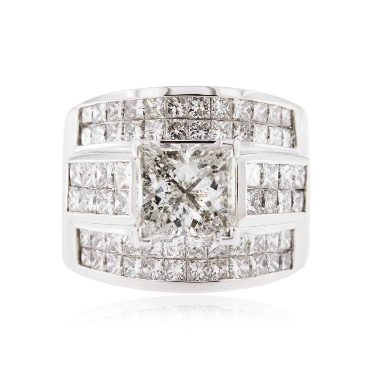 One electronically tested 18KT white gold Ladies combination cast & assembled engagement ring with a bright polish finish. Identified with markings of "18K". Condition is excellent. Containing: One prong set princess cut diamond, measuring 8.10 x 7.90 x 5.93mm (depth est.) approximate weight of 3.01ct. Clarity of I-1, Color of I, Cut is Very Good. Sixty-Four invisible set princess cut diamonds, measuring 2.00 x 2.00 x 1.51mm (depth est.) approximate total weight of 64 Stones = 3.18ct. Clarity of VS-2 to SI-1, Color of H - I, Cut is Very Good. Total Weight of Diamonds 6.19ct. Total Weight of Ring 22.30gm. GGL Appraised at $55,280.00.