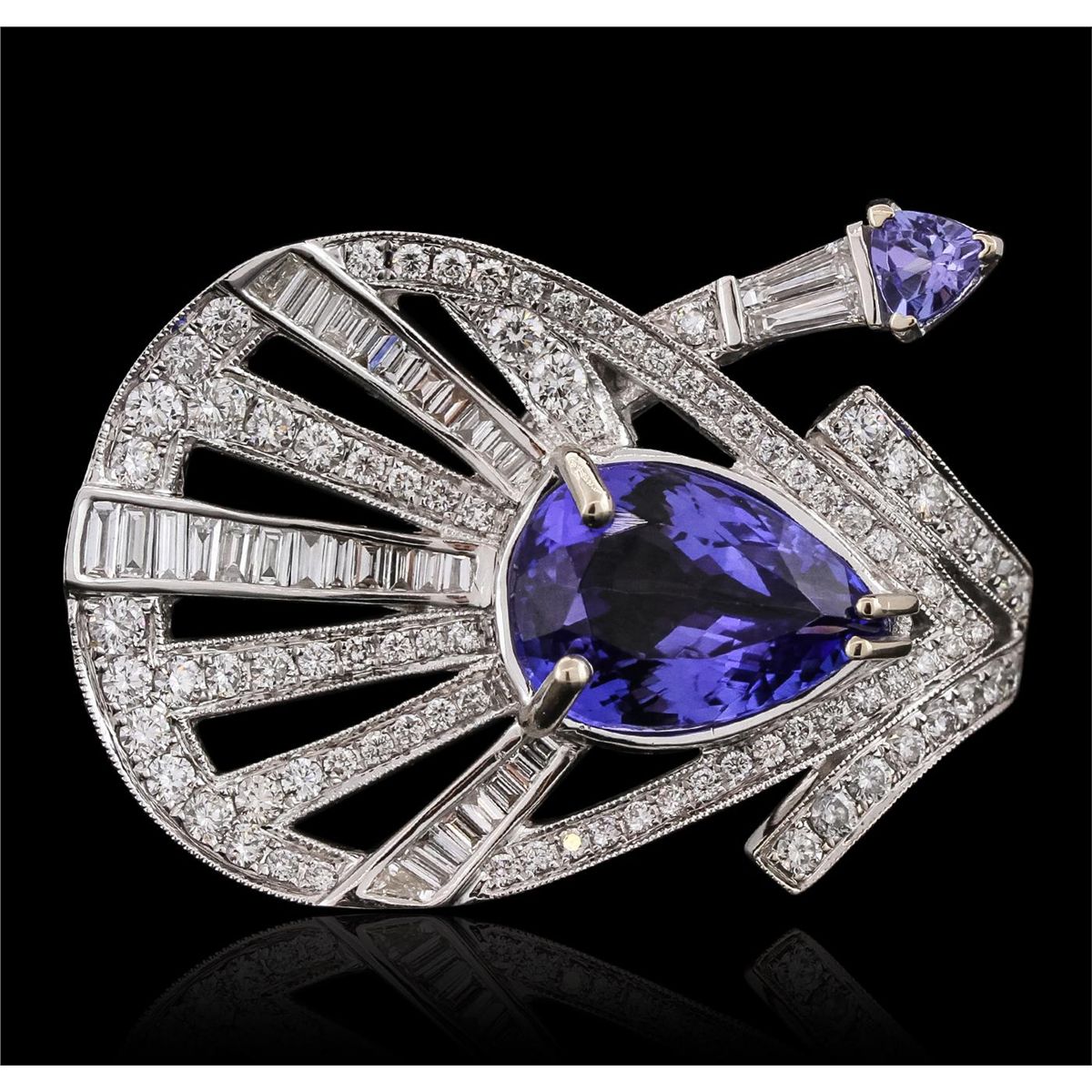 One electronically tested 18KT white gold ladies combination cast & assembled prong set ring with a bright polish finish. Identified with markings of "750". Condition is new. Containing: One prong set pear modified brilliant cut natural tanzanite, measuring 14.00 x 9.68 x 6.29mm, approximate weight of 5.71ct., clarity is eye clean, type I, medium, moderately strong, bluish violet color, (GIA bV 5/4), cut is good. One prong set triangle modified brilliant cut natural tanzanite, measuring 5.00 x 5.00 x 3.25mm, approximate weight of 0.49ct., clarity is eye clean, type I, medium, moderately strong, violet color, (GIA V 5/4), cut is good. Ninety-One prong set round brilliant cut diamonds, measuring 1.90 - 1.10 x 0.90mm (depth est.) approximate total weight of 91 Stones = 1.12ct. Clarity: SI-1 to I-1. Color: H - I, Cut is Good. Thirty-Three channel set baguette cut diamonds, measuring from 1.50 x 1.50 x 1.28mm (depth est.) to 3.00 x 1.80 x 1.53mm (depth est.) approximate total weight of 33 Stones = 1.57ct. Clarity: VS-2. Color: H, Cut is Good. Colored gemstones are presumed to have been subjected to commonly used enhancement processes. All diamonds and colored gemstones are graded in the mounting, unless otherwise stated. Total Weight of Colored Stones 6.20ct. Total Weight of Diamonds 2.69ct. Total Weight of Ring 12.40 grams. GGL Appraised at $21,290.00.