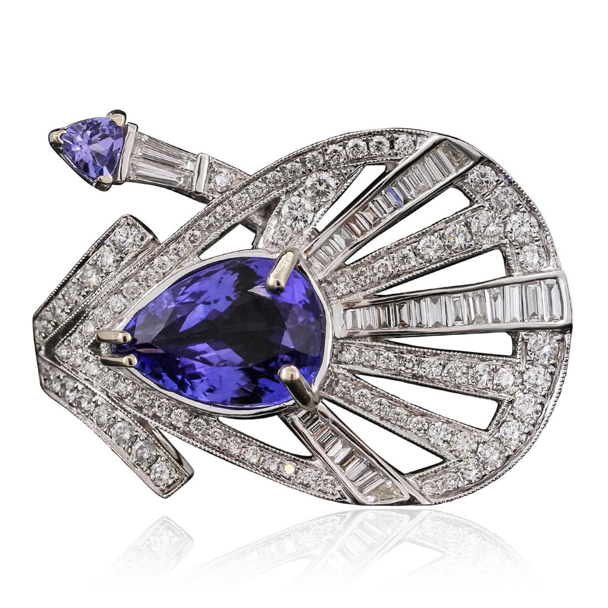 One electronically tested 18KT white gold ladies combination cast & assembled prong set ring with a bright polish finish. Identified with markings of "750". Condition is new. Containing: One prong set pear modified brilliant cut natural tanzanite, measuring 14.00 x 9.68 x 6.29mm, approximate weight of 5.71ct., clarity is eye clean, type I, medium, moderately strong, bluish violet color, (GIA bV 5/4), cut is good. One prong set triangle modified brilliant cut natural tanzanite, measuring 5.00 x 5.00 x 3.25mm, approximate weight of 0.49ct., clarity is eye clean, type I, medium, moderately strong, violet color, (GIA V 5/4), cut is good. Ninety-One prong set round brilliant cut diamonds, measuring 1.90 - 1.10 x 0.90mm (depth est.) approximate total weight of 91 Stones = 1.12ct. Clarity: SI-1 to I-1. Color: H - I, Cut is Good. Thirty-Three channel set baguette cut diamonds, measuring from 1.50 x 1.50 x 1.28mm (depth est.) to 3.00 x 1.80 x 1.53mm (depth est.) approximate total weight of 33 Stones = 1.57ct. Clarity: VS-2. Color: H, Cut is Good. Colored gemstones are presumed to have been subjected to commonly used enhancement processes. All diamonds and colored gemstones are graded in the mounting, unless otherwise stated. Total Weight of Colored Stones 6.20ct. Total Weight of Diamonds 2.69ct. Total Weight of Ring 12.40 grams. GGL Appraised at $21,290.00.