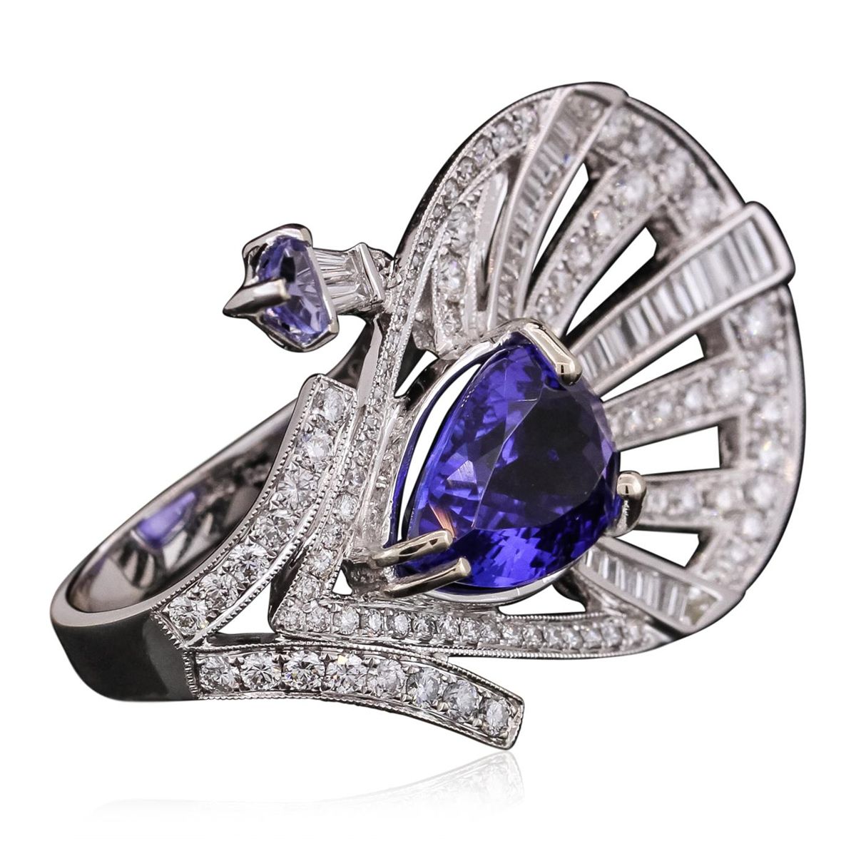 One electronically tested 18KT white gold ladies combination cast & assembled prong set ring with a bright polish finish. Identified with markings of "750". Condition is new. Containing: One prong set pear modified brilliant cut natural tanzanite, measuring 14.00 x 9.68 x 6.29mm, approximate weight of 5.71ct., clarity is eye clean, type I, medium, moderately strong, bluish violet color, (GIA bV 5/4), cut is good. One prong set triangle modified brilliant cut natural tanzanite, measuring 5.00 x 5.00 x 3.25mm, approximate weight of 0.49ct., clarity is eye clean, type I, medium, moderately strong, violet color, (GIA V 5/4), cut is good. Ninety-One prong set round brilliant cut diamonds, measuring 1.90 - 1.10 x 0.90mm (depth est.) approximate total weight of 91 Stones = 1.12ct. Clarity: SI-1 to I-1. Color: H - I, Cut is Good. Thirty-Three channel set baguette cut diamonds, measuring from 1.50 x 1.50 x 1.28mm (depth est.) to 3.00 x 1.80 x 1.53mm (depth est.) approximate total weight of 33 Stones = 1.57ct. Clarity: VS-2. Color: H, Cut is Good. Colored gemstones are presumed to have been subjected to commonly used enhancement processes. All diamonds and colored gemstones are graded in the mounting, unless otherwise stated. Total Weight of Colored Stones 6.20ct. Total Weight of Diamonds 2.69ct. Total Weight of Ring 12.40 grams. GGL Appraised at $21,290.00.