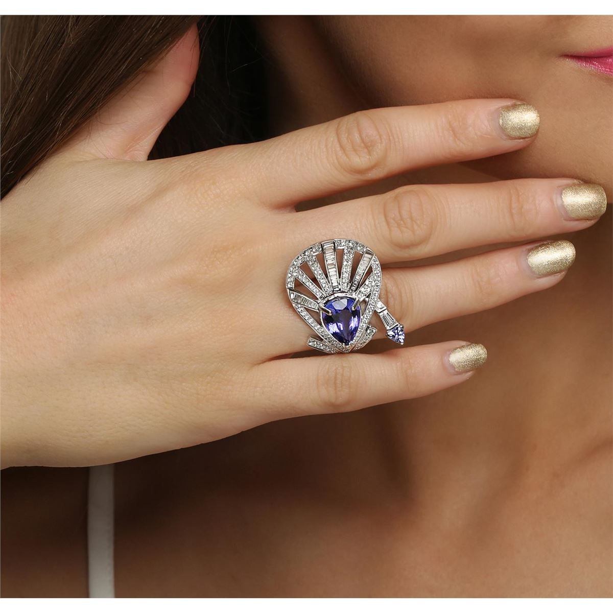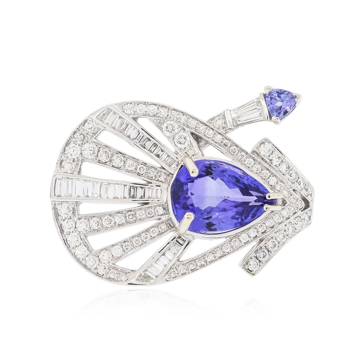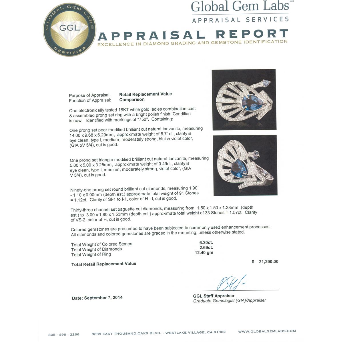 One electronically tested 18KT white gold ladies combination cast & assembled prong set ring with a bright polish finish. Identified with markings of "750". Condition is new. Containing: One prong set pear modified brilliant cut natural tanzanite, measuring 14.00 x 9.68 x 6.29mm, approximate weight of 5.71ct., clarity is eye clean, type I, medium, moderately strong, bluish violet color, (GIA bV 5/4), cut is good. One prong set triangle modified brilliant cut natural tanzanite, measuring 5.00 x 5.00 x 3.25mm, approximate weight of 0.49ct., clarity is eye clean, type I, medium, moderately strong, violet color, (GIA V 5/4), cut is good. Ninety-One prong set round brilliant cut diamonds, measuring 1.90 - 1.10 x 0.90mm (depth est.) approximate total weight of 91 Stones = 1.12ct. Clarity: SI-1 to I-1. Color: H - I, Cut is Good. Thirty-Three channel set baguette cut diamonds, measuring from 1.50 x 1.50 x 1.28mm (depth est.) to 3.00 x 1.80 x 1.53mm (depth est.) approximate total weight of 33 Stones = 1.57ct. Clarity: VS-2. Color: H, Cut is Good. Colored gemstones are presumed to have been subjected to commonly used enhancement processes. All diamonds and colored gemstones are graded in the mounting, unless otherwise stated. Total Weight of Colored Stones 6.20ct. Total Weight of Diamonds 2.69ct. Total Weight of Ring 12.40 grams. GGL Appraised at $21,290.00.