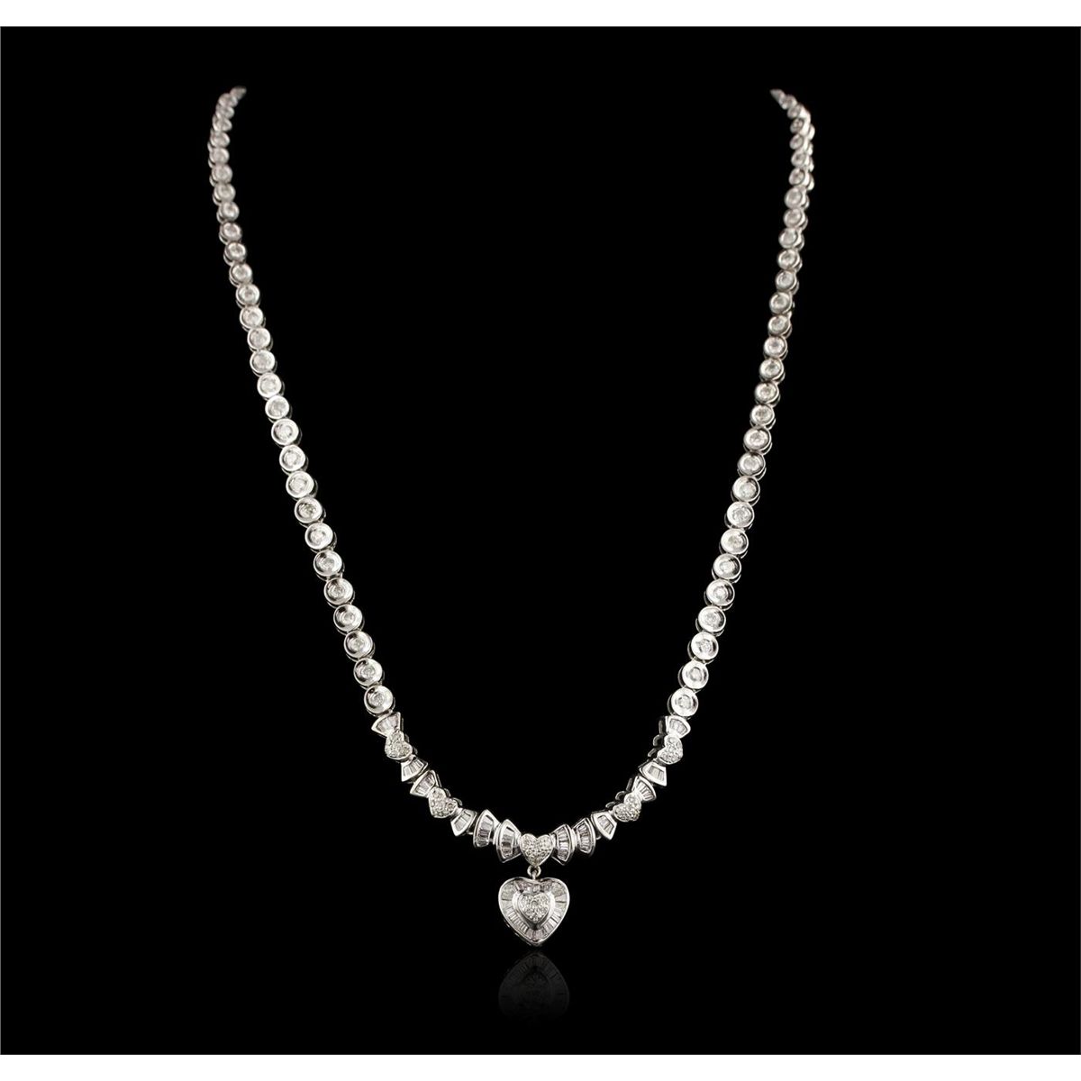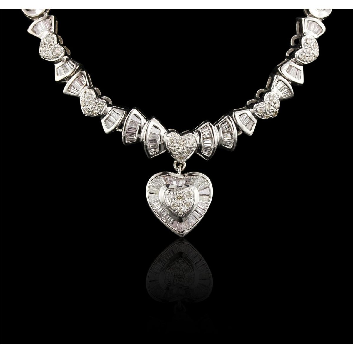 One electronically tested 18KT white gold Ladies combination cast & assembled heart necklace with a hidden box clasp with a bright polish finish. Measurements: 17.75" in length. Identified with markings of "18K". Condition is excellent. Containing: One Hundred Twenty-Eight bead set round brilliant cut diamonds, measuring 2.50 - 1.30 x 1.14mm (depth est.) approximate total weight of 128 Stones = 3.21ct. Clarity of I-1 to I-2, Color of H - J, Cut is Fair. Sixty-Four channel set baguette cut diamonds, measuring from 2.20 x 1.30 x 1.11mm (depth est.) to 3.00 x 2.00 x 1.71mm (depth est.) approximate total weight of 64 Stones = 3.05ct. Clarity of SI-2 to I-1, Color of G - I, Cut is Good. Total Weight of Diamonds 6.26ct. Total Weigh of Necklace 37.50gm. GGL Appraised at $21,980.00.