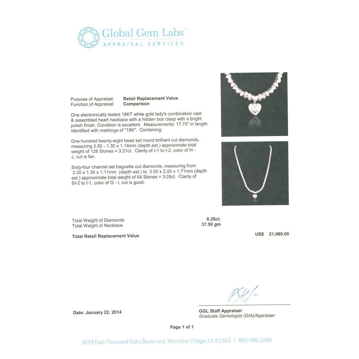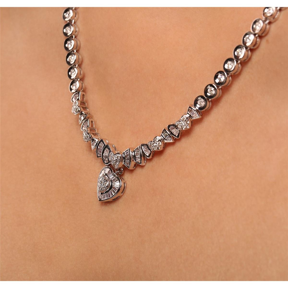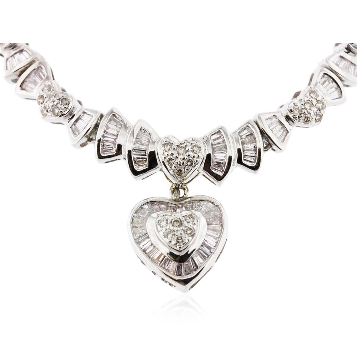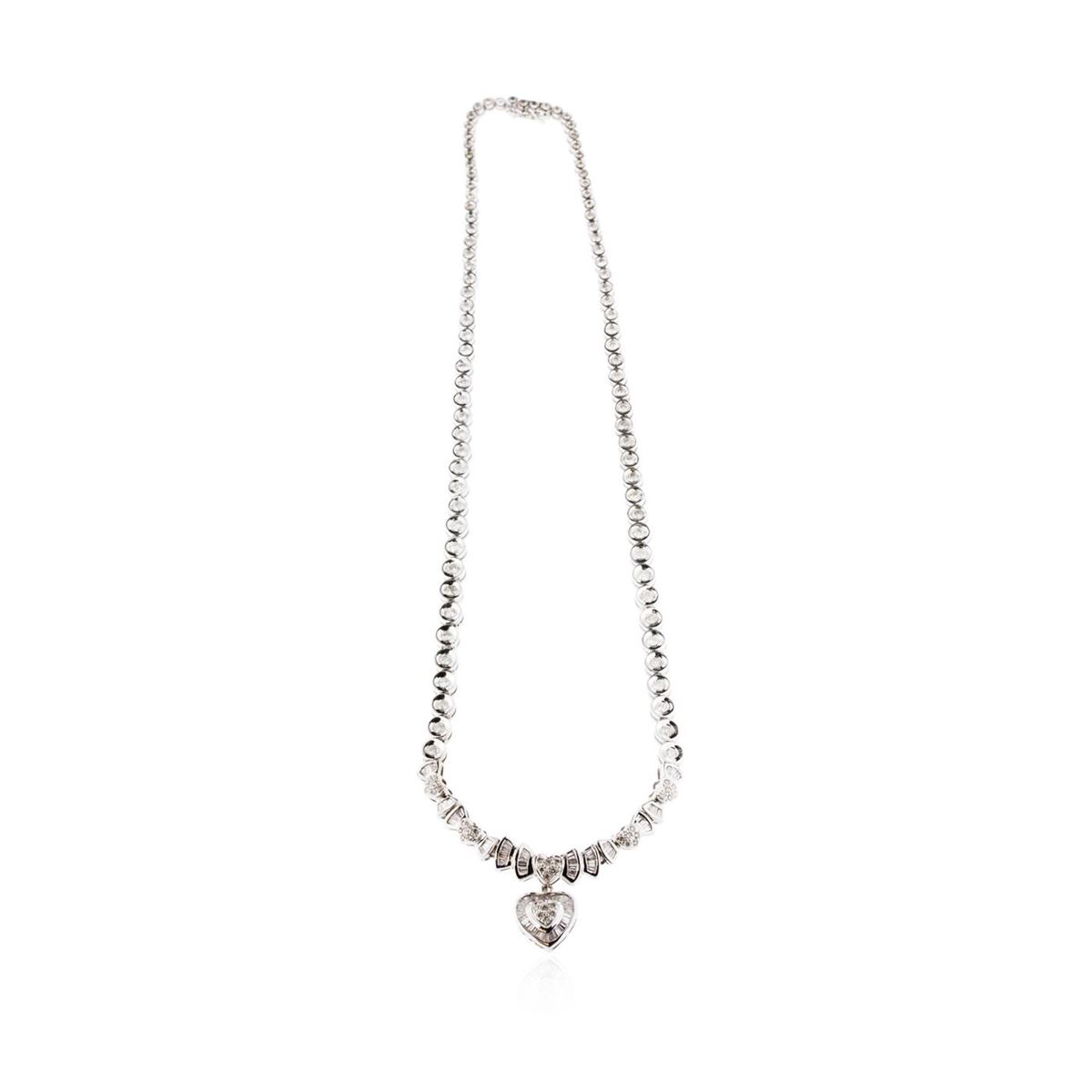 One electronically tested 18KT white gold Ladies combination cast & assembled heart necklace with a hidden box clasp with a bright polish finish. Measurements: 17.75" in length. Identified with markings of "18K". Condition is excellent. Containing: One Hundred Twenty-Eight bead set round brilliant cut diamonds, measuring 2.50 - 1.30 x 1.14mm (depth est.) approximate total weight of 128 Stones = 3.21ct. Clarity of I-1 to I-2, Color of H - J, Cut is Fair. Sixty-Four channel set baguette cut diamonds, measuring from 2.20 x 1.30 x 1.11mm (depth est.) to 3.00 x 2.00 x 1.71mm (depth est.) approximate total weight of 64 Stones = 3.05ct. Clarity of SI-2 to I-1, Color of G - I, Cut is Good. Total Weight of Diamonds 6.26ct. Total Weigh of Necklace 37.50gm. GGL Appraised at $21,980.00.