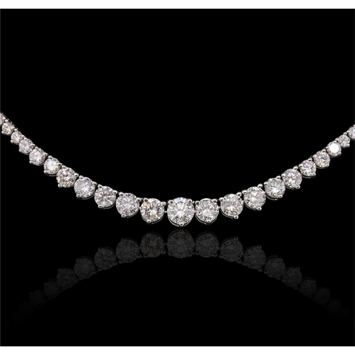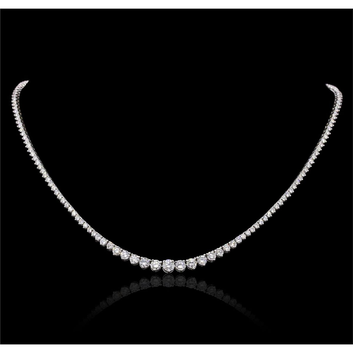 One electronically tested 18KT white gold ladies combination cast & assembled diamond necklace with a hidden box clasp with safety closer with a bright polish finish. Measurements: 6.50" in length. Identified with markings of "750". Condition is new. Containing: One Hundred Fifty-Four prong set round brilliant cut diamonds, measuring 2.00 - 2.00 x 1.20mm (depth est.) approximate total weight of 154 Stones = 4.50ct. . Clarity: SI-2 to I-1. Color: I - J, Cut is Good. Six prong set round brilliant cut diamonds, measuring 3.20 - 2.50 x 1.71mm (depth est.) approximate total weight of 6 Stones = 0.51ct. . Clarity: SI-1 to SI-2. Color: H - I, Cut is Good. Four prong set round brilliant cut diamonds, measuring 4.00 - 4.00 x 2.40mm (depth est.) approximate total weight of 4 Stones = 0.94ct. . Clarity: SI-1. Color: H, Cut is Good. One prong set round brilliant cut diamond, measuring 4.50 - 4.50 x 2.70mm (depth est.) approximate weight of 0.33ct. . Clarity: SI-2. Color: I, Cut is Very Good. All diamonds are graded in the mounting, unless otherwise stated.. Total Weight of Diamonds 6.28ct.. Total Weight of Necklace 15.70 grams. GGL Appraised at $23,255.00.