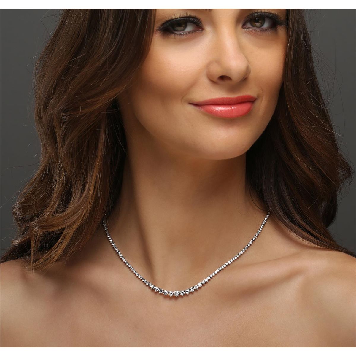 One electronically tested 18KT white gold ladies combination cast & assembled diamond necklace with a hidden box clasp with safety closer with a bright polish finish. Measurements: 6.50" in length. Identified with markings of "750". Condition is new. Containing: One Hundred Fifty-Four prong set round brilliant cut diamonds, measuring 2.00 - 2.00 x 1.20mm (depth est.) approximate total weight of 154 Stones = 4.50ct. . Clarity: SI-2 to I-1. Color: I - J, Cut is Good. Six prong set round brilliant cut diamonds, measuring 3.20 - 2.50 x 1.71mm (depth est.) approximate total weight of 6 Stones = 0.51ct. . Clarity: SI-1 to SI-2. Color: H - I, Cut is Good. Four prong set round brilliant cut diamonds, measuring 4.00 - 4.00 x 2.40mm (depth est.) approximate total weight of 4 Stones = 0.94ct. . Clarity: SI-1. Color: H, Cut is Good. One prong set round brilliant cut diamond, measuring 4.50 - 4.50 x 2.70mm (depth est.) approximate weight of 0.33ct. . Clarity: SI-2. Color: I, Cut is Very Good. All diamonds are graded in the mounting, unless otherwise stated.. Total Weight of Diamonds 6.28ct.. Total Weight of Necklace 15.70 grams. GGL Appraised at $23,255.00.