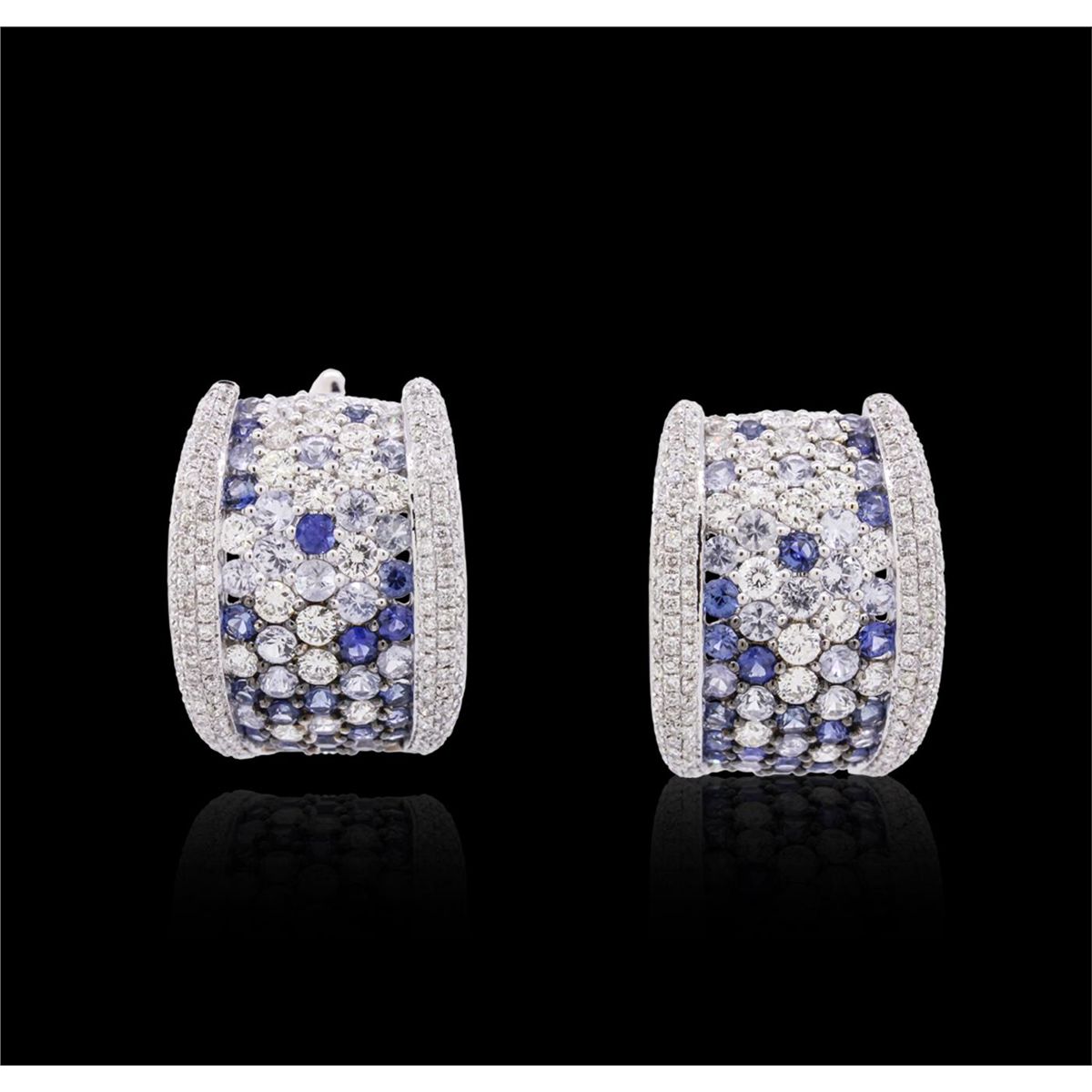 One pair electronically tested 18KT white gold ladies combination cast & assembled sapphire and diamond earrings with hinged clip backs with a bright polish finish. Identified with markings of "18K". Condition is new. Containing: Eighty prong set round modified brilliant cut natural blue sapphires, measuring 2.50 - 2.50 x 1.63 mm, approximate total weight of 6.40ct., clarity is eye clean, type II, medium light, very slightly grayish, blue color, (GIA B 4/3), cut is good. Thirty-Six prong set round brilliant cut diamonds, measuring 2.50 - 2.50 x 1.50mm (depth est.) approximate total weight of 36 Stones = 2.06ct. Clarity: SI-1 to SI-2. Color: I - K, Cut is Good. One Hundred Thirty-Eight prong set round brilliant cut diamonds, measuring 1.10 - 1.10 x 0.66mm (depth est.) approximate total weight of 138 Stones = 0.66ct. Clarity: I-1 to I-2. Color: I - J, Cut is Good. Colored gemstones are presumed to have been subjected to commonly used enhancement processes. All diamonds and colored gemstones are graded in the mounting, unless otherwise stated. Total Weight of Colored Stones 6.40ct. Total Weight of Diamonds 2.72ct. Total Weight of Earrings 15.00 grams. GGL Appraised at $11,120.00.