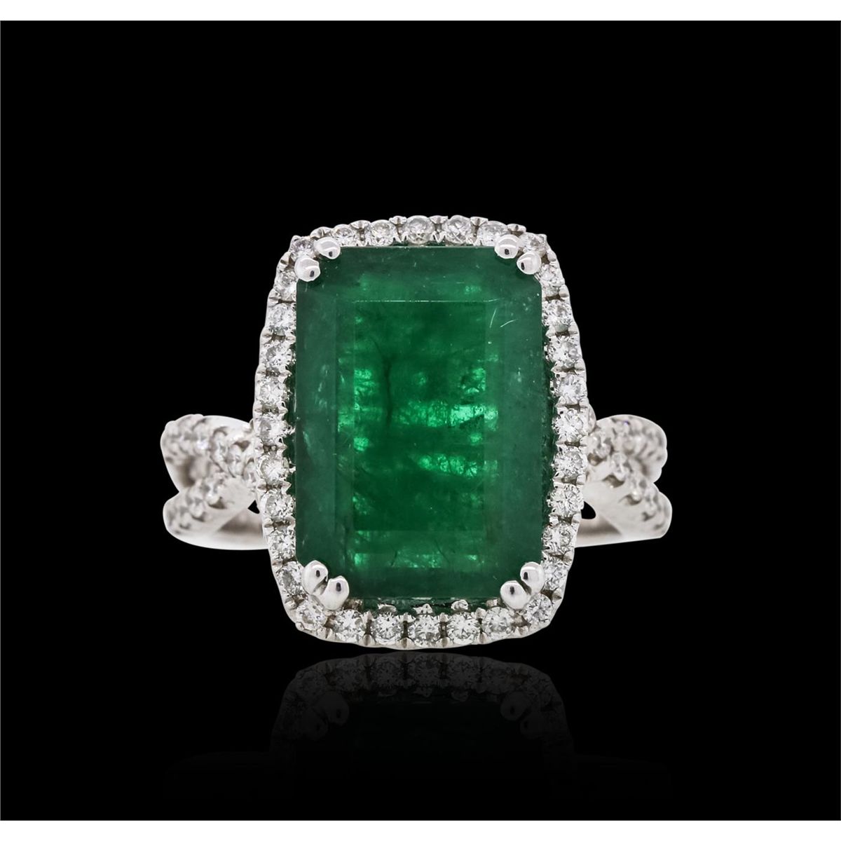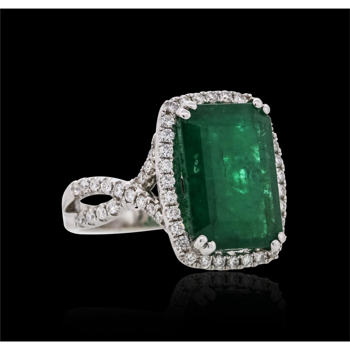 One ring featuring: 18KT white gold weighing 7.00 grams containing one emerald center stone with a total weight of 6.42ct and 64 round cut diamonds with a total weight of 0.62cts.