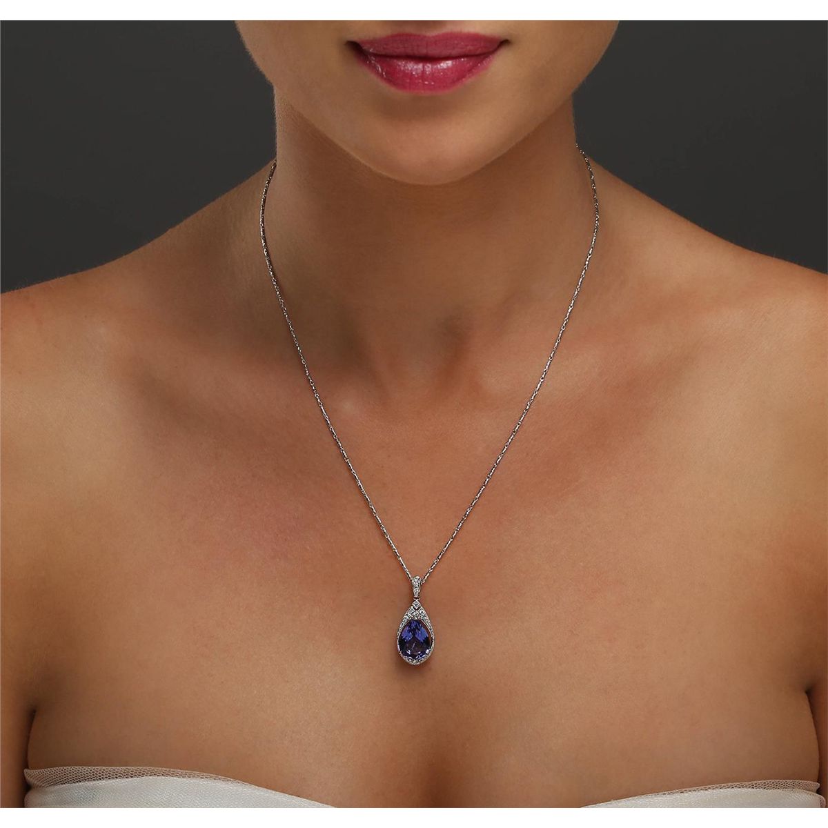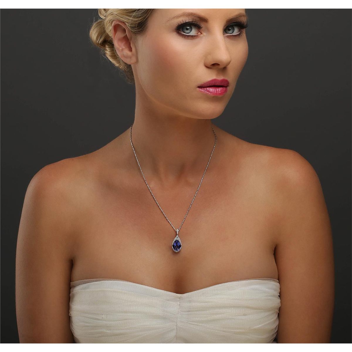 One electronically tested 18KT White Gold ladies cast & assembled tanzanite and diamond pendant with chain. The pendant features a tanzanite set within a stylized diamond bezel, completed by a diamond set bail. The pendant is supported by an eighteen inch length 14KT White Gold designer style chain, terminating in a lobster claw clasp. Bright polish finish with milgrain detailing. Identified with markings of "18K 750". Condition is new, good workmanship. Containing: One prong set pear brilliant cut natural tanzanite, measuring 13.50 x 10.20 x 6.55mm, 8% bulge factor, approximate weight of 6.53ct., clarity is eye clean, type I, medium dark, very slightly grayish, bluish violet color, (GIA bV 6/3), cut is good. Transmitting light with no distortion, transparent. Colored Stone Grading Report attached. Graded in the setting. Tanzanite is a very rare gemstone that is only found in the country of Tanzania. Originally discovered in 1967. Tiffany & Company, named the stone Tanzanite. It is found in the Usumburu Mountains that border the Umba Valley of northern Tanzania. Tanzanite occurs in gray, brown, violet, blue, reddish-purple, & green. The gem is interesting because of its exceptional pleochroism. Rotated in different directions a tanzanite will exhibit multiple changes of color. Tanzanite has a low tolerance to ultrasonic cleaning, and should not be cleaned using this method. Thirty bead set round brilliant cut diamonds approximate total weight of 30 Stones = 0.25ct. Graded in the setting. Clarity: VS-2 to SI-2. Color: G - I. Total Weight of Colored Stones 6.53ct. Total Weight of Diamonds 0.25ct. Total Weight of Pendant With Chain 7.77 grams. AIG Appraised at $18,940.00.