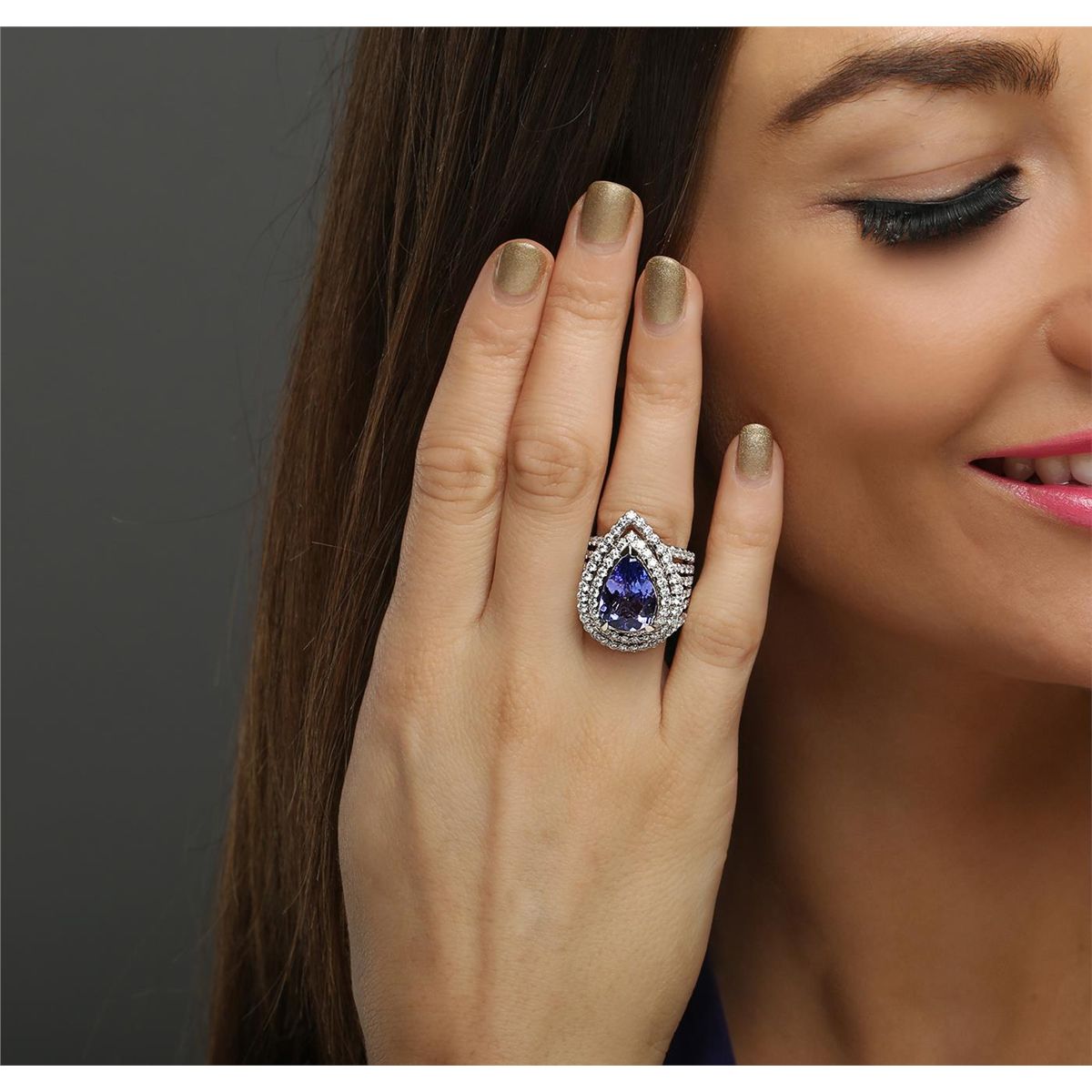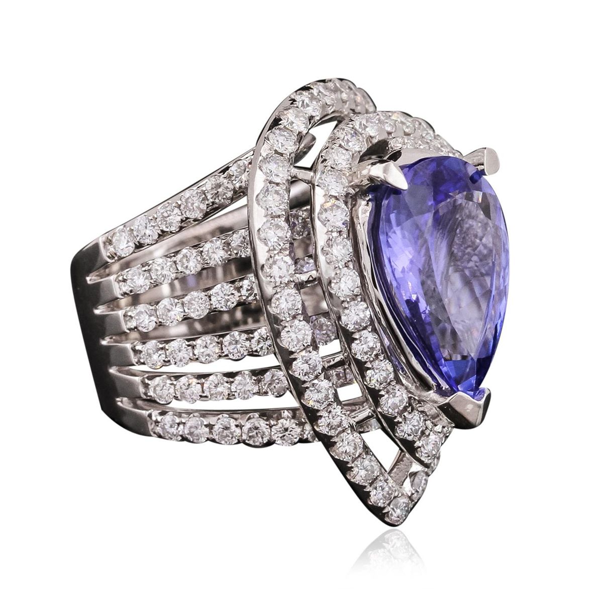 One electronically tested 18KT white gold ladies combination cast & assembled engagement ring with a bright polish finish. Identified with markings of "750". Condition is new. Containing: One prong set pear modified brilliant cut natural tanzanite, measuring 15.00 x 10.00 x 6.50mm, approximate weight of 6.53ct., clarity is eye clean, type I, medium light, very slightly grayish, bluish violet color, (GIA bV 4/3), cut is good. One Hundred Fifty-Six prong set round brilliant cut diamonds, measuring 1.80 - 1.80 x 1.08mm (depth est.) approximate total weight of 156 Stones = 3.21ct. Clarity: SI-1 to SI-2. Color: H - I, Cut is Good. Colored gemstones are presumed to have been subjected to commonly used enhancement processes. All diamonds and colored gemstones are graded in the mounting, unless otherwise stated. Total Weight of Colored Stones 6.53ct. Total Weight of Diamonds 3.21ct. Total Weight of Ring 19.60 grams. GGL Appraised at $24,540.00.