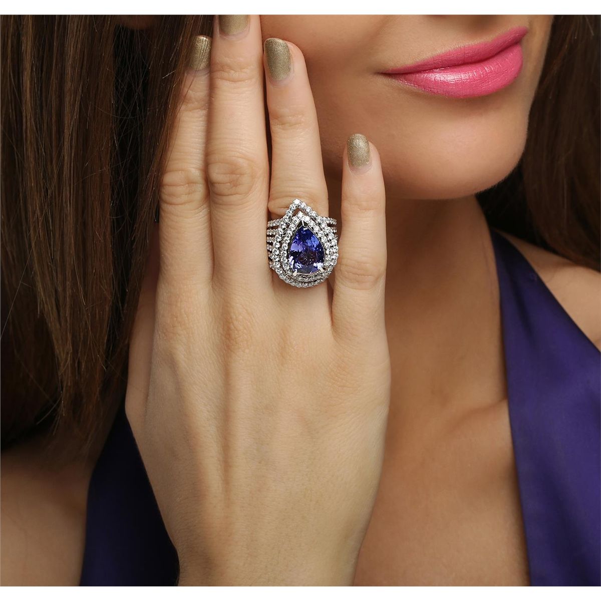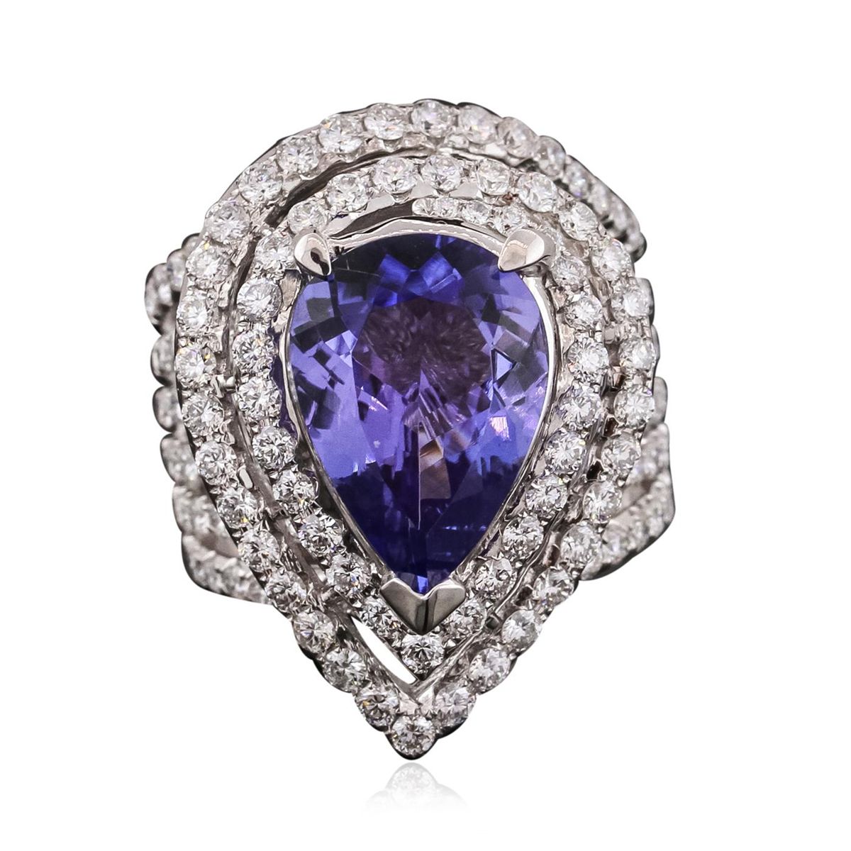 One electronically tested 18KT white gold ladies combination cast & assembled engagement ring with a bright polish finish. Identified with markings of "750". Condition is new. Containing: One prong set pear modified brilliant cut natural tanzanite, measuring 15.00 x 10.00 x 6.50mm, approximate weight of 6.53ct., clarity is eye clean, type I, medium light, very slightly grayish, bluish violet color, (GIA bV 4/3), cut is good. One Hundred Fifty-Six prong set round brilliant cut diamonds, measuring 1.80 - 1.80 x 1.08mm (depth est.) approximate total weight of 156 Stones = 3.21ct. Clarity: SI-1 to SI-2. Color: H - I, Cut is Good. Colored gemstones are presumed to have been subjected to commonly used enhancement processes. All diamonds and colored gemstones are graded in the mounting, unless otherwise stated. Total Weight of Colored Stones 6.53ct. Total Weight of Diamonds 3.21ct. Total Weight of Ring 19.60 grams. GGL Appraised at $24,540.00.