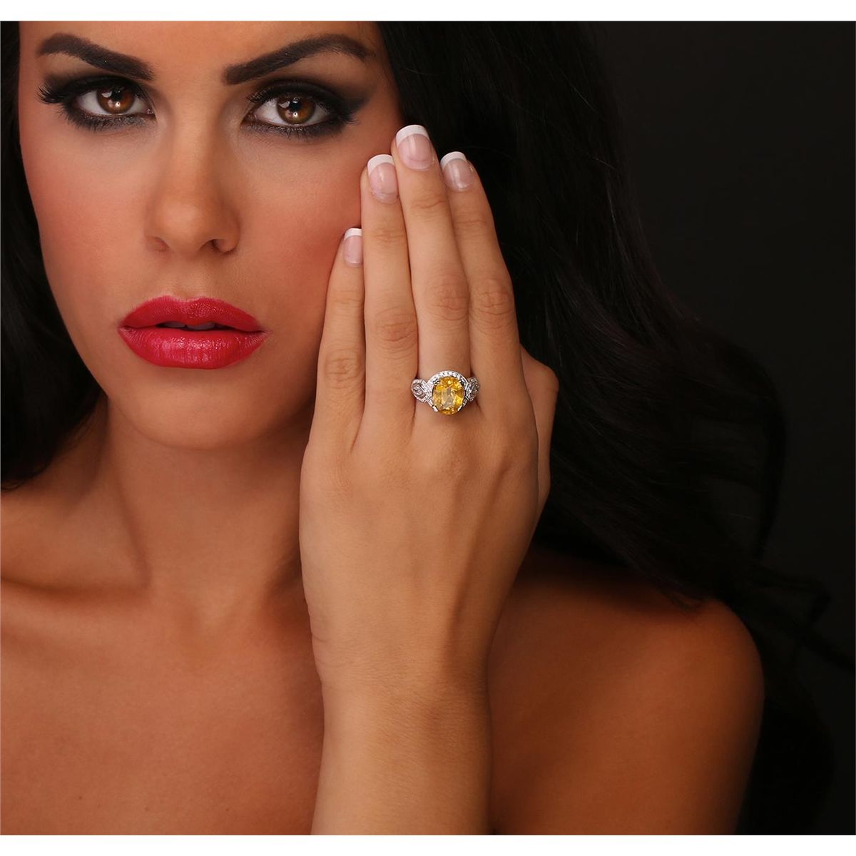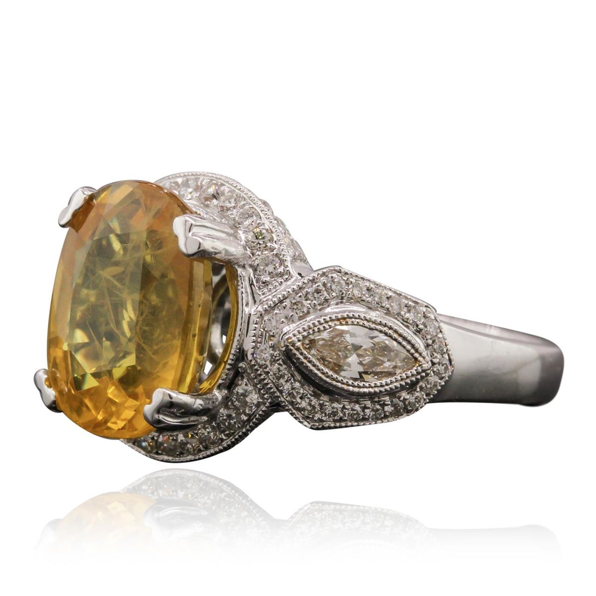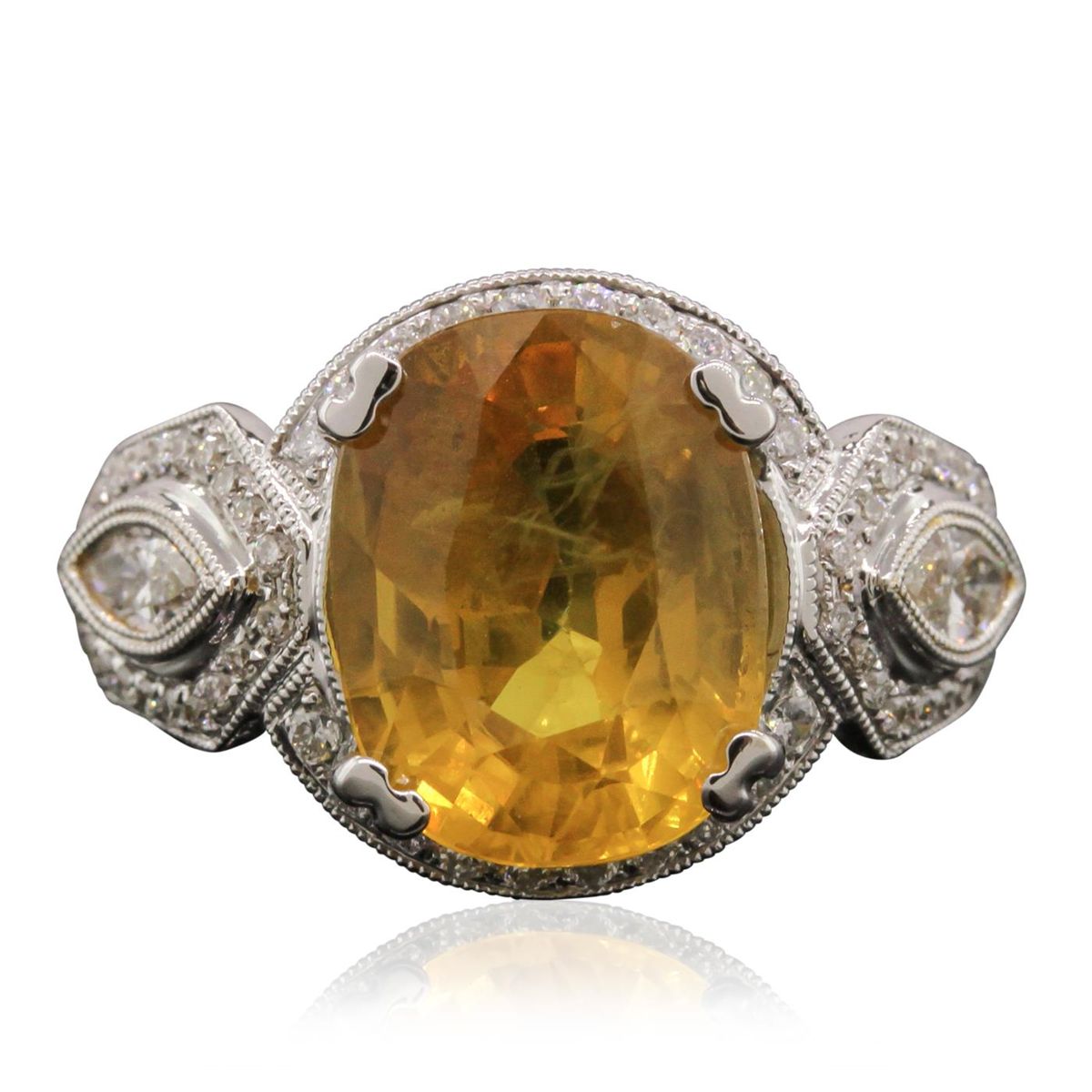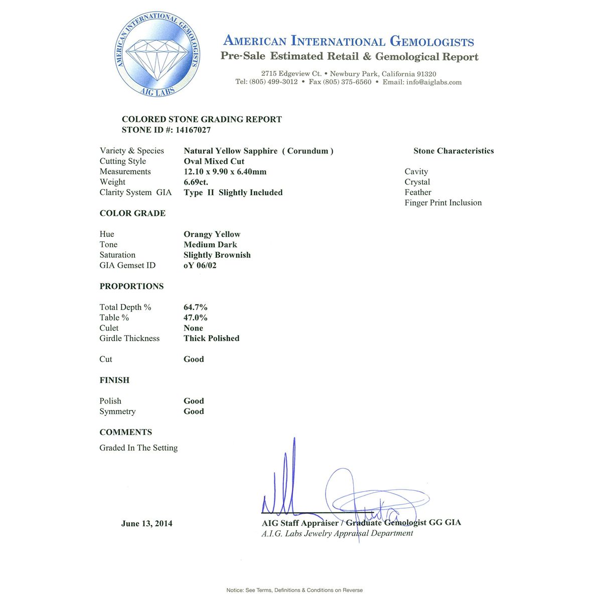 One electronically tested 18KT white gold ladies cast yellow sapphire and diamond ring. Condition is new, good workmanship. The featured yellow sapphire is set within a diamond bezel supported by elaborate diamond set shoulders, completed by a two and one-half millimeter wide band. Bright polish finish with migraine detailing. Identified with markings of "18K 750". Containing: One prong set oval mixed cut natural yellow sapphire, measuring 12.10 x 9.90 x 6.40mm, 8%. bulge factor, approximate weight of 6.69ct., clarity is slightly included, type II, medium dark, slightly brownish, orangy yellow color, (GIA oY 6/2), cut is good. Transmitting light with a minimum of distortion, transparent. Naturally occurring internal & external characteristics are present. Colored Stone Grading Report attached. Graded in the setting. Two bezel set marquise shaped cut diamonds, measuring 6.00 x 3.00 x 1.50mm (depth est.) approximate. Total Weight of 2 Stones = 0.41ct. Faint brown secondary color throughout. Graded in the setting. Clarity: VS-1 to VS-2. Color: J - K One Hundred Thirty bead set round brilliant cut diamonds, measuring 1.30 - 1.00 x 0.69mm (depth est.) approximate. Total Weight of 130 Stones = 0.81ct. Graded in the setting. Clarity: VS-2 to SI-2. Color: G - I. Total Weight of Colored Stones 6.69ct. Total Weight of Diamonds 1.22ct. Total Weight of Ring 10.79 grams. AIG Appraised at $22,855.00.