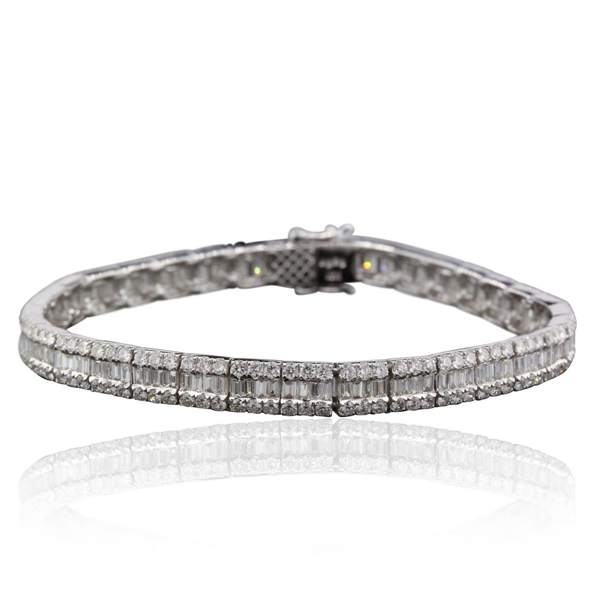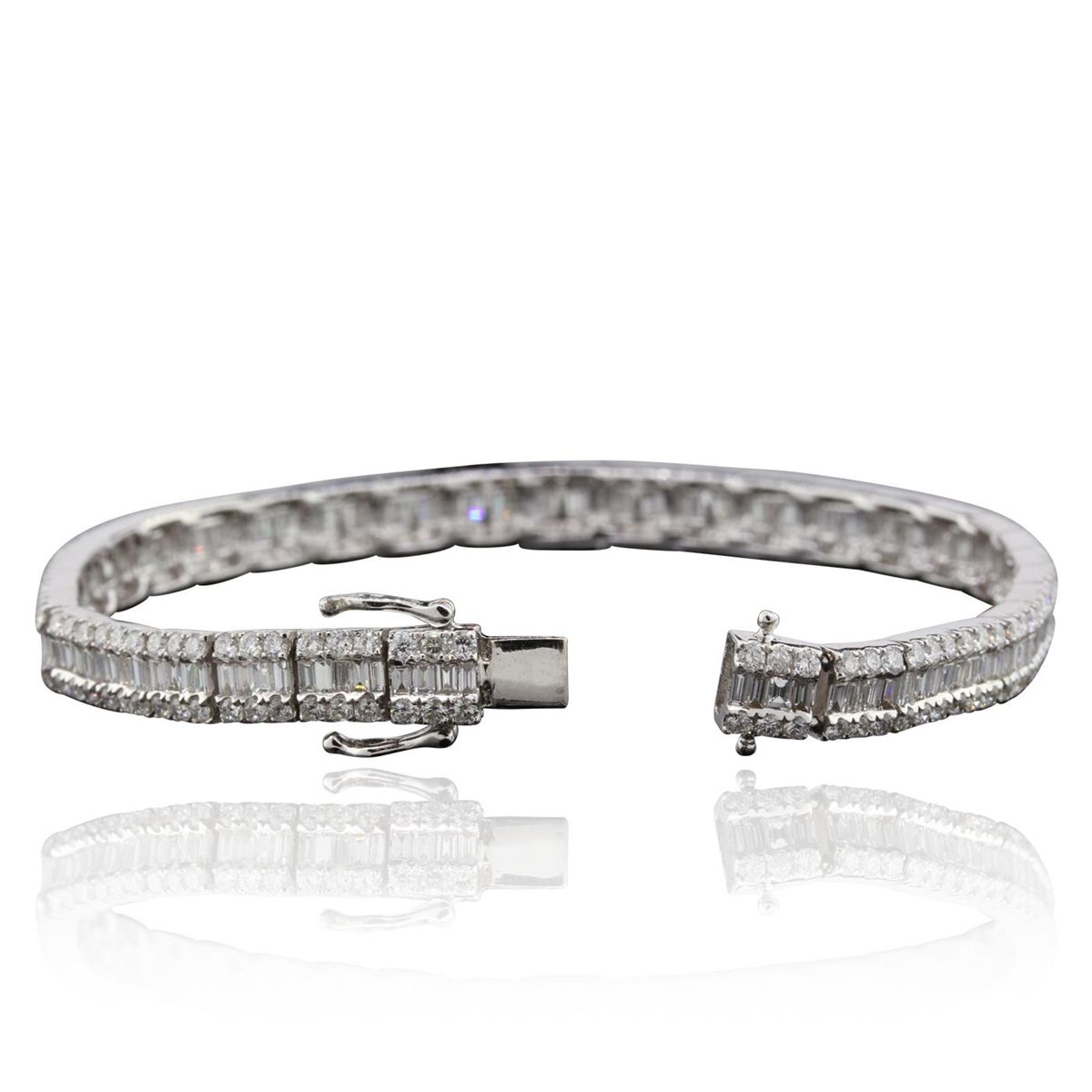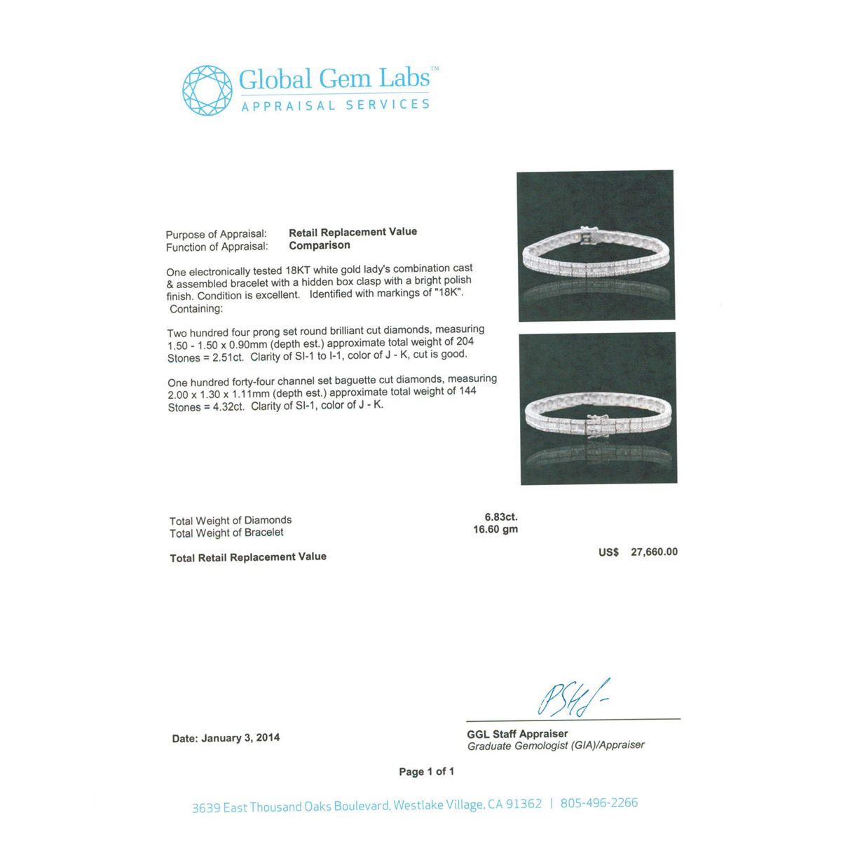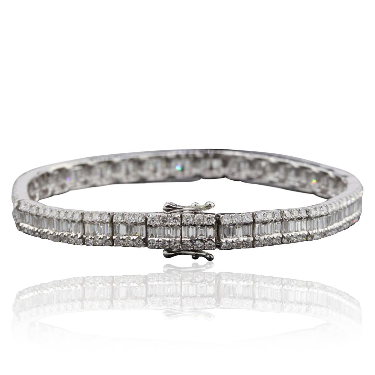 One electronically tested 18KT white gold Ladies combination cast & assembled bracelet with a hidden box clasp with a bright polish finish. Identified with markings of "18K". Condition is excellent. Containing: Two Hundred Four prong set round brilliant cut diamonds, measuring 1.50 - 1.50 x 0.90mm (depth est.) approximate total weight of 204 Stones = 2.51ct. Clarity of SI-1 to I-1, Color of J - K, Cut is Good. One Hundred Forty-Four channel set baguette cut diamonds, measuring 2.00 x 1.30 x 1.11mm (depth est.) approximate total weight of 144 Stones = 4.32ct. Clarity of SI-1, Color of J - K. Total Weight of Diamonds 6.83ct. Total Weight of Bracelet 16.60gm. GGL Appraised at $27,660.00.