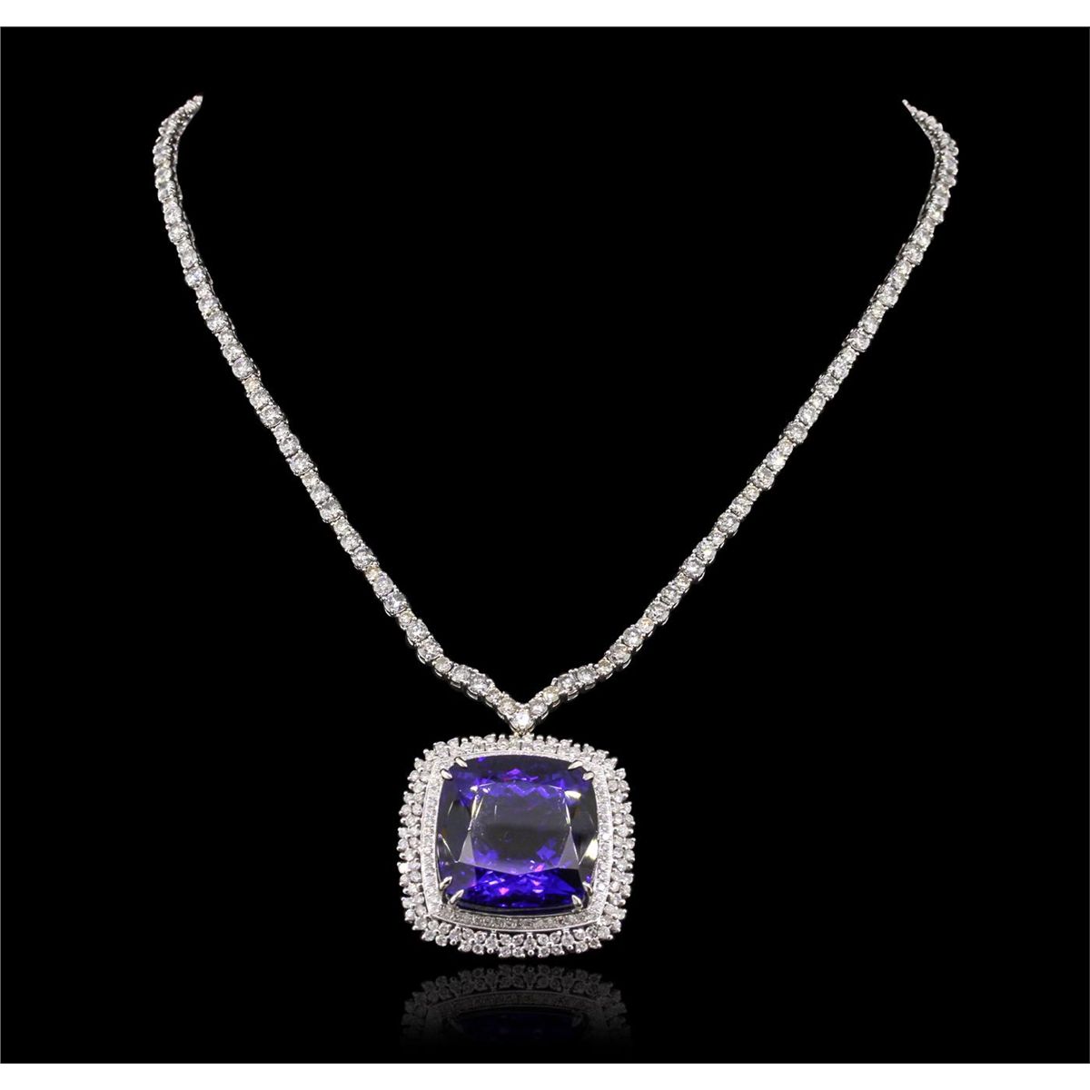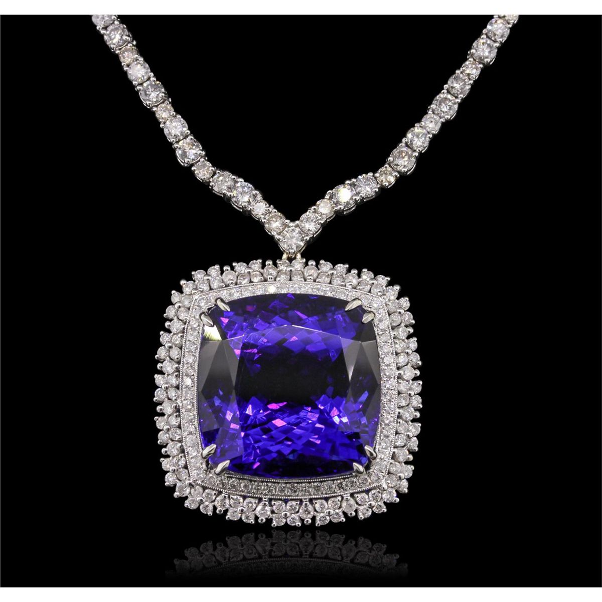 One electronically tested 18KT white gold Ladies combination cast & assembled pendant & chain 16.0 inch long, medium with a hidden box clasp with a bright polish finish. Condition is new. Identified with markings of "750". Containing: One prong set square cushion modified brilliant cut natural tanzanite, measuring 22.94 x 22.42 x 14.74mm, exact weight 68.80ct., clarity is eye clean, type I, medium, moderately strong, bluish violet color, (GIA bV 5/4), cut is very good. GIA Report: 6167000228. Forty-Six prong set round brilliant cut diamonds, measuring 2.50 - 2.50 x 1.50mm (depth est.) approximate. Total Weight of 46 Stones = 2.63ct. . Clarity: I-1 to I-2. Color: I - K, Cut is Good. Ninety-One prong set round brilliant cut diamonds, measuring 2.90 - 2.70 x 1.68mm (depth est.) approximate. Total Weight of 91 Stones = 7.31ct. . Clarity: I-2 to I-3. Color: J - K, Cut is Good. Sixty prong set round brilliant cut diamonds, measuring 1.30 - 1.30 x 0.78mm (depth est.) approximate. Total Weight of 60 Stones = 0.48ct. . Clarity: I-1 to I-2. Color: H - I, Cut is Good. One Hundred prong set round brilliant cut diamonds, measuring 1.60 - 1.60 x 0.96mm (depth est.) approximate. Total Weight of 100 Stones = 1.49ct. . Clarity: I-1 to I-2. Color: I - J, Cut is Good. Total Weight of Colored Stones 68.80ct. Total Weight of Diamonds 11.90ct. Total Weight of Pendant & Chain 48.10 grams. GGLAppraised at $113,430.00.