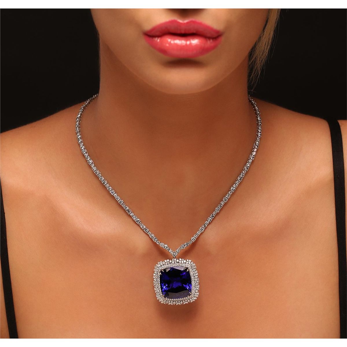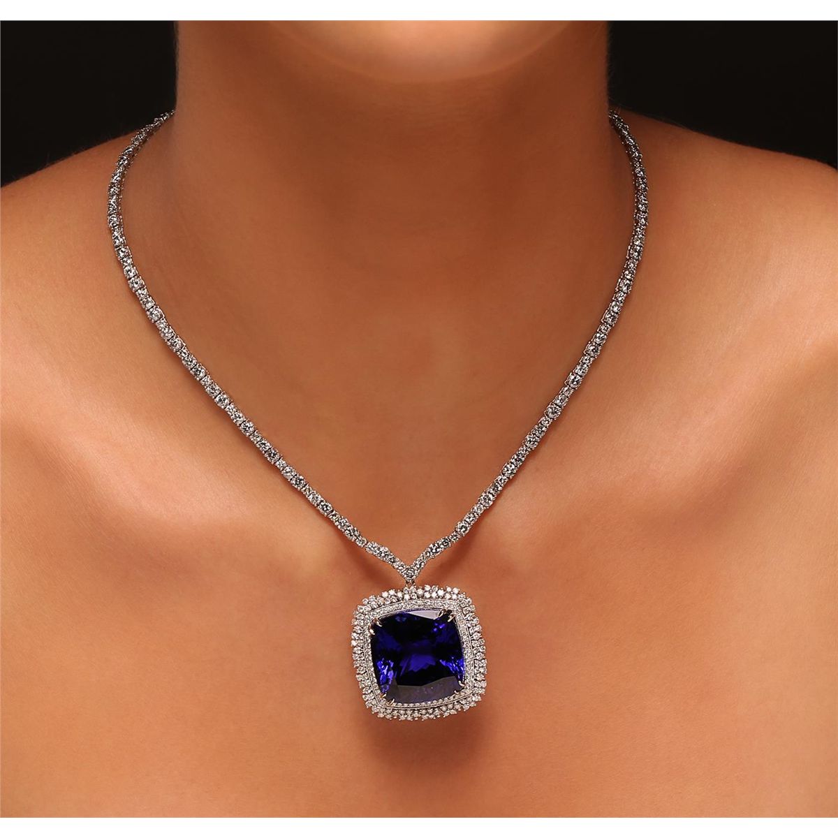 One electronically tested 18KT white gold Ladies combination cast & assembled pendant & chain 16.0 inch long, medium with a hidden box clasp with a bright polish finish. Condition is new. Identified with markings of "750". Containing: One prong set square cushion modified brilliant cut natural tanzanite, measuring 22.94 x 22.42 x 14.74mm, exact weight 68.80ct., clarity is eye clean, type I, medium, moderately strong, bluish violet color, (GIA bV 5/4), cut is very good. GIA Report: 6167000228. Forty-Six prong set round brilliant cut diamonds, measuring 2.50 - 2.50 x 1.50mm (depth est.) approximate. Total Weight of 46 Stones = 2.63ct. . Clarity: I-1 to I-2. Color: I - K, Cut is Good. Ninety-One prong set round brilliant cut diamonds, measuring 2.90 - 2.70 x 1.68mm (depth est.) approximate. Total Weight of 91 Stones = 7.31ct. . Clarity: I-2 to I-3. Color: J - K, Cut is Good. Sixty prong set round brilliant cut diamonds, measuring 1.30 - 1.30 x 0.78mm (depth est.) approximate. Total Weight of 60 Stones = 0.48ct. . Clarity: I-1 to I-2. Color: H - I, Cut is Good. One Hundred prong set round brilliant cut diamonds, measuring 1.60 - 1.60 x 0.96mm (depth est.) approximate. Total Weight of 100 Stones = 1.49ct. . Clarity: I-1 to I-2. Color: I - J, Cut is Good. Total Weight of Colored Stones 68.80ct. Total Weight of Diamonds 11.90ct. Total Weight of Pendant & Chain 48.10 grams. GGL Appraised at $113,430.00.