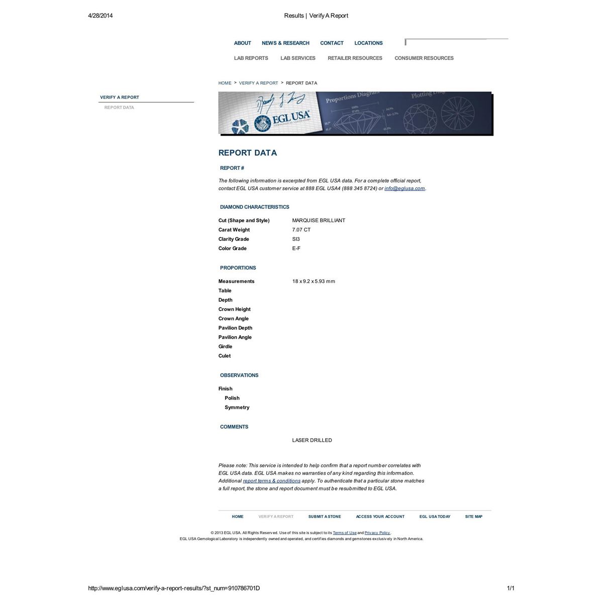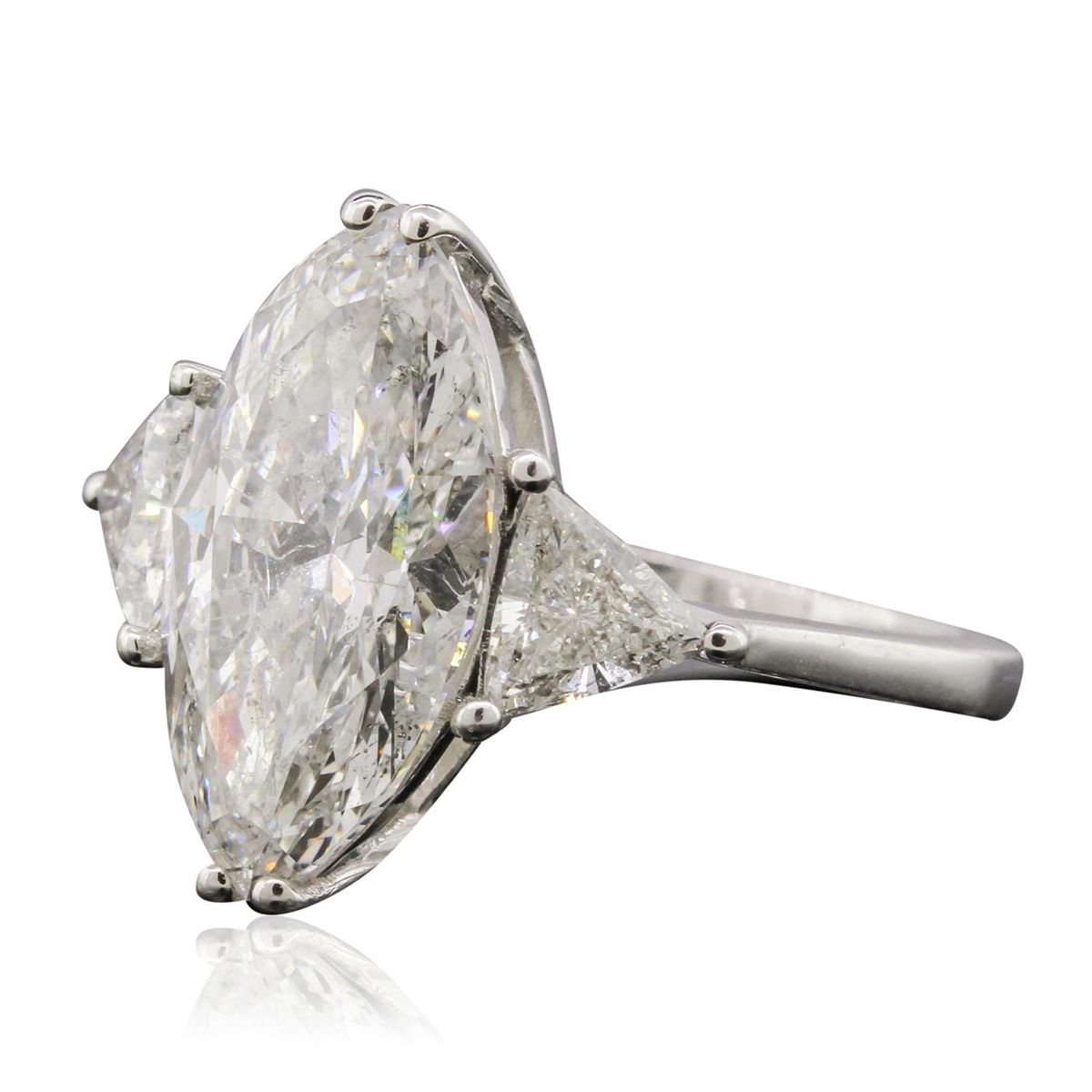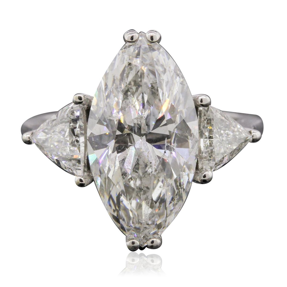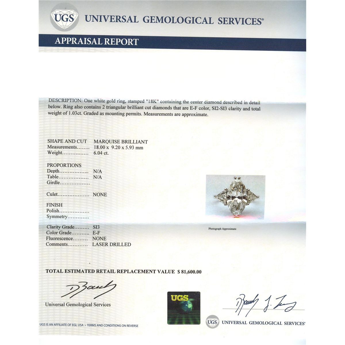 One white gold ring, stamped "18K" containing the center diamond described in detail below. Ring also contains 2 triangular brilliant cut diamonds that are E-F color, SI2-SI3 clarity and total weight of 1.03ct. Graded as mounting permits. Measurements are appropriate. Shape and cut marquise brilliant. Measurements 18.00 x 9.20 x 5.93mm. Weight 6.04ct. Clarity Grade SI3. Color Grade E-F. Fluorescence None. Comments Laser Drilled. UGS Appraised at $81,600.00.