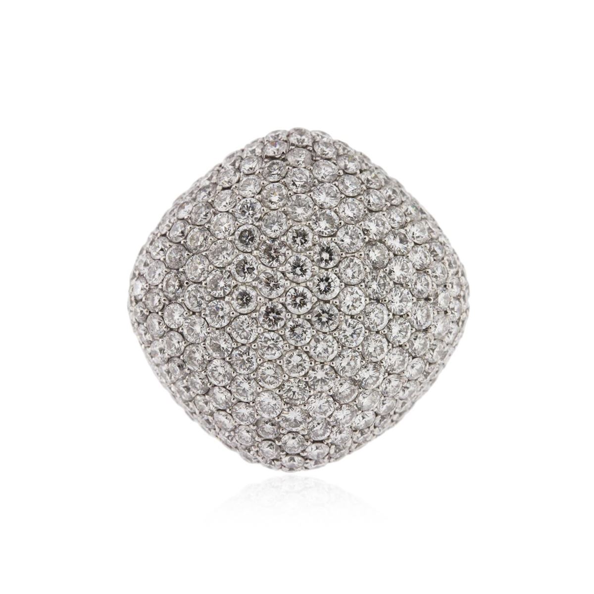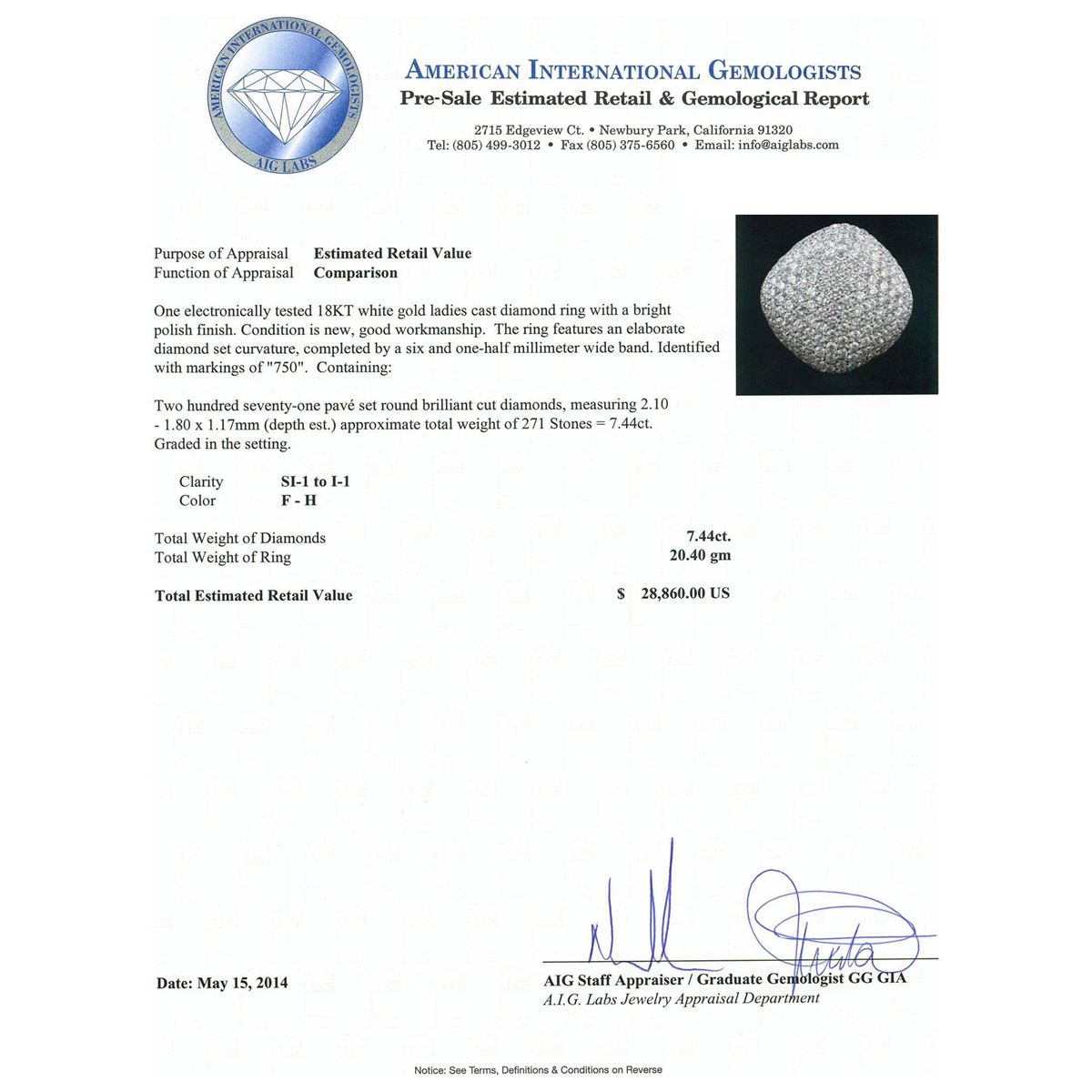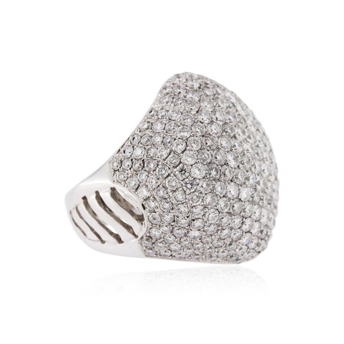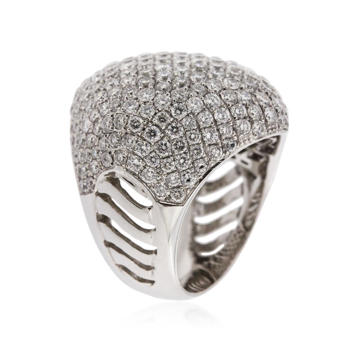 One electronically tested 18KT white gold ladies cast diamond ring with a bright polish finish. Condition is new, good workmanship. The ring features an elaborate diamond set curvature, completed by a six and one-half millimeter wide band. Identified with markings of "750". Containing: Two Hundred Seventy-One pav‚ set round brilliant cut diamonds, measuring 2.10 - 1.80 x 1.17mm (depth est.) approximate. Total Weight of 271 Stones = 7.44ct. Graded in the setting. Clarity: SI-1 to I-1. Color: F - H. Total Weight of Diamonds 7.44ct. Total Weight of Ring 20.40 grams. AIG Appraised at $28,860.00.