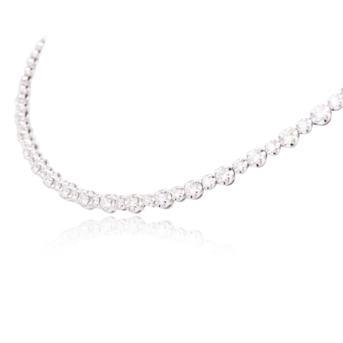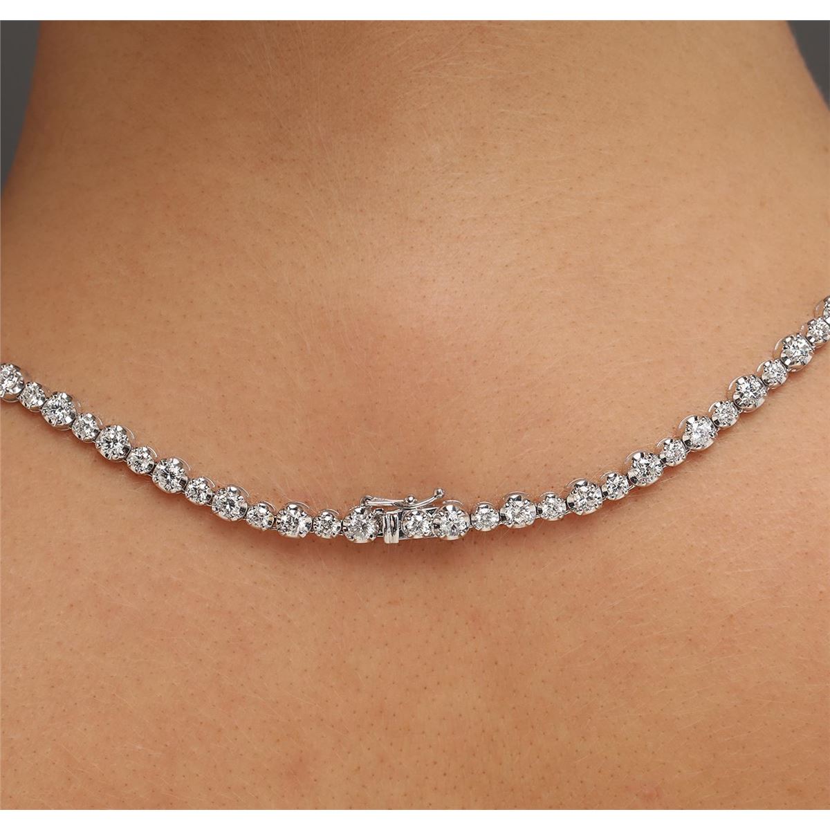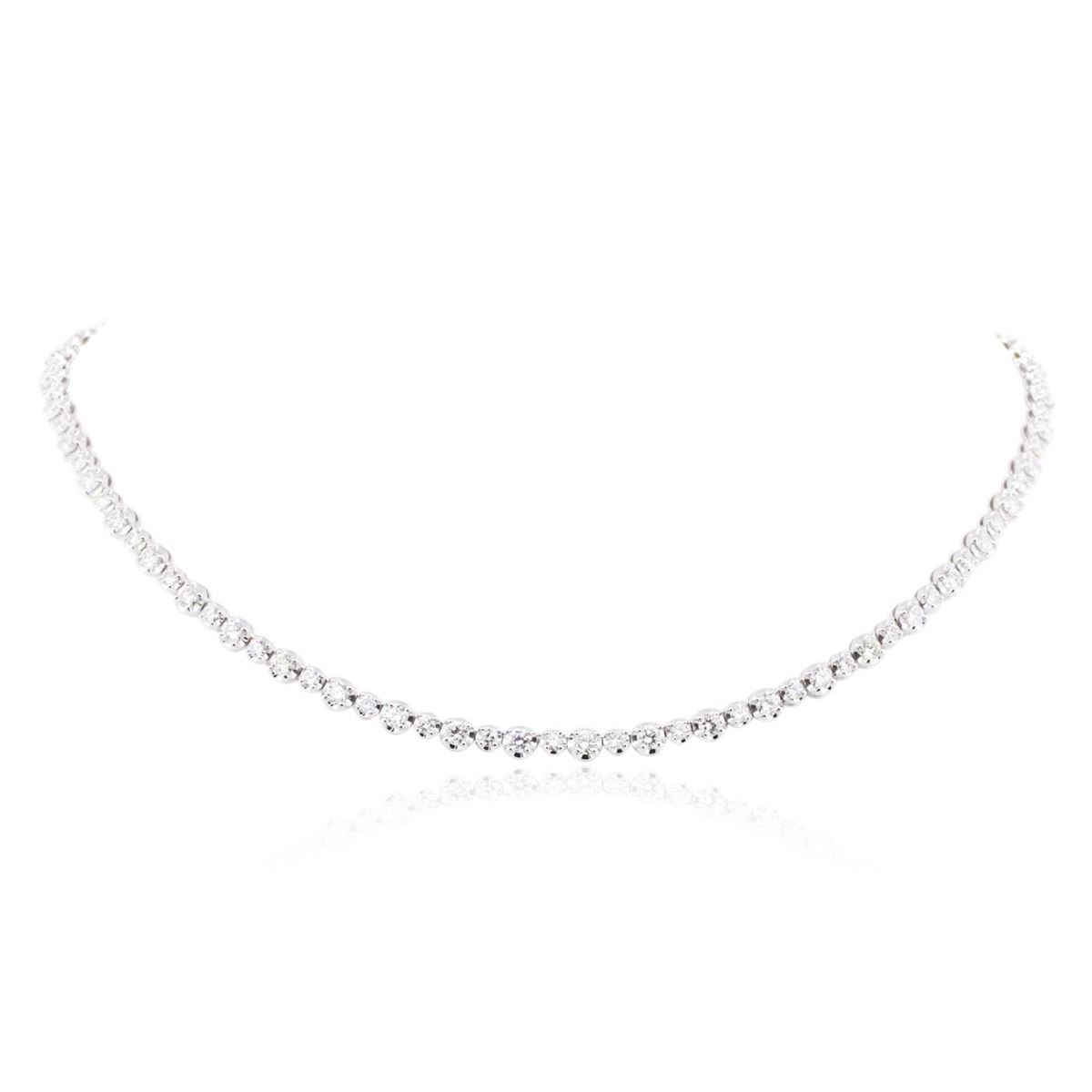 One electronically tested 18KT white gold ladies cast diamond necklace with a hidden box clasp with a bright polish finish. Measurements: 16.5" in length. Identified with markings of "750". Condition is new. Containing: One Hundred prong set round brilliant cut diamonds, measuring 3.00 - 2.50 x 1.65mm (depth est.) approximate total weight of 100 Stones = 7.61ct. Clarity: SI-2 to I-1. Color: J - K, Cut is Good. All diamonds are graded in the mounting, unless otherwise stated. Total Weight of Diamonds 7.61ct. Total Weight of Necklace 25.40 grams. GGL Appraised at $24,720.00.