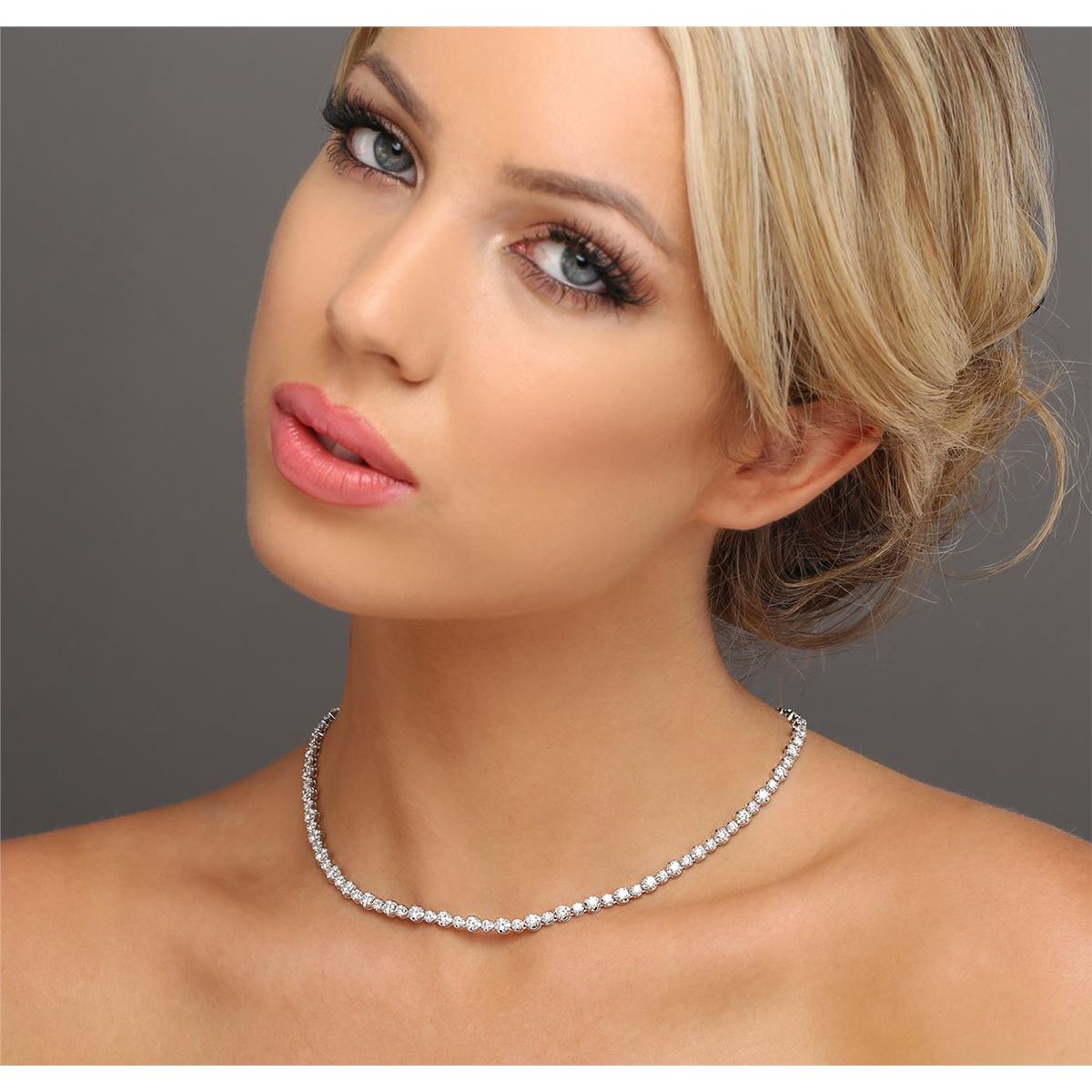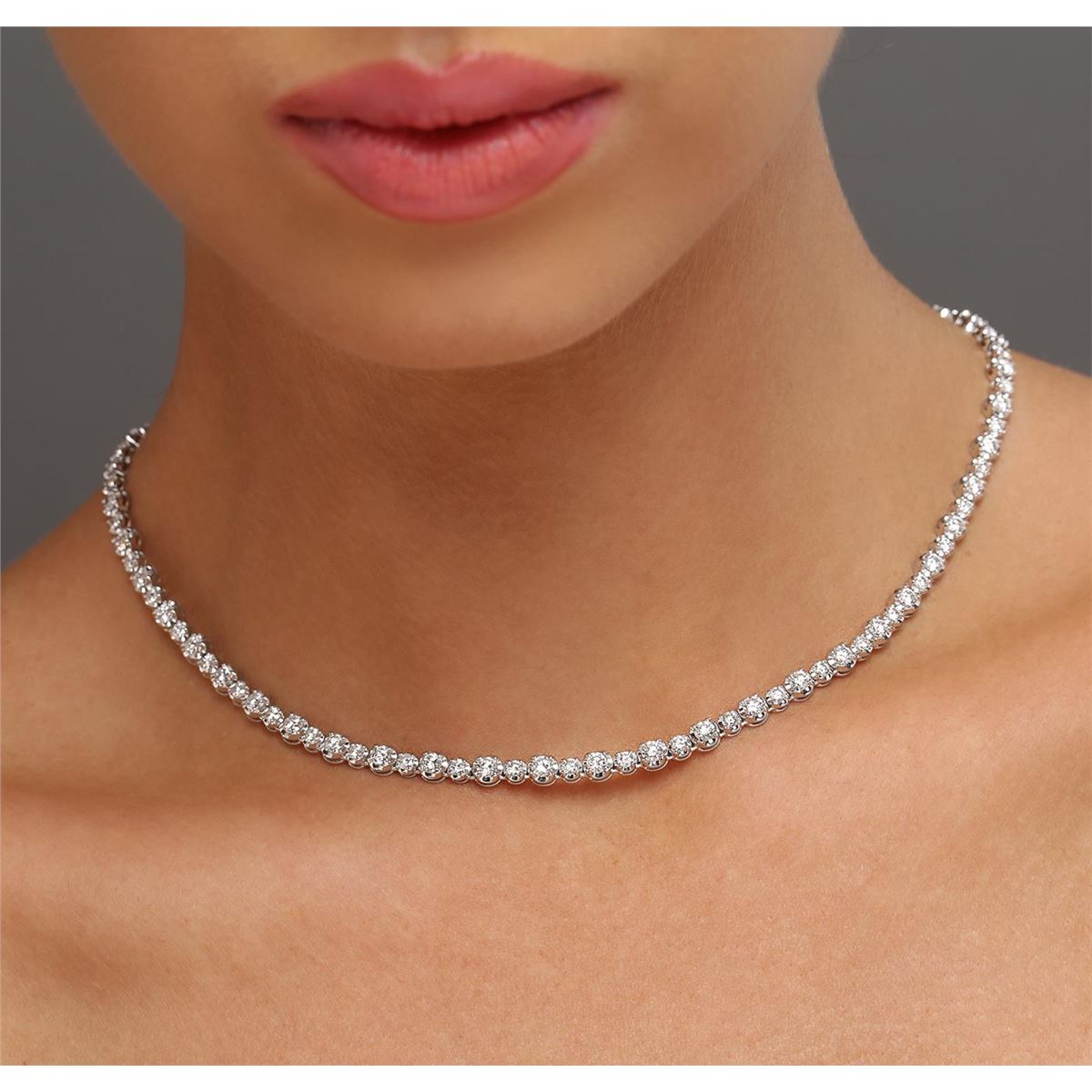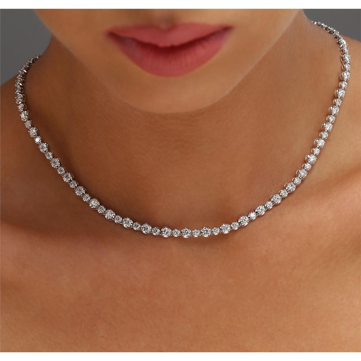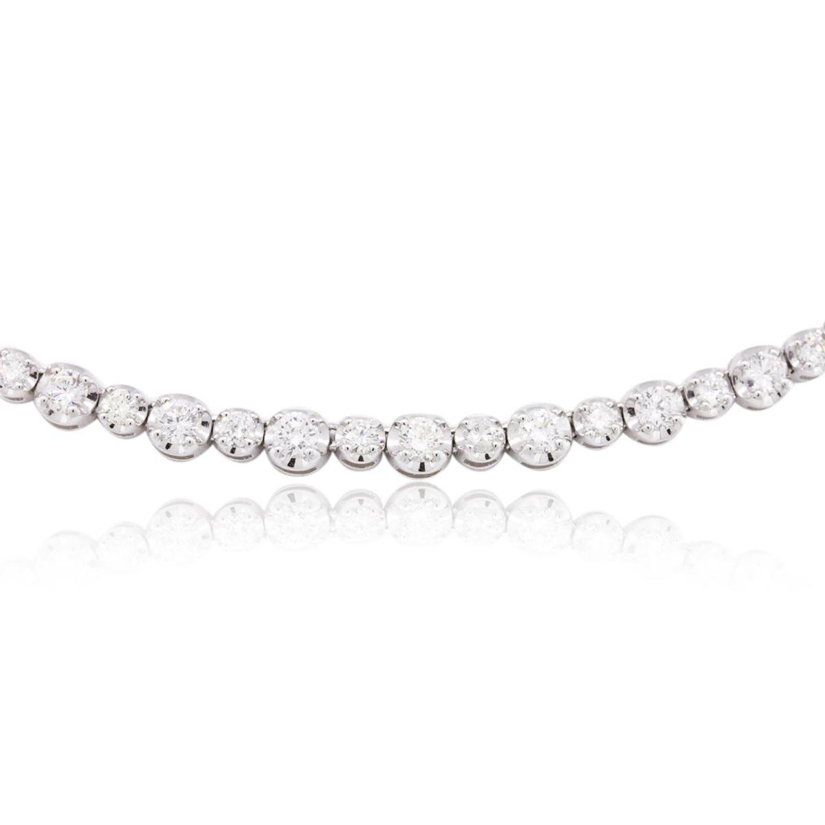 One electronically tested 18KT white gold ladies cast diamond necklace with a hidden box clasp with a bright polish finish. Measurements: 16.5" in length. Identified with markings of "750". Condition is new. Containing: One Hundred prong set round brilliant cut diamonds, measuring 3.00 - 2.50 x 1.65mm (depth est.) approximate total weight of 100 Stones = 7.61ct. Clarity: SI-2 to I-1. Color: J - K, Cut is Good. All diamonds are graded in the mounting, unless otherwise stated. Total Weight of Diamonds 7.61ct. Total Weight of Necklace 25.40 grams. GGL Appraised at $24,720.00.
