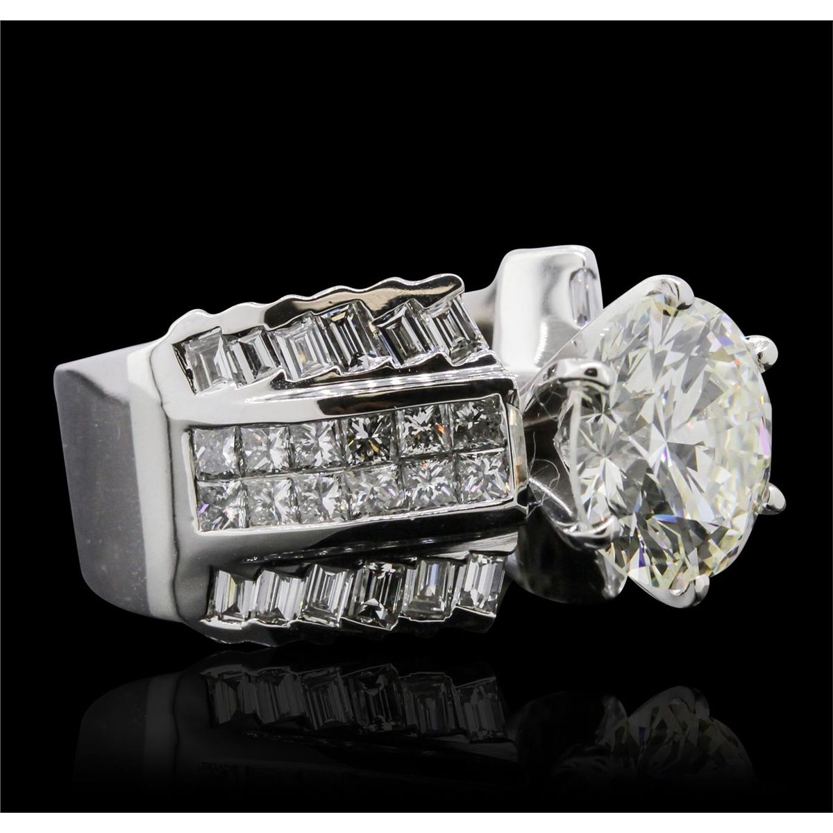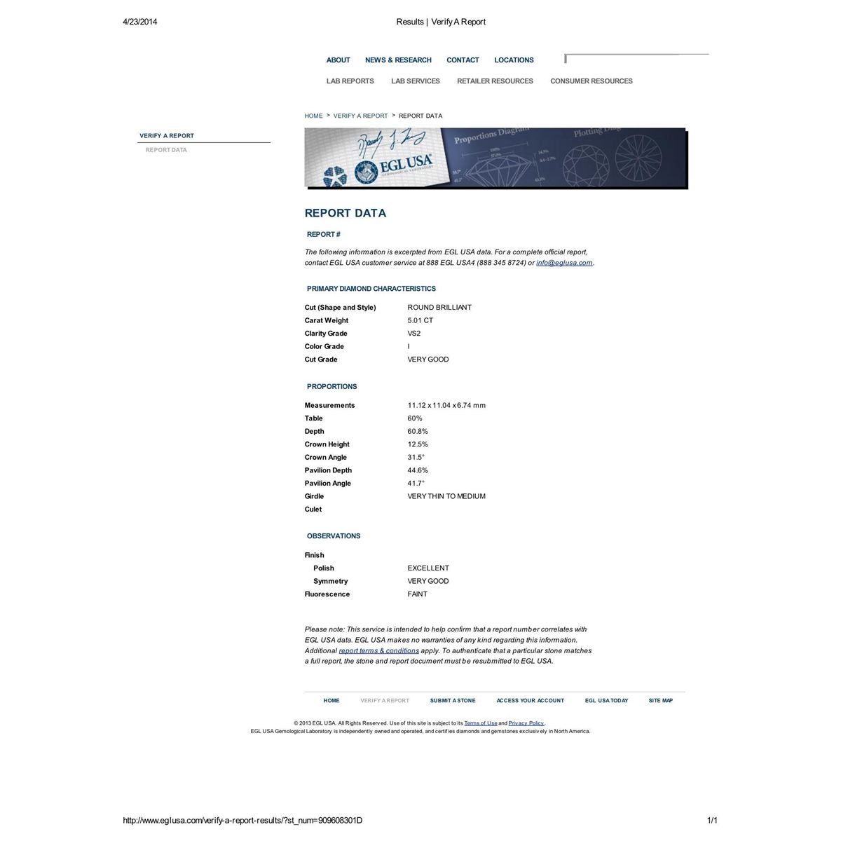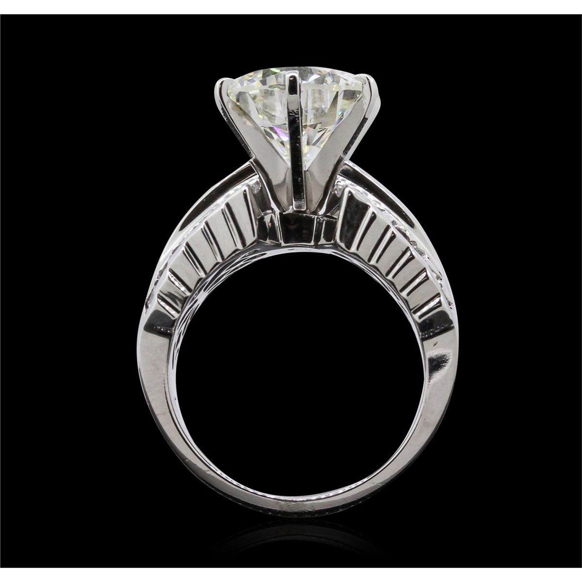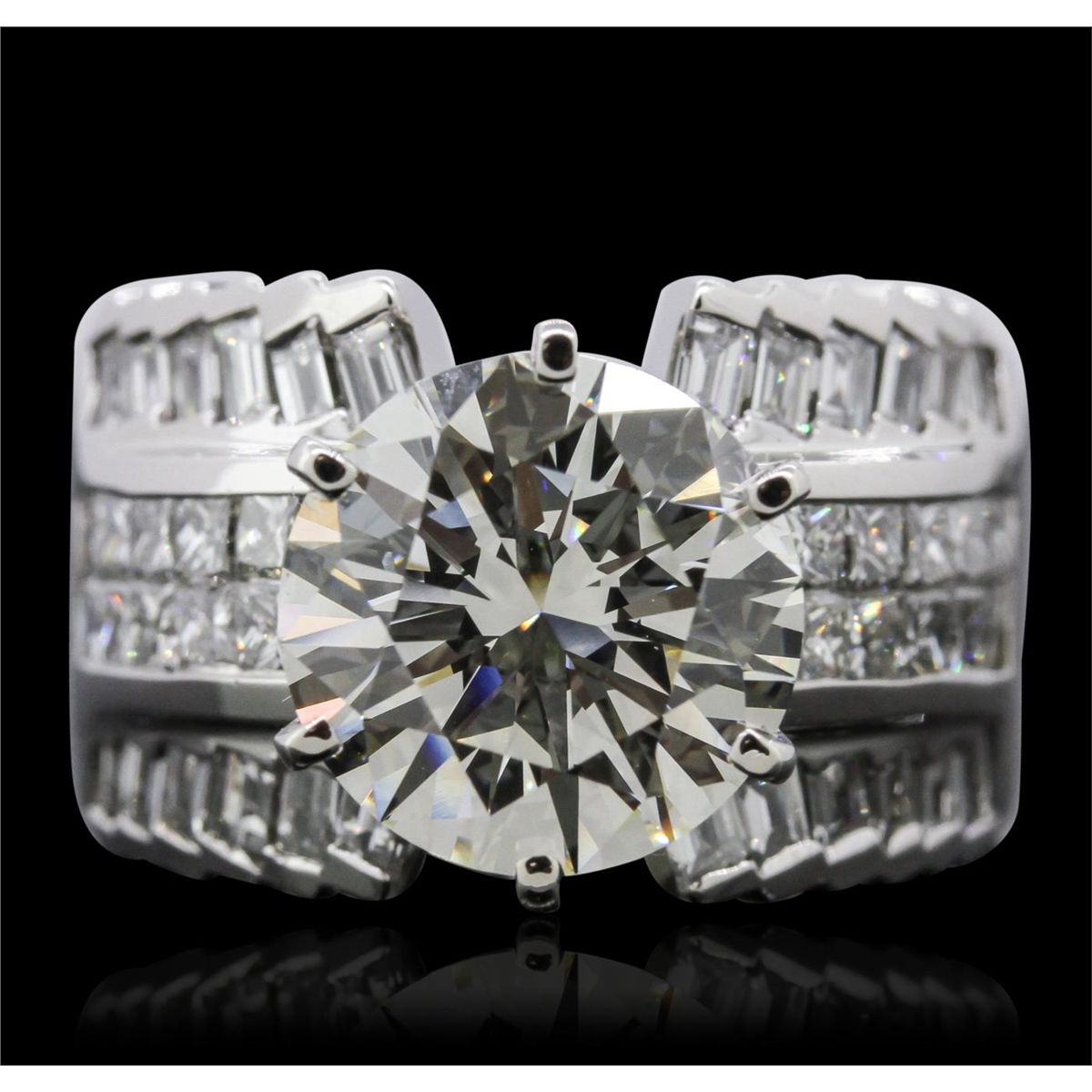 One electronically tested 18KT White Gold ladies cast & assembled diamond unity ring with a bright polish finish. Condition is new, good workmanship. The featured diamond is cathedral set and supported by elaborate diamond set shoulders. The ring is completed by an eight millimeter wide band. Identified with markings of "18K". Containing: One prong set round brilliant cut diamond, measuring 11.12 - 11.04 x 6.74mm exact weight 5.01ct with a faint flourescene. EGL Grading Report attached. Graded loose in the EGL Laboratory, Report #US 909608301D GP. Clarity VS-2 Color I Depth 60.8% Table 60.0% Pavil Depth 44.6%. Twenty-four channel set princess cut diamonds, measuring 2.20 x 2.10 x 1.58mm (depth est.) approximate total weight of 24 Stones = 1.55ct. Graded in the setting. Clarity SI-1 to I-1. Color G-I. Twenty-four channel set baguette cut diamonds, measuring from 2.50 x 1.80 x 1.26mm (depth est.) to 2.90 x 1.90 x 1.33mm (depth est.) approximate total weight of 24 Stones = 1.50ct. Graded in the setting. Clarity VS-1 to SI-1. Color G-I. Total Weight of Diamonds 8.06ct. Total Weight of Ring 19.54 grams. AIGAppraised at $484,575.00.