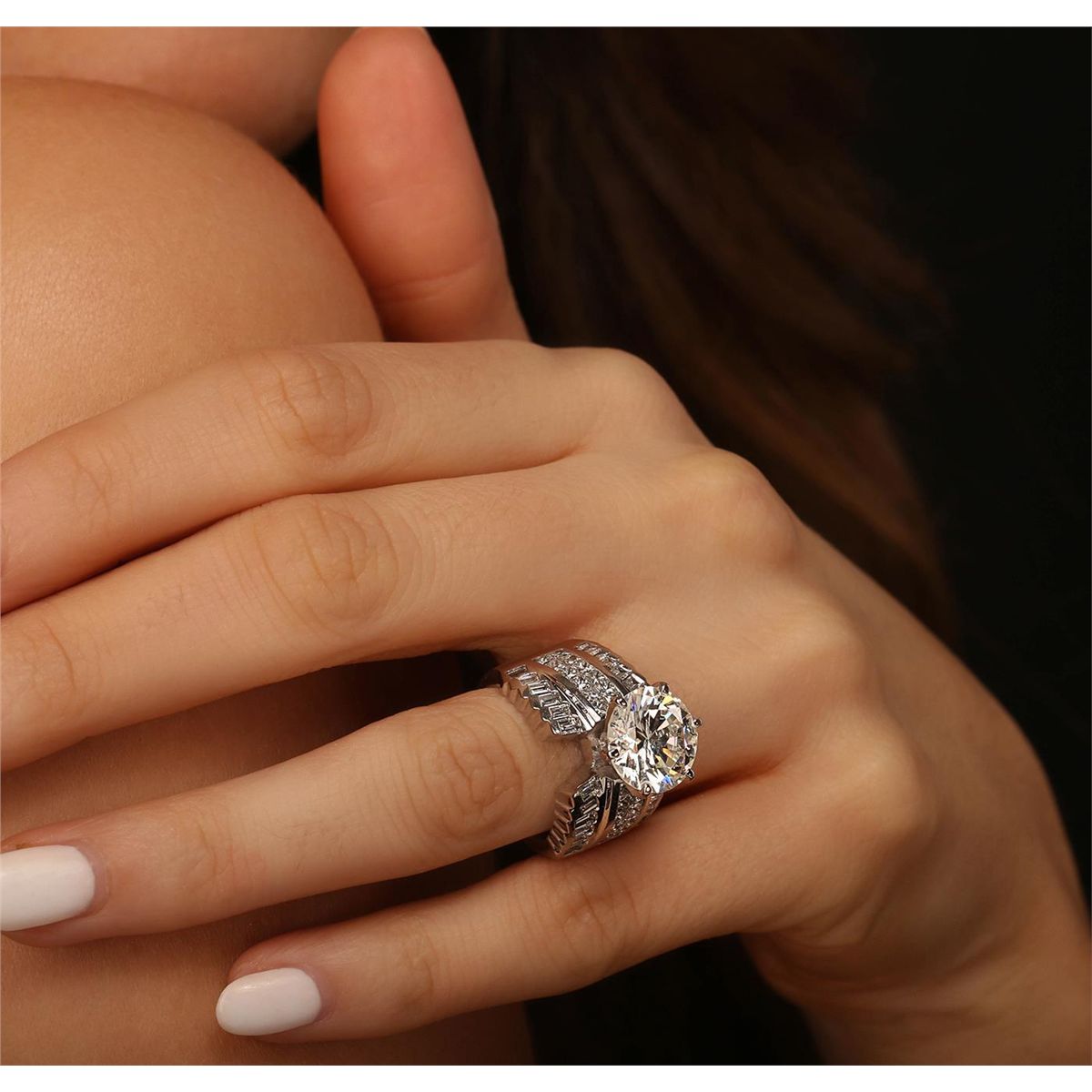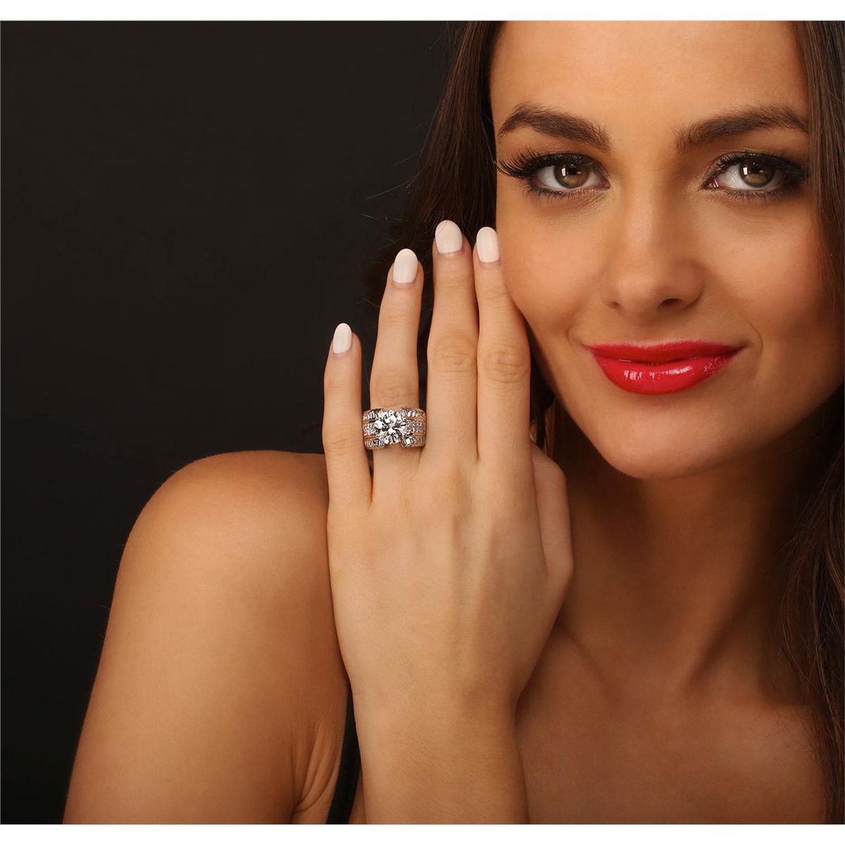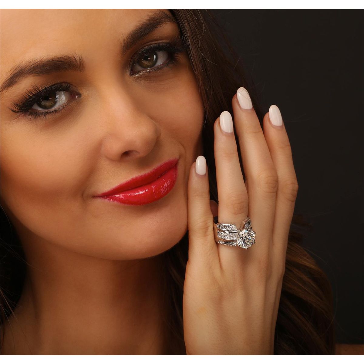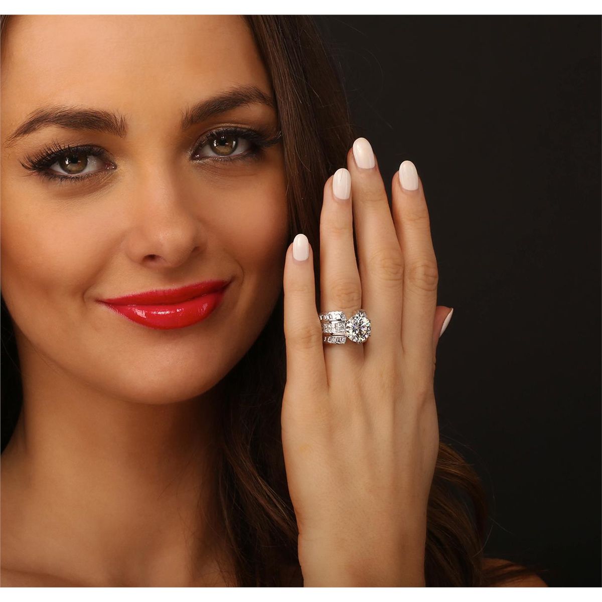 One electronically tested 18KT White Gold ladies cast & assembled diamond unity ring with a bright polish finish. Condition is new, good workmanship. The featured diamond is cathedral set and supported by elaborate diamond set shoulders. The ring is completed by an eight millimeter wide band. Identified with markings of "18K". Containing: One prong set round brilliant cut diamond, measuring 11.12 - 11.04 x 6.74mm exact weight 5.01ct with a faint flourescene. EGL Grading Report attached. Graded loose in the EGL Laboratory, Report #US 909608301D GP. Clarity VS-2 Color I Depth 60.8% Table 60.0% Pavil Depth 44.6%. Twenty-four channel set princess cut diamonds, measuring 2.20 x 2.10 x 1.58mm (depth est.) approximate total weight of 24 Stones = 1.55ct. Graded in the setting. Clarity SI-1 to I-1. Color G-I. Twenty-four channel set baguette cut diamonds, measuring from 2.50 x 1.80 x 1.26mm (depth est.) to 2.90 x 1.90 x 1.33mm (depth est.) approximate total weight of 24 Stones = 1.50ct. Graded in the setting. Clarity VS-1 to SI-1. Color G-I. Total Weight of Diamonds 8.06ct. Total Weight of Ring 19.54 grams. AIGAppraised at $484,575.00.