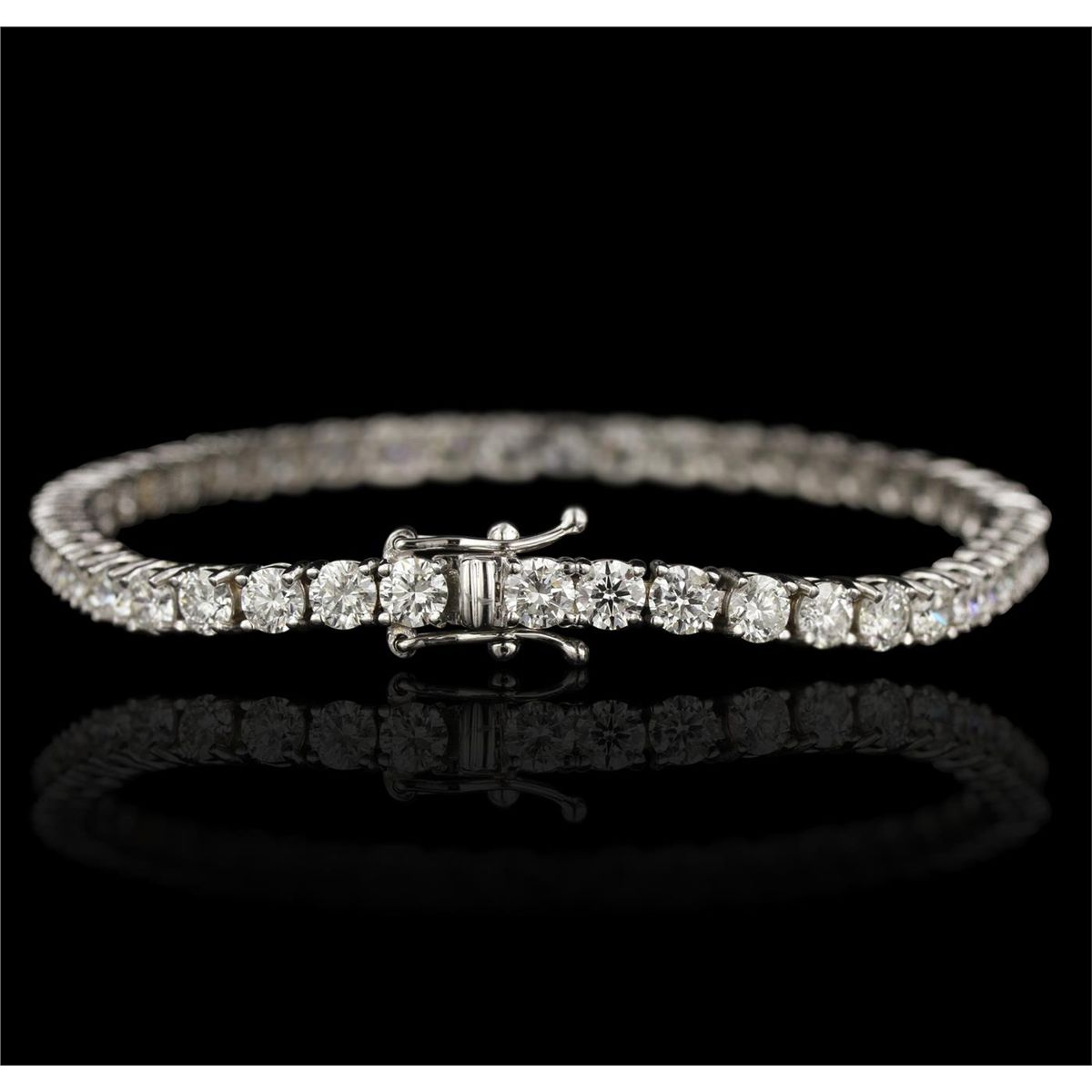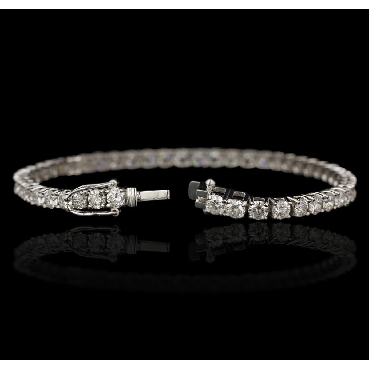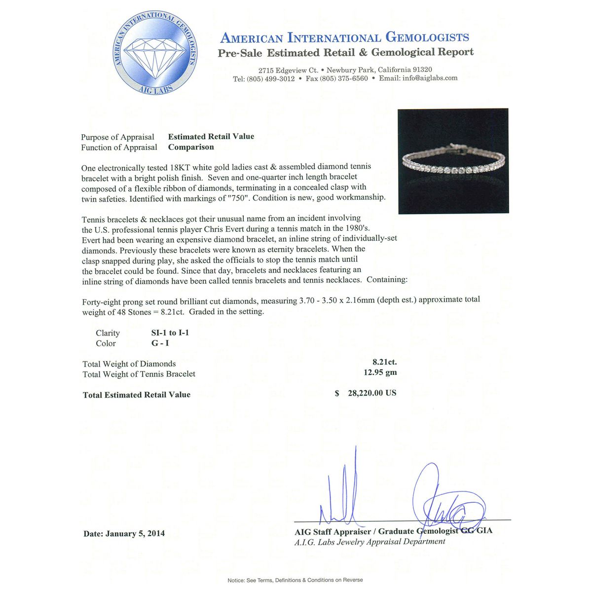 One electronically tested 18KT white gold ladies cast & assembled diamond tennis bracelet with a bright polish finish. Seven and one-quarter inch length bracelet composed of a flexible ribbon of diamonds, terminating in a concealed clasp with twin safeties. Identified with markings of "750". Condition is new, good workmanship. Tennis bracelets & necklaces got their unusual name from an incident involving the U.S. professional tennis player Chris Evert during a tennis match in the 1980's. Evert had been wearing an expensive diamond bracelet, an inline string of individually-set diamonds. Previously these bracelets were known as eternity bracelets. When the clasp snapped during play, she asked the officials to stop the tennis match until the bracelet could be found. Since that day, bracelets and necklaces featuring an inline string of diamonds have been called tennis bracelets and tennis necklaces. Containing: Forty-Eight prong set round brilliant cut diamonds, measuring 3.70 - 3.50 x 2.16mm (depth est.) approximate. Total Weight of 48 Stones = 8.21ct. Graded in the setting. Clarity: SI-1 to I-1 . Color: G - I. Total Weight of Diamonds 8.21ct. AIG Appraised at $28,220.00.
