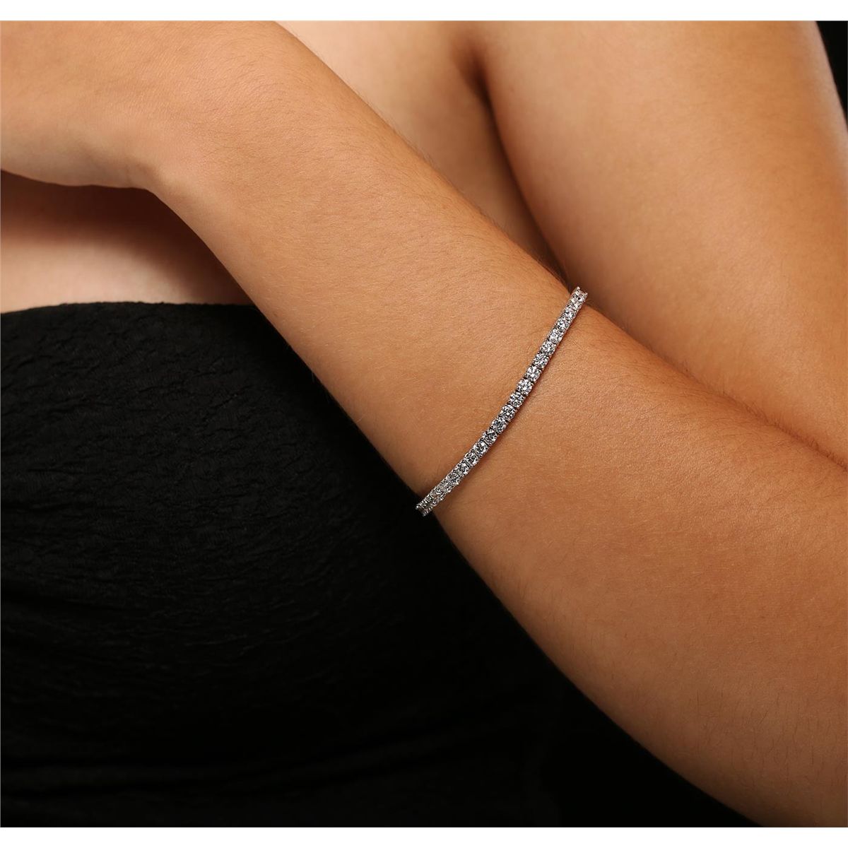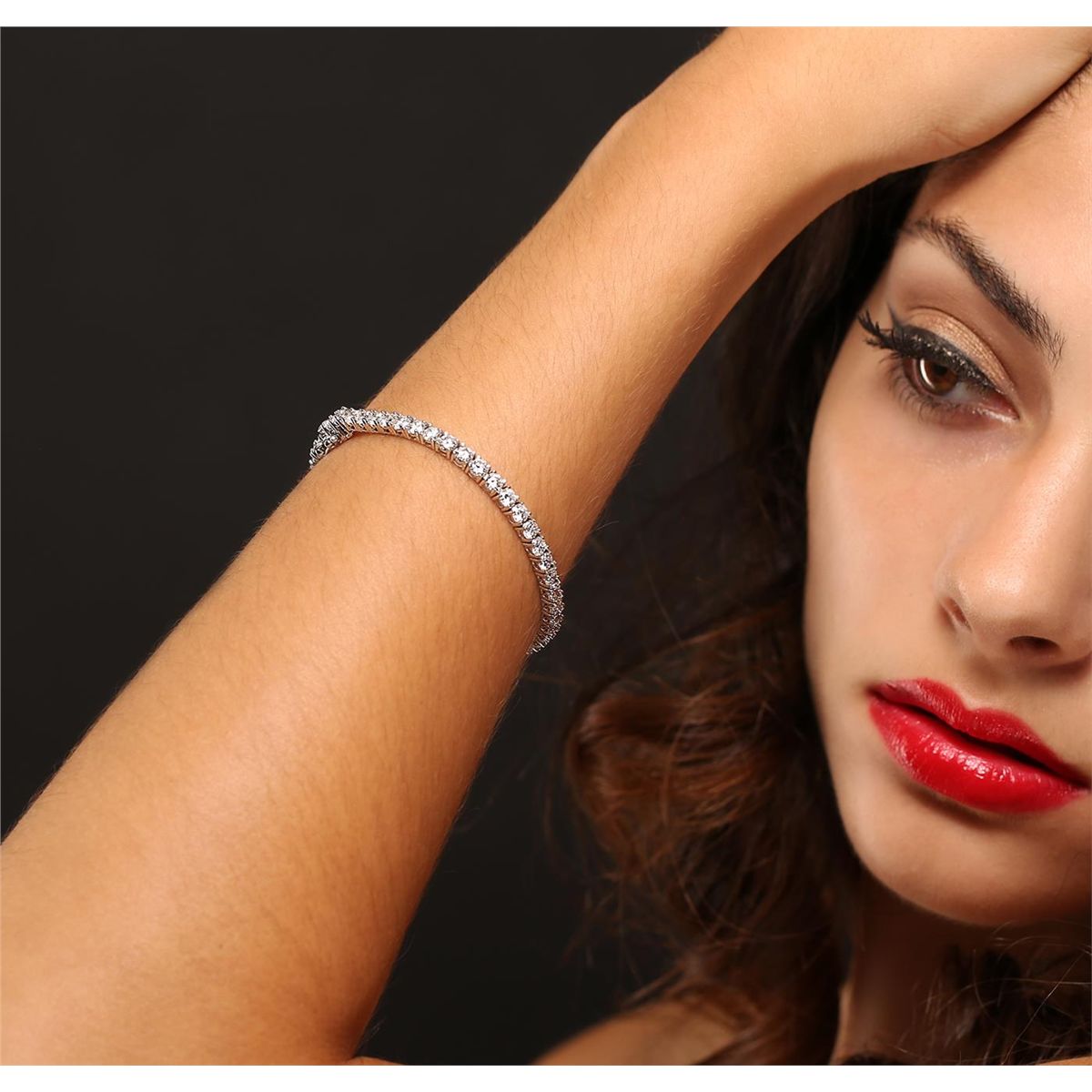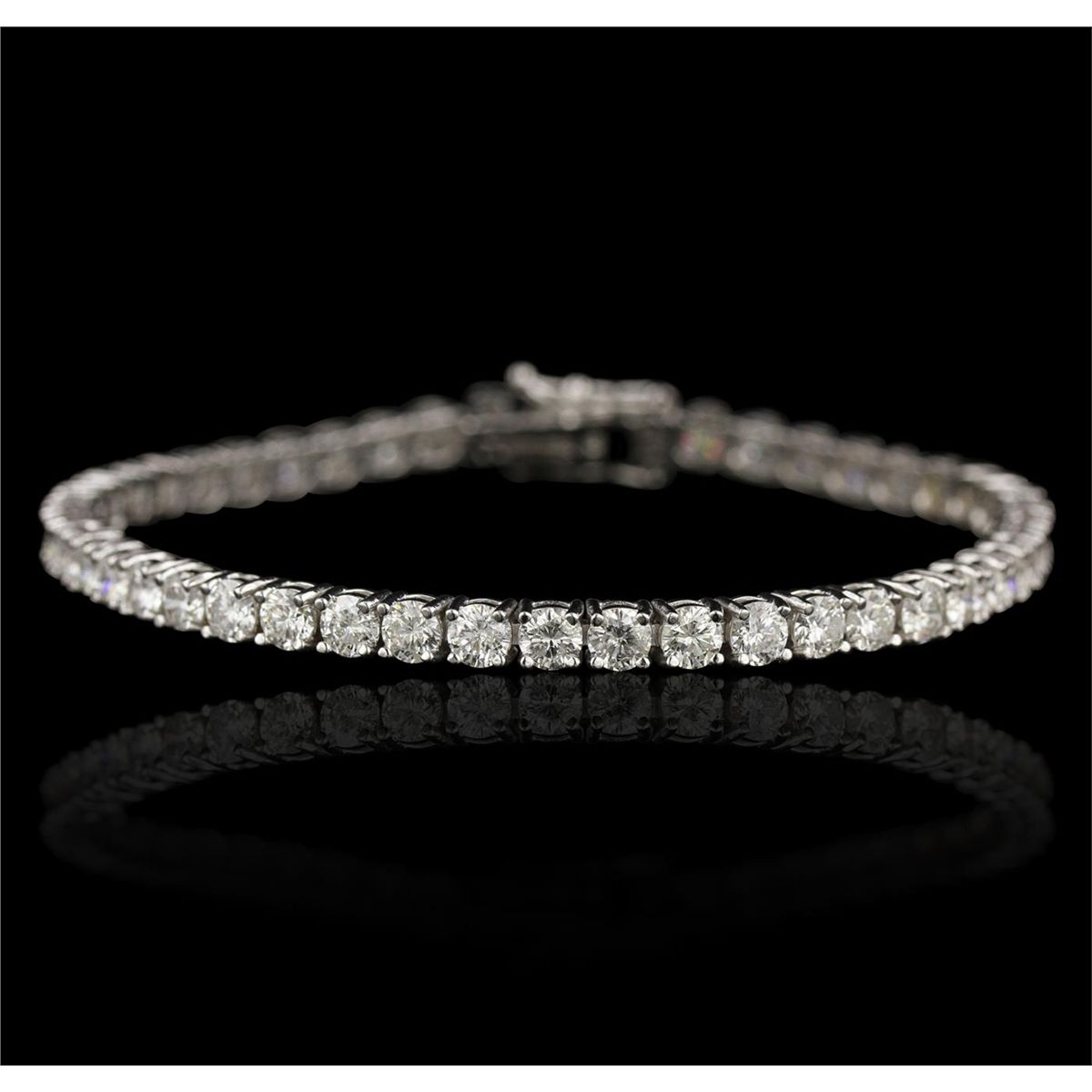 One electronically tested 18KT white gold ladies cast & assembled diamond tennis bracelet with a bright polish finish. Seven and one-quarter inch length bracelet composed of a flexible ribbon of diamonds, terminating in a concealed clasp with twin safeties. Identified with markings of "750". Condition is new, good workmanship. Tennis bracelets & necklaces got their unusual name from an incident involving the U.S. professional tennis player Chris Evert during a tennis match in the 1980's. Evert had been wearing an expensive diamond bracelet, an inline string of individually-set diamonds. Previously these bracelets were known as eternity bracelets. When the clasp snapped during play, she asked the officials to stop the tennis match until the bracelet could be found. Since that day, bracelets and necklaces featuring an inline string of diamonds have been called tennis bracelets and tennis necklaces. Containing: Forty-Eight prong set round brilliant cut diamonds, measuring 3.70 - 3.50 x 2.16mm (depth est.) approximate. Total Weight of 48 Stones = 8.21ct. Graded in the setting. Clarity: SI-1 to I-1 . Color: G - I. Total Weight of Diamonds 8.21ct. AIG Appraised at $28,220.00.