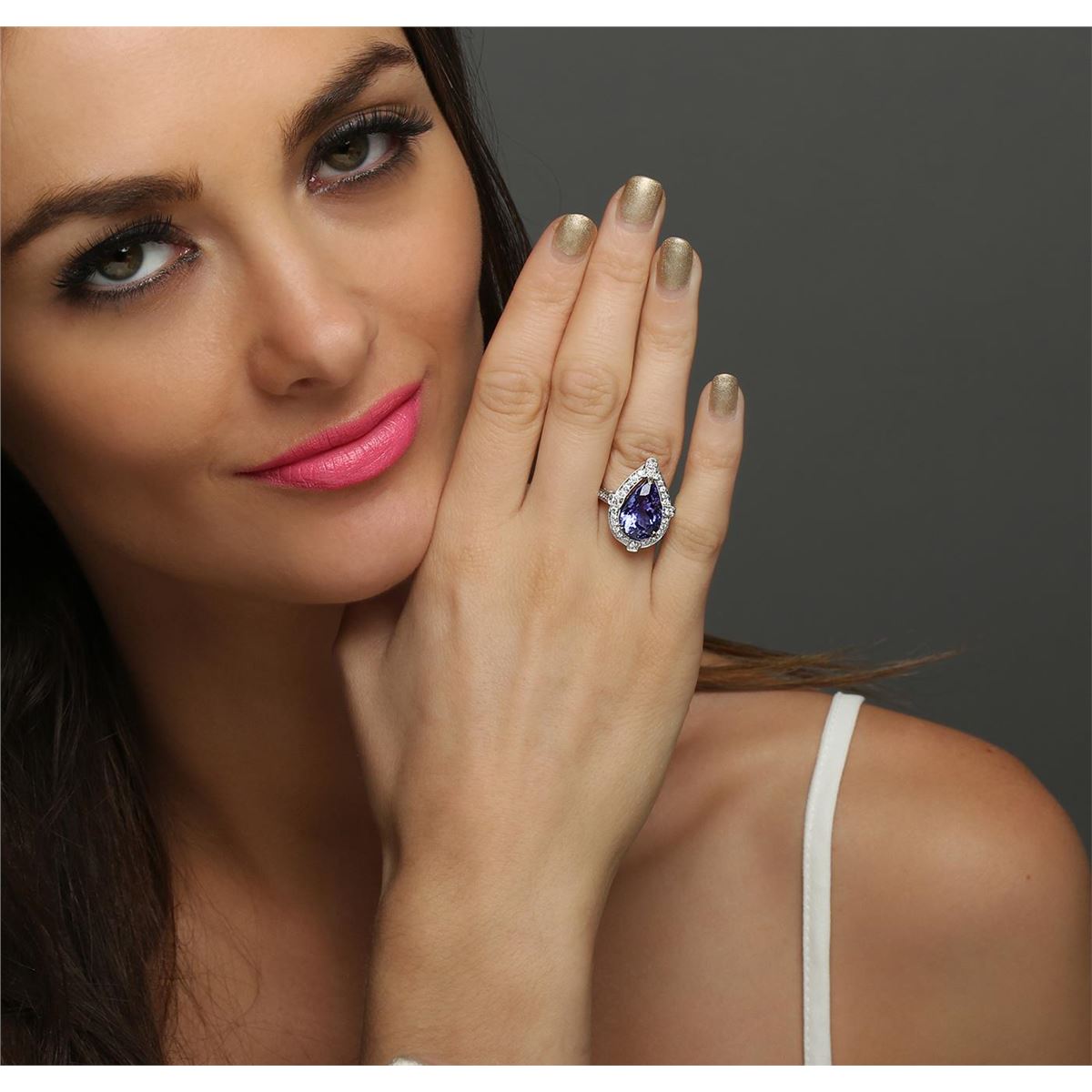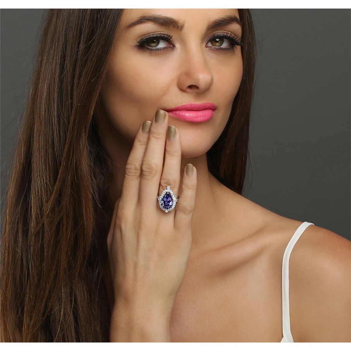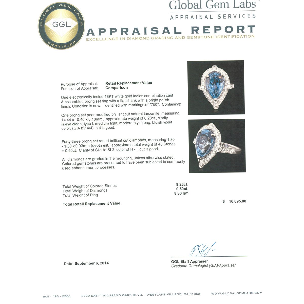 One electronically tested 18KT white gold ladies combination cast & assembled prong set ring with a flat shank with a bright polish finish. Identified with markings of "750". Condition is new. Containing: One prong set pear modified brilliant cut natural tanzanite, measuring 14.44 x 10.40 x 8.18mm, approximate weight of 8.23ct., clarity is eye clean, type I, medium light, moderately strong, bluish violet color, (GIA bV 4/4), cut is good. Forty-Three prong set round brilliant cut diamonds, measuring 1.80 - 1.30 x 0.93mm (depth est.) approximate total weight of 43 Stones = 0.50ct. Clarity: SI-1 to SI-2. Color: H - I, Cut is Good. All diamonds are graded in the mounting, unless otherwise stated, Colored gemstones are presumed to have been subjected to commonly used enhancement processes. Total Weight of Colored Stones 8.23ct. Total Weight of Diamonds 0.50ct. Total Weight of Ring 8.80 grams. GGL Appraised at $16,095.00.