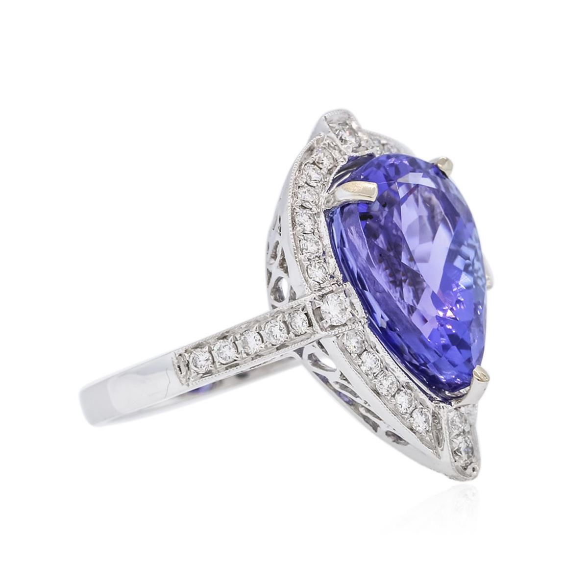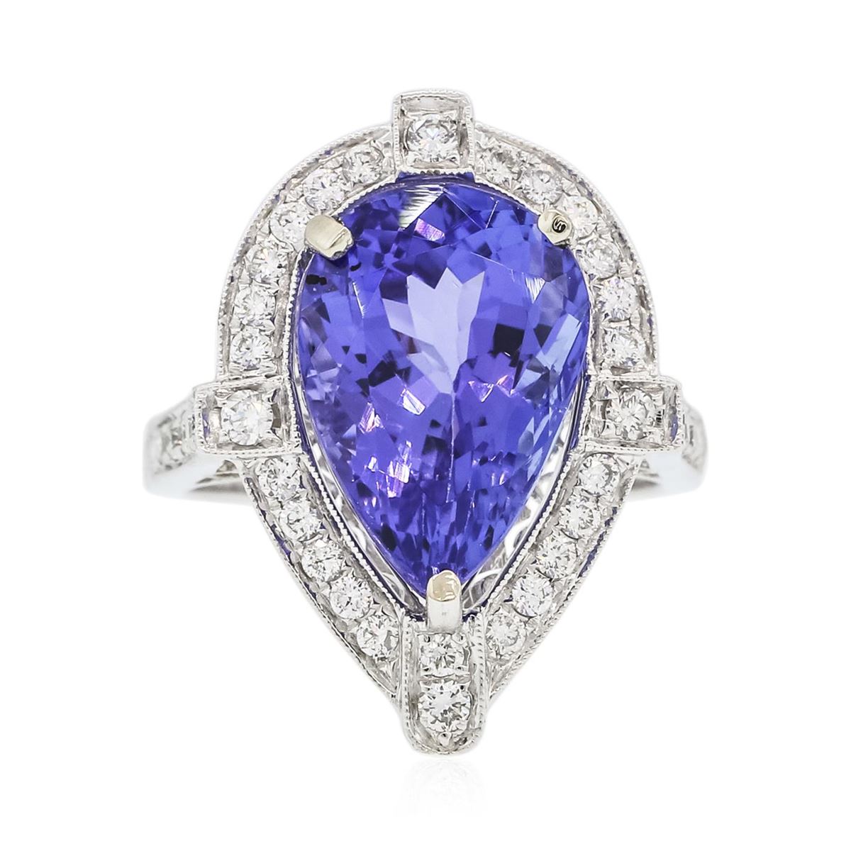 One electronically tested 18KT white gold ladies combination cast & assembled prong set ring with a flat shank with a bright polish finish. Identified with markings of "750". Condition is new. Containing: One prong set pear modified brilliant cut natural tanzanite, measuring 14.44 x 10.40 x 8.18mm, approximate weight of 8.23ct., clarity is eye clean, type I, medium light, moderately strong, bluish violet color, (GIA bV 4/4), cut is good. Forty-Three prong set round brilliant cut diamonds, measuring 1.80 - 1.30 x 0.93mm (depth est.) approximate total weight of 43 Stones = 0.50ct. Clarity: SI-1 to SI-2. Color: H - I, Cut is Good. All diamonds are graded in the mounting, unless otherwise stated, Colored gemstones are presumed to have been subjected to commonly used enhancement processes. Total Weight of Colored Stones 8.23ct. Total Weight of Diamonds 0.50ct. Total Weight of Ring 8.80 grams. GGL Appraised at $16,095.00.