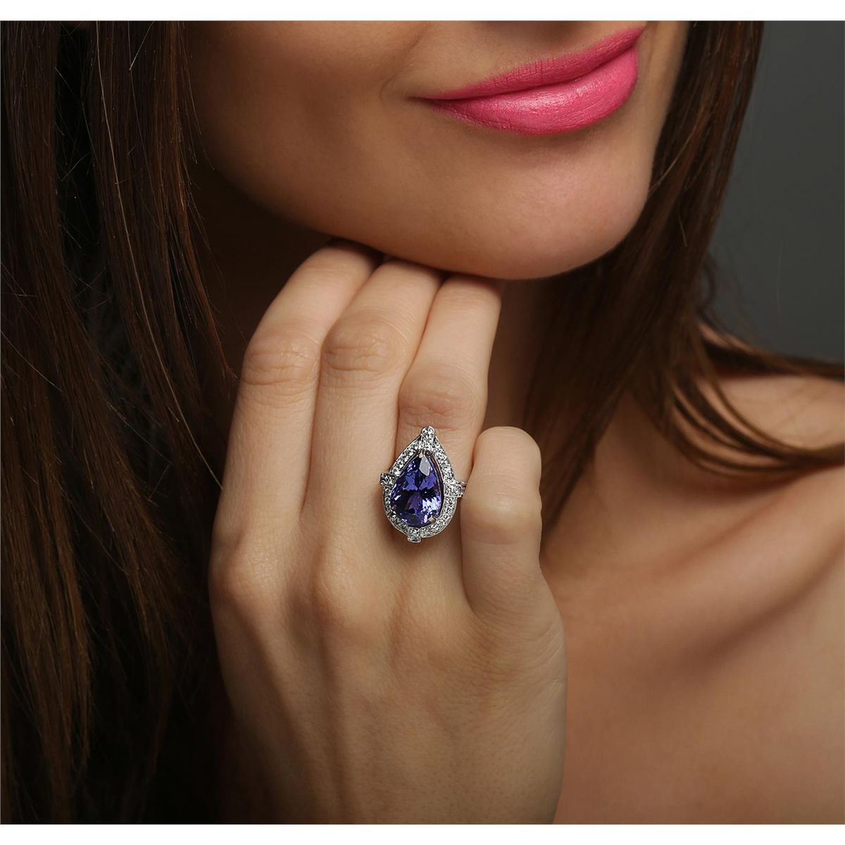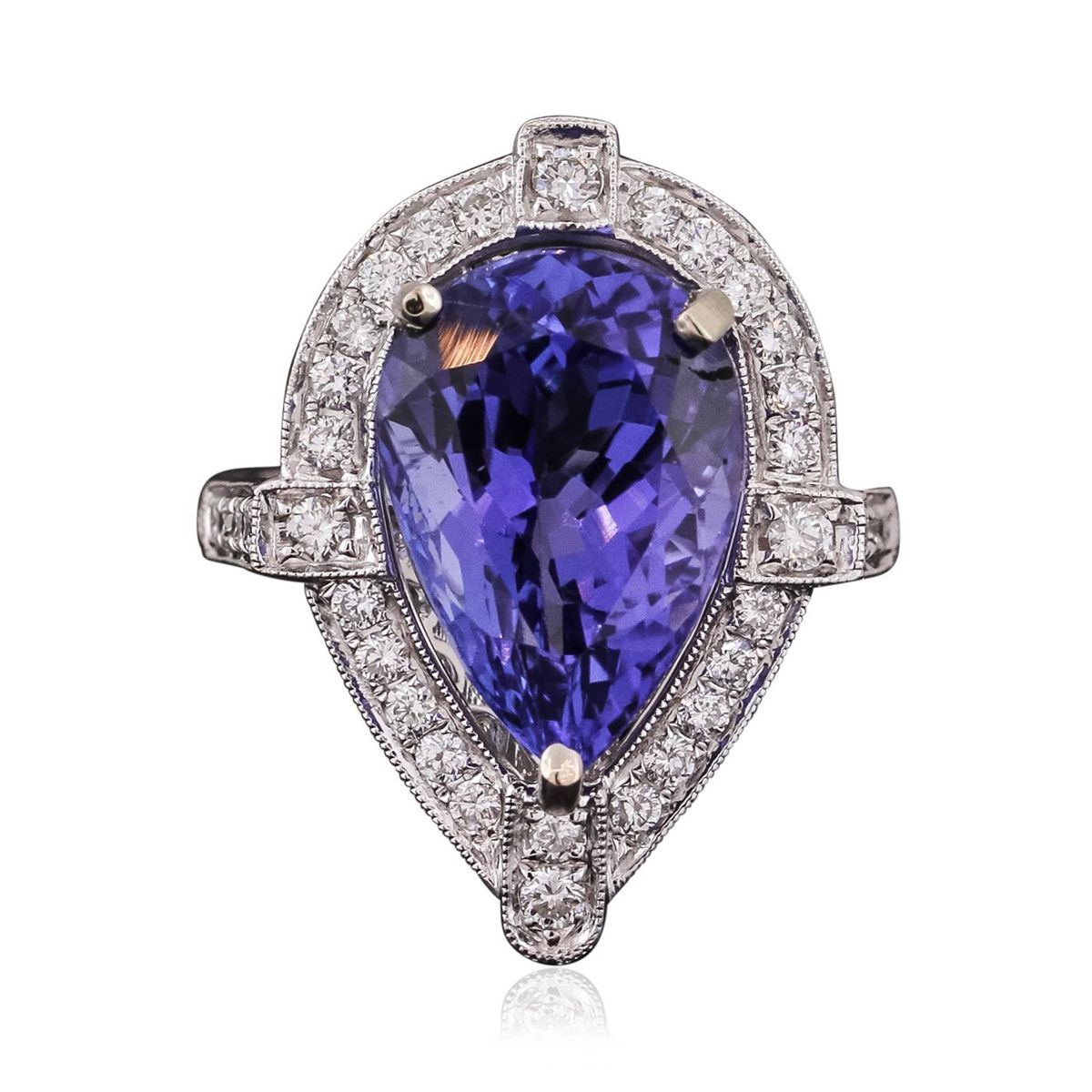 One electronically tested 18KT white gold ladies combination cast & assembled prong set ring with a flat shank with a bright polish finish. Identified with markings of "750". Condition is new. Containing: One prong set pear modified brilliant cut natural tanzanite, measuring 14.44 x 10.40 x 8.18mm, approximate weight of 8.23ct., clarity is eye clean, type I, medium light, moderately strong, bluish violet color, (GIA bV 4/4), cut is good. Forty-Three prong set round brilliant cut diamonds, measuring 1.80 - 1.30 x 0.93mm (depth est.) approximate total weight of 43 Stones = 0.50ct. Clarity: SI-1 to SI-2. Color: H - I, Cut is Good. All diamonds are graded in the mounting, unless otherwise stated, Colored gemstones are presumed to have been subjected to commonly used enhancement processes. Total Weight of Colored Stones 8.23ct. Total Weight of Diamonds 0.50ct. Total Weight of Ring 8.80 grams. GGL Appraised at $16,095.00.