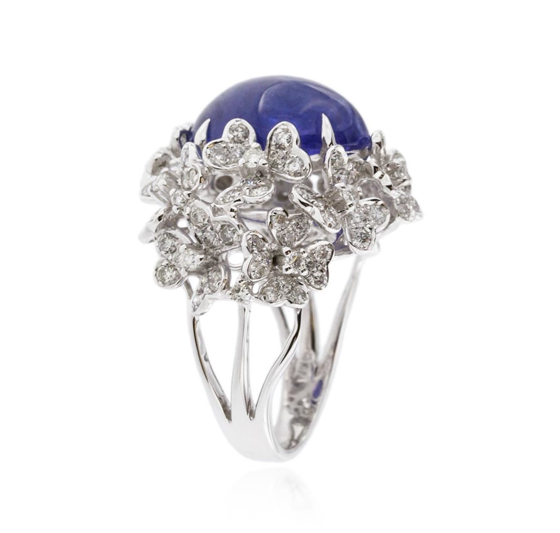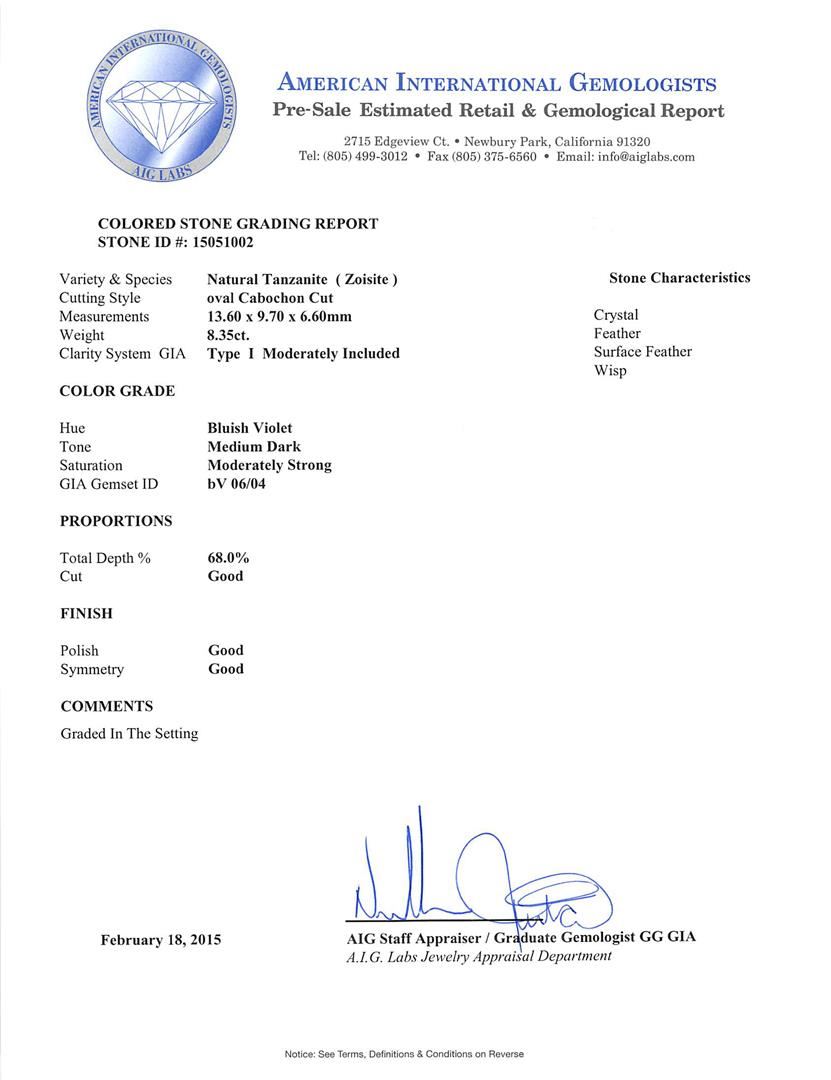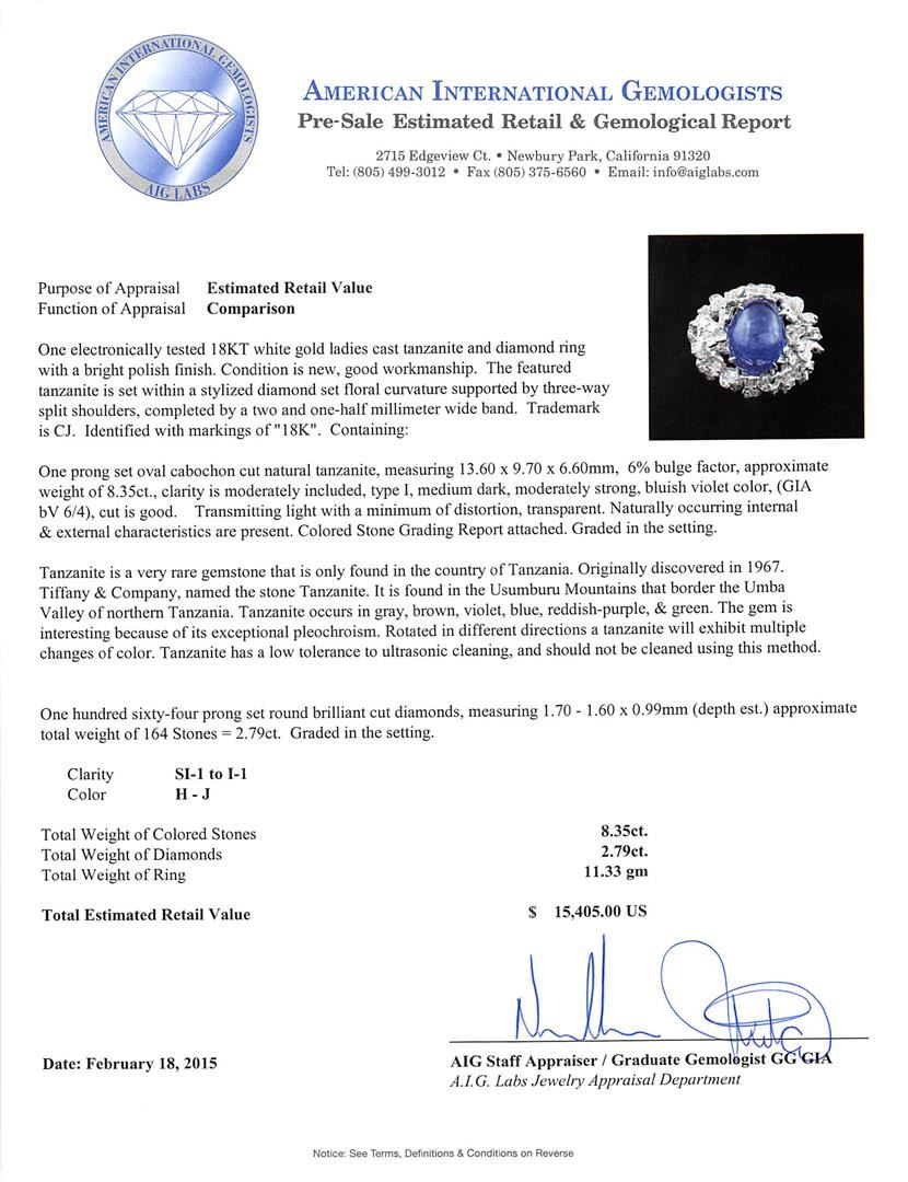 One electronically tested 18KT white gold ladies cast tanzanite and diamond ring with a bright polish finish. The featured tanzanite is set within a stylized diamond set floral curvature supported by three-way split shoulders, completed by a two and one-half millimeter wide band. Trademark is CJ. Identified with markings of "18K". Condition is new, good workmanship. Containing: One prong set oval cabochon cut natural tanzanite, measuring 13.60 x 9.70 x 6.60mm, 6% bulge factor, approximate weight of 8.35ct., clarity is moderately included, type I, medium dark, moderately strong, bluish violet color, (GIA bV 6/4), cut is good. Transmitting light with a minimum of distortion, transparent. Naturally occurring internal & external characteristics are present. Colored Stone Grading Report attached. Graded in the setting. Tanzanite is a very rare gemstone that is only found in the country of Tanzania. Originally discovered in 1967. Tiffany & Company, named the stone Tanzanite. It is found in the Usumburu Mountains that border the Umba Valley of northern Tanzania. Tanzanite occurs in gray, brown, violet, blue, reddish-purple, & green. The gem is interesting because of its exceptional pleochroism. Rotated in different directions a tanzanite will exhibit multiple changes of color. Tanzanite has a low tolerance to ultrasonic cleaning, and should not be cleaned using this method. One Hundred Sixty-Four prong set round brilliant cut diamonds, measuring 1.70 - 1.60 x 0.99mm (depth est.) approximate total weight of 164 Stones = 2.79ct. Graded in the setting. Clarity: SI-1 to I-1. Color: H - J. Total Weight of Colored Stones 8.35ct. Total Weight of Diamonds 2.79ct. Total Weight of Ring 11.33 grams. AIG Appraised at $15,405.00.