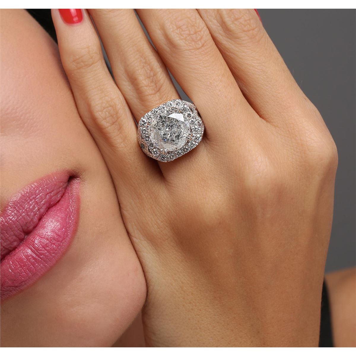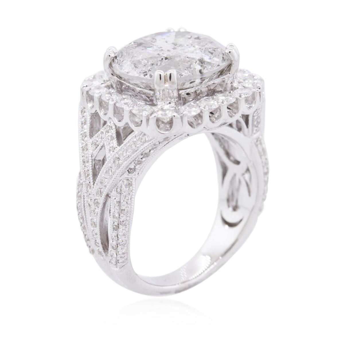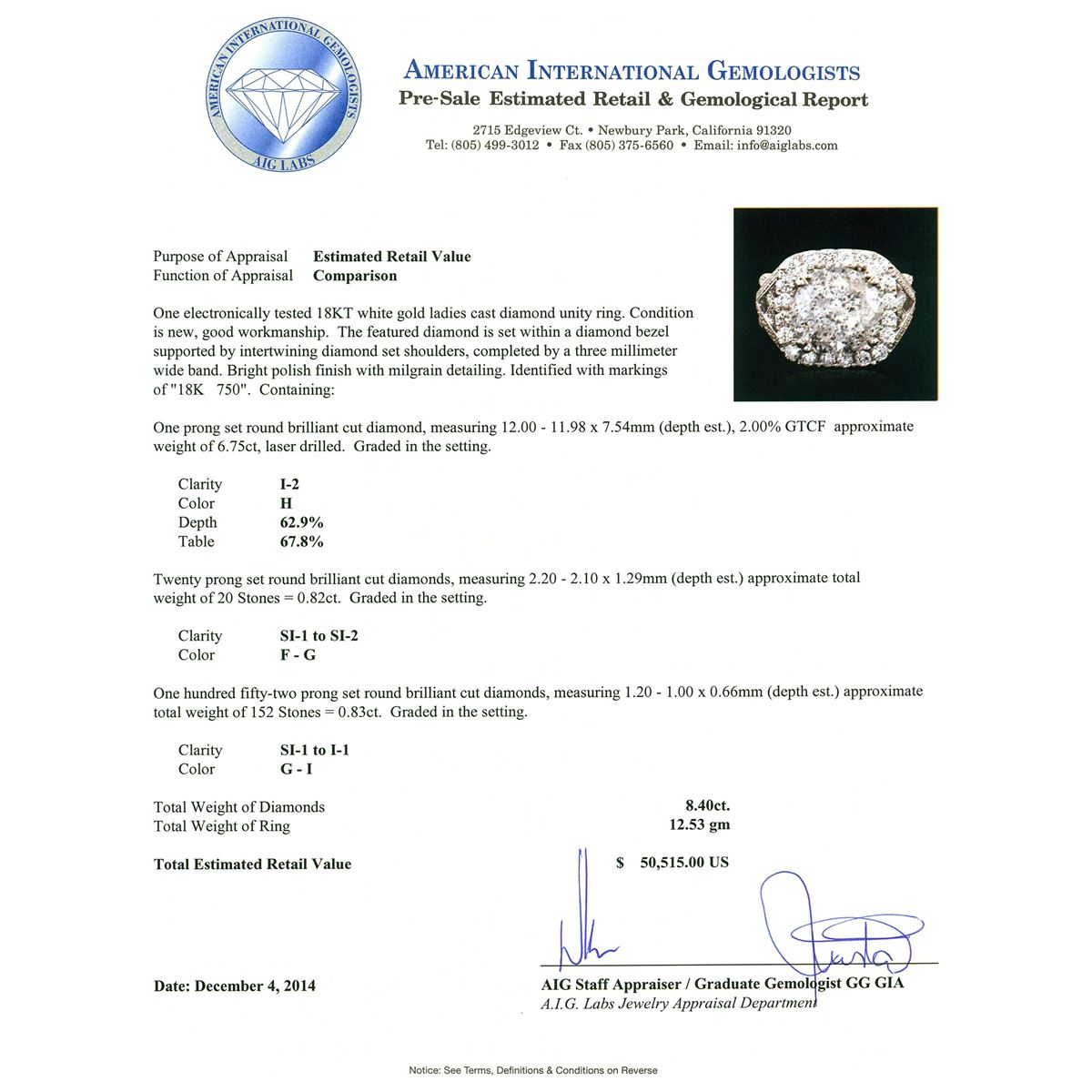 One electronically tested 18KT white gold ladies cast diamond unity ring. The featured diamond is set within a diamond bezel supported by intertwining diamond set shoulders, completed by a three millimeter wide band. Bright polish finish with milgrain detailing. Identified with markings of "18K 750". Condition is new, good workmanship. Containing: One prong set round brilliant cut diamond, measuring 12.00 - 11.98 x 7.54mm (depth est.), 2.00.%. GTCF approximate weight of 6.75ct, laser drilled. Graded in the setting. Clarity: I-2. Color: H. Depth 62.9%. Table 67.8%. Twenty prong set round brilliant cut diamonds, measuring 2.20 - 2.10 x 1.29mm (depth est.) approximate total weight of 20 Stones = 0.82ct. Graded in the setting. Clarity: SI-1 to SI-2. Color: F - G One Hundred Fifty-Two prong set round brilliant cut diamonds, measuring 1.20 - 1.00 x 0.66mm (depth est.) approximate total weight of 152 Stones = 0.83ct. Graded in the setting. Clarity: SI-1 to I-1. Color: G - I. Total Weight of Diamonds 8.40ct. Total Weight of Ring 12.53 grams. AIG Appraised at $50,515.00.