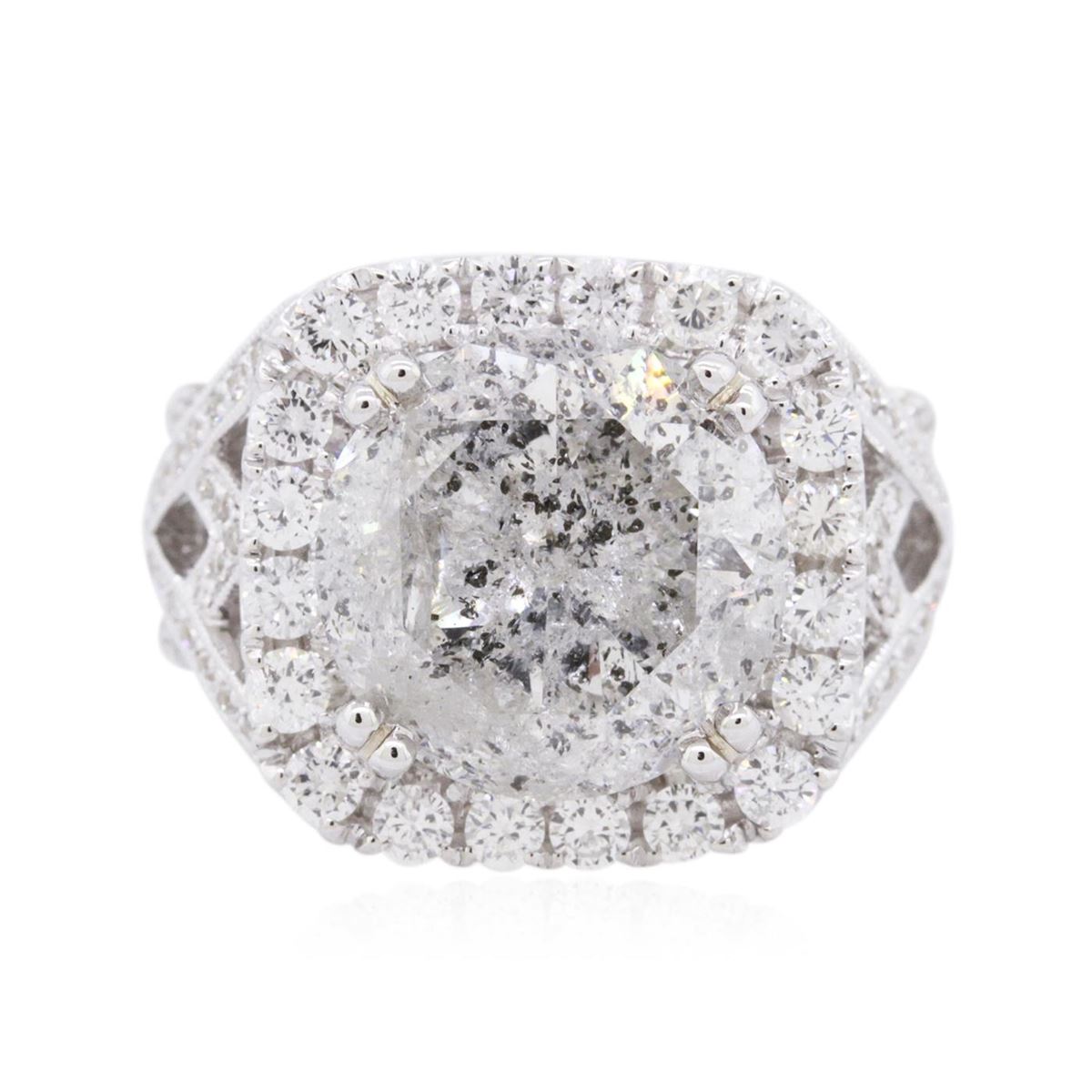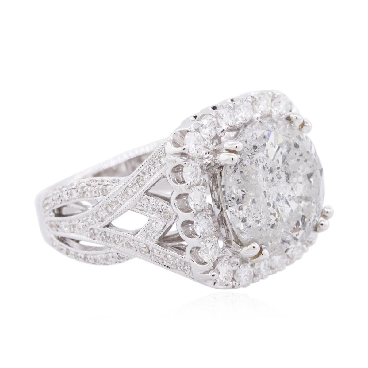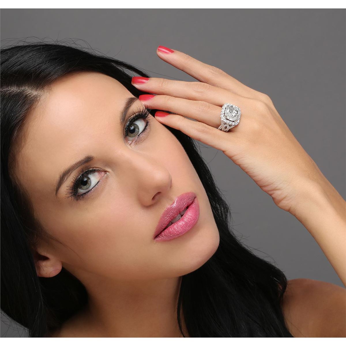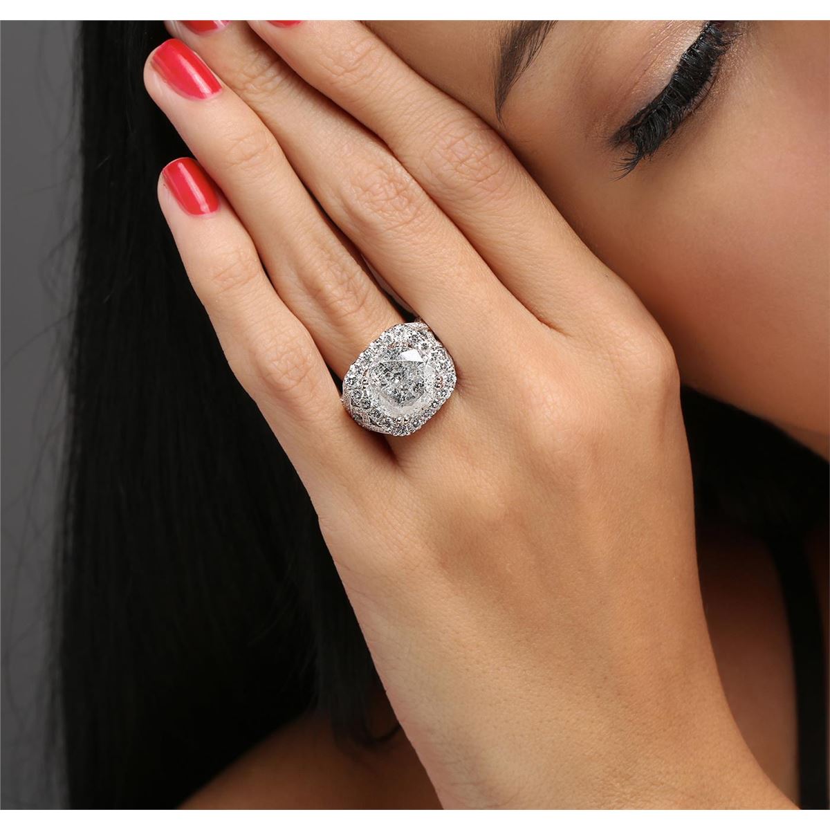One electronically tested 18KT white gold ladies cast diamond unity ring. The featured diamond is set within a diamond bezel supported by intertwining diamond set shoulders, completed by a three millimeter wide band. Bright polish finish with milgrain detailing. Identified with markings of "18K 750". Condition is new, good workmanship. Containing: One prong set round brilliant cut diamond, measuring 12.00 - 11.98 x 7.54mm (depth est.), 2.00.%. GTCF approximate weight of 6.75ct, laser drilled. Graded in the setting. Clarity: I-2. Color: H. Depth 62.9%. Table 67.8%. Twenty prong set round brilliant cut diamonds, measuring 2.20 - 2.10 x 1.29mm (depth est.) approximate total weight of 20 Stones = 0.82ct. Graded in the setting. Clarity: SI-1 to SI-2. Color: F - G One Hundred Fifty-Two prong set round brilliant cut diamonds, measuring 1.20 - 1.00 x 0.66mm (depth est.) approximate total weight of 152 Stones = 0.83ct. Graded in the setting. Clarity: SI-1 to I-1. Color: G - I. Total Weight of Diamonds 8.40ct. Total Weight of Ring 12.53 grams. AIG Appraised at $50,515.00.