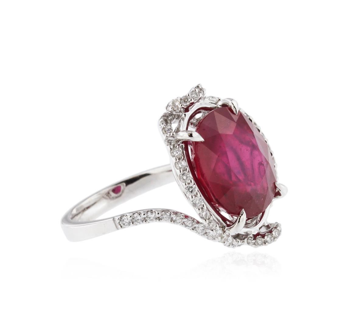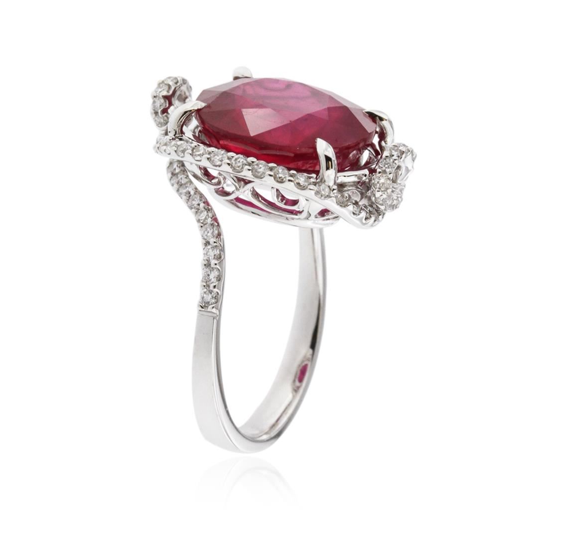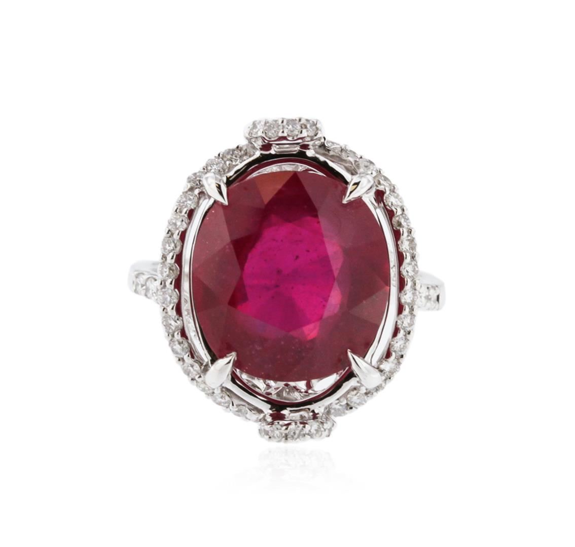 One electronically tested 18KT white gold ladies cast ruby and diamond ring with a bright polish finish. Identified with markings of "18K". Condition is new. Containing: One prong set oval oval modified brilliant cut natural ruby, measuring 12.50 x 11.80 x 6.80mm, approximate weight of 8.43ct., clarity is heavily included, type II, medium dark, moderately strong, strongly purplish red color, (GIA stpR 6/4), cut is good. Eighty prong set round brilliant cut diamonds, measuring 1.30 - 1.30 x 0.78mm (depth est.) approximate total weight of 80 Stones = 0.64ct. Clarity: I-1 to I-2. Color: I - J, Cut is Good. Colored gemstones are presumed to have been subjected to commonly used enhancement processes, All diamonds and colored gemstones are graded in the mounting, unless otherwise stated. Total Weight of Colored Stones 8.43ct. Total Weight of Diamonds 0.64ct. Total Weight of Ring 7.40 grams. GGL Appraised at $4,505.00.
