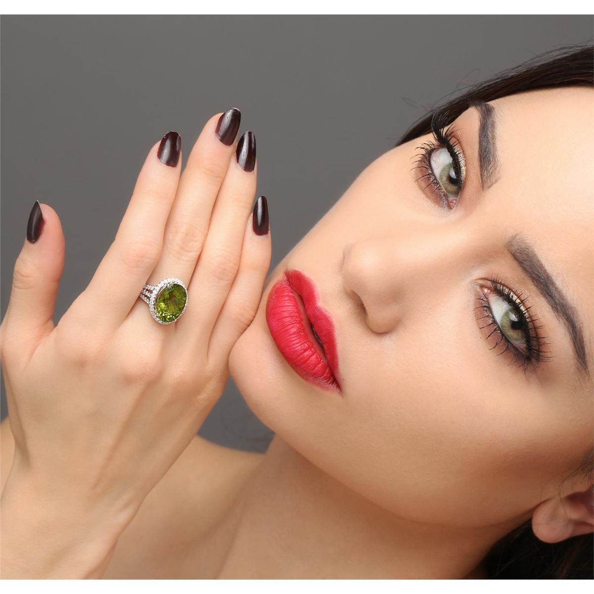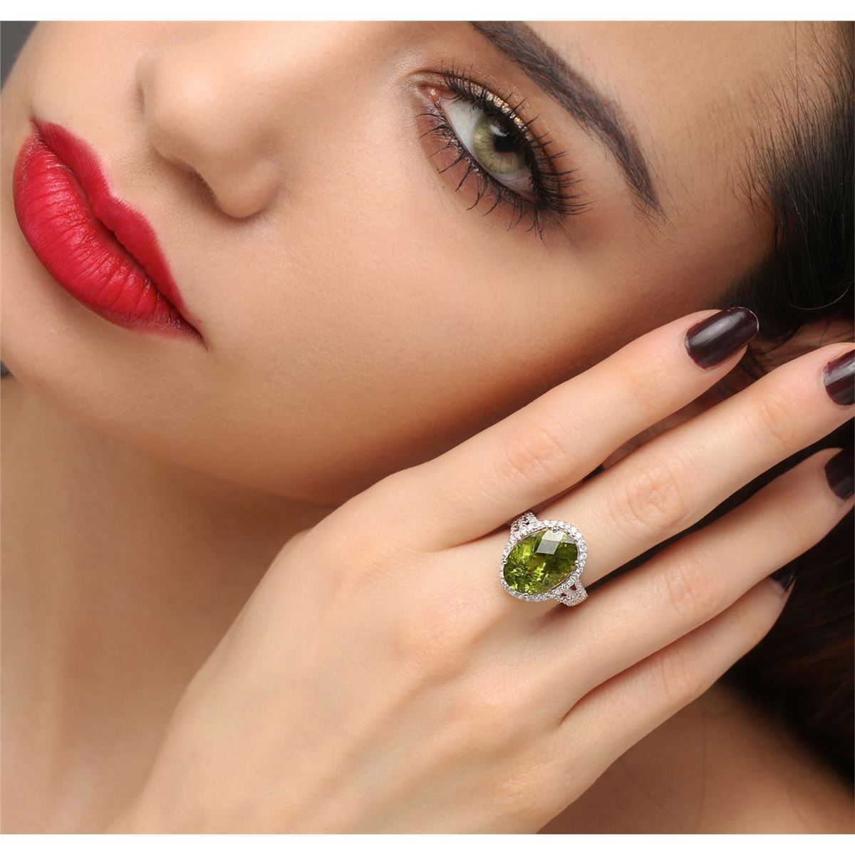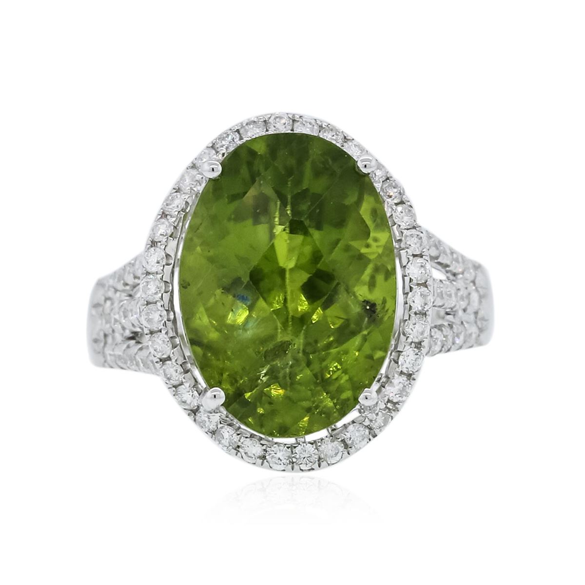 One ring featuring: 18KT white gold weighing 4.45 grams containing one peridot center stone with a total weight of 8.53ct and 69 round diamonds with a total weight of 0.57ct.